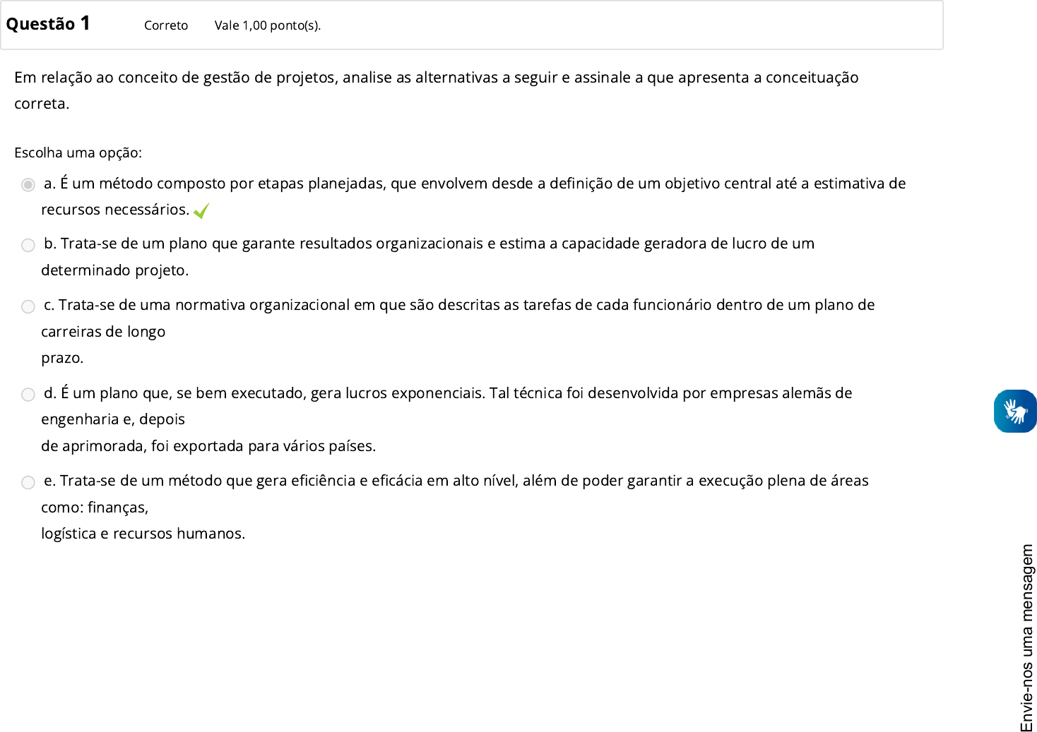 Questão 1 Correto Vale 1,00 ponto(s). Em relação ao conceito de gestão de projetos, analise as alternativas a seguir e assinale a que apresenta a conceituação correta. Escolha uma opção: a. É um método composto por etapas planejadas, que envolvem desde a de�nição de um objetivo central até a estimativa de recursos necessários. b. Trata-se de um plano que garante resultados organizacionais e estima a capacidade geradora de lucro de um determinado projeto. c. Trata-se de uma normativa organizacional em que são descritas as tarefas de cada funcionário dentro de um plano de carreiras de longo prazo. d. É um plano que, se bem executado, gera lucros exponenciais. Tal técnica foi desenvolvida por empresas alemãs de engenharia e, depois de aprimorada, foi exportada para vários países. e. Trata-se de um método que gera e�ciência e e�cácia em alto nível, além de poder garantir a execução plena de áreas como: �nanças, logística e recursos humanos. En vi e- no s um a m en sa ge m Questão 2 Correto Vale 1,00 ponto(s). Todo projeto é suscetível a falhas, mas com o acúmulo de conhecimentos e experiências de gestores especializados, algumas falhas podem ser observadas como mais frequentes. A esse respeito, indique a alternativa que apresenta ao menos uma dessas falhas. Escolha uma opção: a. Estimar, dentro do orçamento de um projeto, um mínimo de recursos �nanceiros, a �m de fazer o máximo possível. b. Falhar em um projeto devido ao lançamento de um produto inovador da concorrência. c. Não levar em consideração a crise �nanceira de um país relativamente importante para os negócios da empresa executora do projeto. d. Estimar os lucros do projeto e contar que esses valores farão parte dos relatórios da empresa, sem mesmo o projeto ter sido �nalizado. e. Não levar em consideração os custos de atualização de softwares usados para o controle dos projetos. En vi e- no s um a m en sa ge m Questão 3 Correto Vale 1,00 ponto(s). Em gestão de projetos, há a fase de integração, a qual é constituída por alguns elementos necessários ao controle e à organização. Sob essa ótica, dentre as alternativas a seguir, assinale a que contém elementos da integração. Escolha uma opção: a. Termo de contabilidade e plano de metas. b. Termo de assertividade e plano de lucros. c. Termo de conduta e plano de expansão. d. Termo de metas e plano de remuneração variável. e. Termo de abertura e plano de gerenciamento. En vi e- no s um a m en sa ge m Questão 4 Correto Vale 1,00 ponto(s). Em relação ao conceito de gestão de projetos e a sua importância dentro de uma empresa, indique a alternativa correta. Escolha uma opção: a. Dentro do conceito de gestão de projetos, há a descrição de etapas, que apresenta a um gestor as variáveis de controle. b. Dentro do conceito de gestão de projetos, a logística interna se destaca por ser responsável pela maior parte dos custos. c. A importância da gestão de projeto está na capacidade de gerar caixa para a empresa. Assim, o departamento contábil assume a responsabilidade em relação aos resultados. d. Dentro do conceito de gestão de projetos, há a descrição do ambiente político, principalmente em relação ao apoio a partidos e ao �nanciamento de campanhas. e. A importância da gestão de projetos está nos relatórios emitidos para �ns de declaração de imposto de renda pessoa jurídica. En vi e- no s um a m en sa ge m Questão 5 Correto Vale 1,00 ponto(s). Quanto à fase de integração de um projeto, aponte a alternativa em que há dois elementos necessários para o seu resultado positivo. Escolha uma opção: a. Comunicação e engajamento. b. Motivação e lucratividade. c. Relacionamento interpessoal e logística. d. Estratégia e comunicação de marketing. e. Controle de qualidade e orçamento. Questão 6 Correto Vale 1,00 ponto(s). Marque a alternativa que apresenta a conclusão da seguinte alternativa: A de�nição de um cronograma, dentro de um gerenciamento de projetos, é uma forma que o gestor tem, diretamente, de _____________________________________ Escolha uma opção: a. elevar os ganhos �nanceiros e a lucratividade. b. aumentar a e�ciência contábil e evitar impostos indevidos. c. aumentar a competitividade por meio da inovação radical. d. suprir demandas de clientes que exigem menor prazo para entrega. e. controlar visualmente as etapas de um projeto. E nv ie -n os u m a m en sa ge m Questão 7 Incorreto Vale 1,00 ponto(s). Os métodos de cronogramas podem variar de acordo com as opções do gestor, no entanto, alguns aspectos podem ser comuns entre tais. Assinale a alternativa que apresenta corretamente quais podem ser esses aspectos. Escolha uma opção: a. Cumprimento dos horários determinados e atendimento às demandas contábeis. b. Cumprimento do planejado e atendimento aos valores orçados. c. Cumprimento das primeiras etapas e atendimento à etapa �nal d. Cumprimento dos honorários do gestor de projetos e atendimento ao sindicato patronal. e. Cumprimento da meta de lucro e atendimento aos clientes. Questão 8 Correto Vale 1,00 ponto(s). Uma das tarefas dentro do preenchimento de um cronograma é o detalhamento, o qual pode ser feito usando o critério do acrônimo META. Assinale a alternativa que apresenta quais são essas palavras. Escolha uma opção: a. Mensurável, especí�co, temporal e atingível. b. Meritocracia, estimativa, turnover e alinhamento. c. Maestria, especialidade, titulação e acreditação. d. Metadados, estratégia, tática e administração. e. Manipulado, estimado, temporal e assertivo. En vi e- no s um a m en sa ge m Questão 9 Correto Vale 1,00 ponto(s). Dentro do gerenciamento de um projeto, a etapa de análise de custos pode ser considerada decisiva para o alcance do sucesso. Nesse sentido, marque a alternativa que justi�ca essa a�rmativa. Escolha uma opção: a. Ela determina, por estimativa, o quanto ser