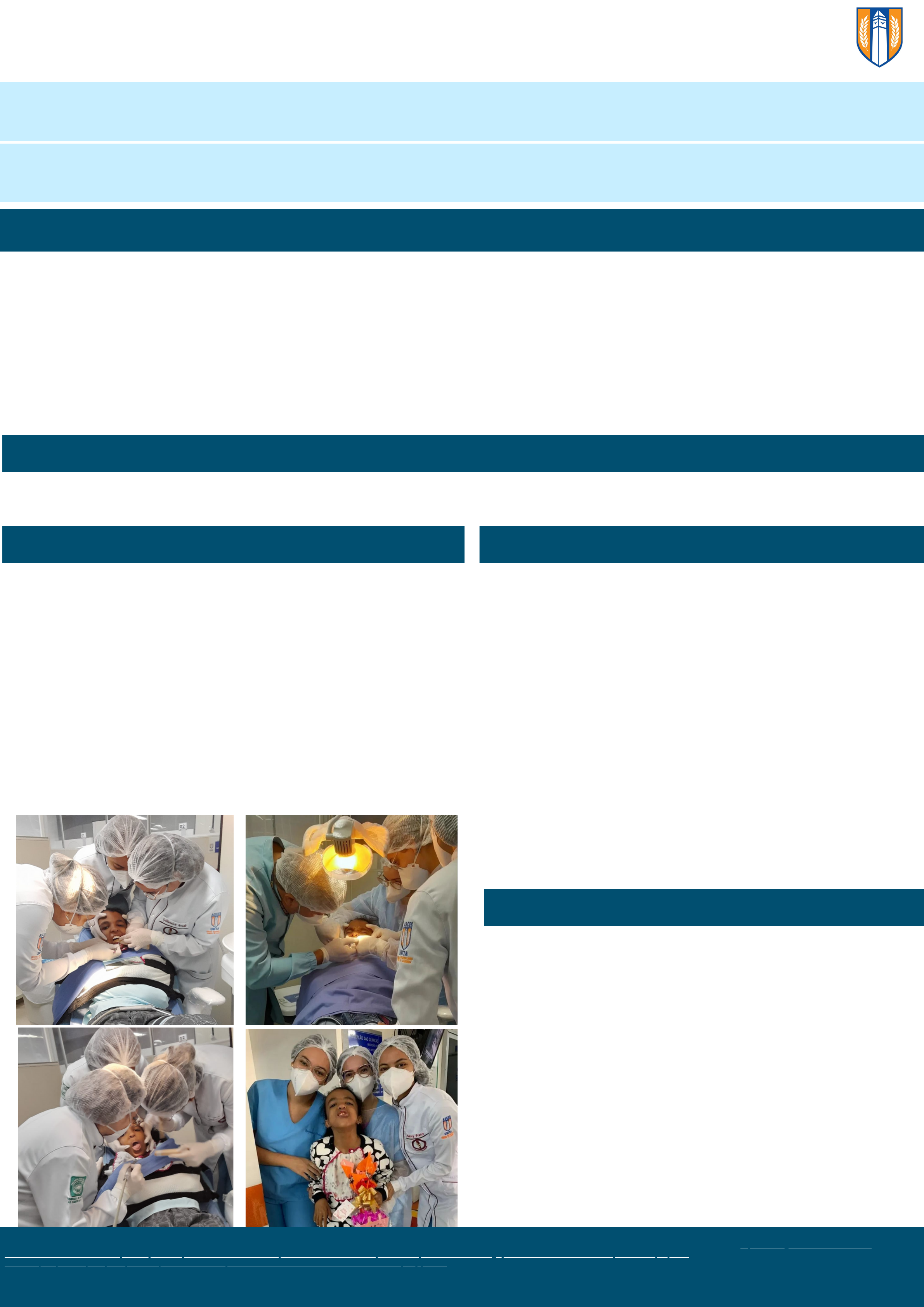 AUTISMO E AS FASES DO ATENDIMENTO ODONTOLÓGICO: RELATO DE CASO AUDREY MARIA FREIRE RODRIGUES; GUILHERMINIA S. DE SOUZA ARRUDA; RAYANNE VIEIRA LEITE. Acadêmicas do 9º período de odontologia da Asces Unita. OBJETIVO RELATO DE CASO DISCUSSÃO CONCLUSÃO Apresentar através de um relato de caso a experiência vivenciada no CEO de Pacientes com Necessidades Especiais da ASCES- UNITA, sob orientação do Preceptor Dr. André Ricardo Carvalho de Araújo. Paciente Y.V.D.S.Q, 12 anos, sexo feminino, procurou o CEO de PNE da ASCES-UNITA encaminhada da Secretária de Saúde de Belo Jardim para atendimento especializado. Durante anamnese a responsável relatou que a mesma possui deficiência intelectual, transtorno do especto autista e transtorno opositor desafiador. Ao exame físico foi constatado alto índice de cárie, presença de raiz residual e amelogênese. Desde o primeiro contato a paciente não demonstrou ser cooperativa, foi realizado o plano de tratamento começando pelos procedimentos de baixa/média complexidade até os de alta, como a exodontia, em todas as sessões a paciente foi contida. O tratamento odontológico em pacientes autistas, muitas vezes, é considerado desafiador para os pais e para os profissionais. Dificuldade de abordagem, comportamento repetitivo e limitado e recusa para responder aos comandos são alguns dos desafios encontrados (SANTA’ANNA, 2017). Crianças com TEA podem possuir uma má higiene bucal, com alguns agravos, como gengivite por exemplo, quando comparadas com indivíduos não portadores do transtorno (LOPES et al., 2022). O paciente autista possui dificuldade de socialização e comunicação, por isso conquistá-la é fundamental. Na maioria dos casos, o dentista não consegue realizar o atendimento na primeira consulta; faz-se necessário buscar diferentes formas de abordagem para que o objetivo seja atingido (MARRA, 2007). REFERÊNCIAS LOPES, Cristina da Silveira et al. Atendimento odontológico à criança com transtorno do espectro autista - Revisão de literatura. Research, Society And Development, [S.L.], v. 11, n. 7, 14 maio 2022. Research, Society and Development. http://dx.doi.org/10.33448/rsd-v11i7.29497 Marra PS. Dificuldades encontradas pelos responsáveis para manter a saúde bucal em portadores de necessidades especiais. Tese [Mestrado em Odontologia] - Universidade do Grande Rio. Duque de Caxias, RJ, 2007. Sant’Anna, LFC; Barbosa, CCN; Brum, SC. Atenção à saúde bucal do paciente autista. Revista Pró-UniverSUS. 2017 Jan./Jun.; 08 (1): 67-74. Onol S, Kirzioglo Z. Evaluation of oral health status and influential factors in children with autism. Niger J Clin Pract. 2018 apr.;21(4): 429-35 Santana LM, Leite GJF, Martins MA, Palma ABO, Oliveira CC. Pacientes autistas: manobras e técnicas para condicionamento no atendimento odontológico. Revista Extensão & Sociedade. 2020; 11(2): 155-65. Coimbra BS, Soares DCL, Silva JA, Varejão LC. Abordagem odontológica a pacientes com transtorno do espectro autista (TEA): uma revisão da literatura. Braz J Develop. 2020 dec.; 6(12): 94293-306. Conclui-se que, apesar dos desafios, um tratamento odontológico de qualidade pode ser realizado com o uso de abordagens personalizadas e, para isso, é necessário que o Cirurgião-Dentista conheça esses recursos e domine as técnicas. Torna-se imprescrindível conhecer mais sobre as necessidades especiais para melhor atender esse público, já que compreender esse transtorno ajuda a evitar situações que poderiam causar danos físicos e psicológicos para os pacientes e familiares, durante o tratamento odontológico. Dividir o tratamento em várias sessões fez com que a paciente se sentisse segura e confortável com a rotina criada no ambiente clínico, obtendo-se sucesso nos procedimentos realizados. INTRODUÇÃO Pacientes que apresentam alguma dificuldade temporária ou permanente, intelectual, física ou comportamental são denominados de pacientes especiais, essas pessoas necessitam de cuidados individualizados sendo acompanhados por uma equipe multidisciplinar(SANTANA et al.,2020). Crianças com TEA necessitam de uma atenção e cuidados especiais, geralmente elas dependem de seu responsável para realizar atividades cotidianas. Por causa da falta de cooperação da criança, há uma dificuldade de realizar a escovação dentária sendo executada de forma breve e ineficaz (COIMBRA et al., 2020). A associação da má higiene bucal com a preferência por alimentos cariogênicos leva os pacientes TEA a apresentarem níveis elevados de cárie e doença periodontal necessitando de tratamentos restauradores e extrações precoces(ONOL et al., 2018). http://dx.doi.org/10.33448/rsd-v11i7.29497