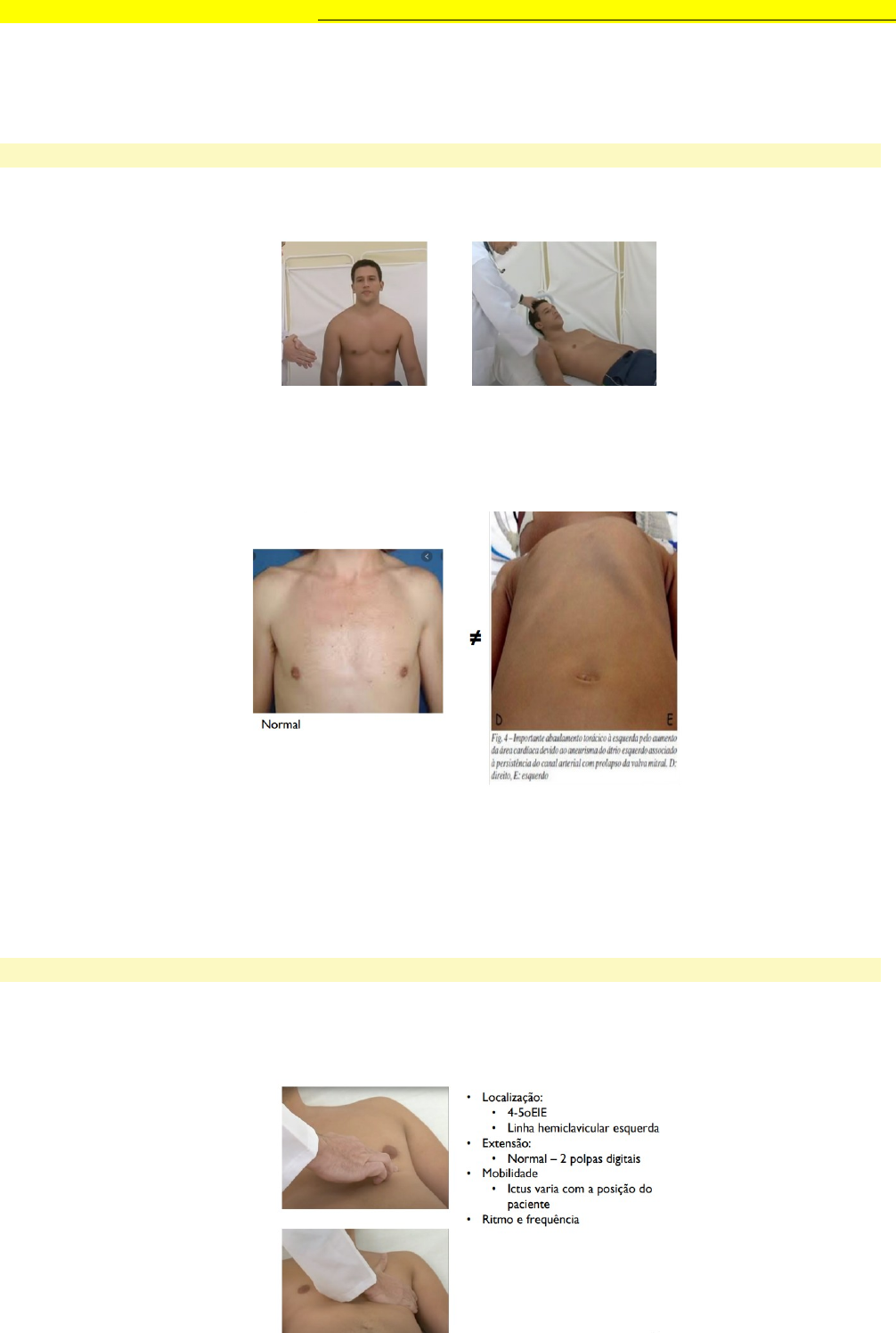 EXAME FÍSICO CARDDIOLÓGICO___________________________________________________________ Componentes: 1. Inspeção 1. Palpação 1. Ausculta INSPEÇÃO 1. Examinador à direita do paciente/leito 1. Preferência para o paciente em decúbito dorsal ou sentado 1. Para avaliar turgência jugular: cabeça elevada em 45º 1. Avaliar: 3. Sinais de boa perfusão periférica (membros) 3. Região cervical - presença de dilatação jugular 3. Formato normal da caixa torácica 3. Ventilação - principalmente na inspiração: simetrias, abaulamentos, retrações (Abaulamento) 3. Batimentos 4. Pulsação epigástrica: pode indicar hipertrofia de VD ou aneurisma da aorta abdominal 4. Pulsação na fúrcula e pescoço 3. Ictus cordis visível PALPAÇÃO 1. Principalmente do ictus cordis e frêmitos 1. Examinador à direita do paciente Ictus cordis https://www.youtube.com/watch?v=lQQNbscfWPE https://batesvisualguide.com/MultimediaPlayer.aspx?multimediaid=6091276 1. Representa o local do ápice do coração (pulsação visível do VE) 1. Localização: 5º EIC na linha hemiclavicular esquerda 1. Exceção: dextrocardia (coração à direita); situs inversus completo (coração, pulmão, estômago e baço à direita; fígado à esquerda) 1. Posição do paciente: decúbito lateral esquerdo (aproxima o coração da parede torácica) 1. Diâmetro normal: até 2 polpas digitais 1. Como localizar o Ictus cordis: 4. ângulo de Louis (2º espaço intercostal) 4. Ictus está no 5º espaço na linha hemiclavicular esquerda 4. Iniciar a palpação com a mão espalmada e depois localizar com as duas polpas digitais 1. Avaliar: 5. Localização 5. Amplitude 5. Duração 5. Rapidez 5. Extensão (através das polpas digitais) 1. Achados: 1. Se estiver difuso: dilatação de VE (ICC) 1. Se estiver fora da sua localização: Hipertrofia de VE (HAS, estenose aórtica) Frêmitos 1. Sensação tátil do sopro cardíaco 1. Gerados pelo turbilhonamento do sangue ao passar por valvas/ interior de grandes vasos 1. Como palpar: mãos espalmadas nos pontos de ausculta Pulsos 1. Palpar sempre com dedos indicador, médio e anular (se necessário) 1. Avaliar: amplitude, intensidade, frequência, sincronia 1. Contar as pulsações por um período 1. Pulsos: 1. Cefálico: temporal superficial, carotídeo (não palpar as duas ao mesmo tempo, não comprimir muito) 1. MMSS: axilar, braquial, radial, ulnar 1. MMII: femoral, poplítea, tibial posterior, pediosa Temperatura da pele Tempo de enchimento capilar (até 3 seg) Teste de Allen 1. Com os polegares, ocluir as artérias radial e ulnar 1. Solicitar que o paciente que abra e feche a mão até palidez palmar 1. Libere o fluxo de uma das artérias e verifique a perfusão da mão 1. Repetir com a outra artéria AUSCULTA 1. Deve-se auscultar todos os focos 1. Posicionamento do paciente: decúbito dorsal ou decúbito lateral esquerdo (Pachon) 1. Avaliar: 2. Bulhas cardíacas 2. Ritmo 2. Frequência 2. Cliques ou estalidos 2. Ruídos ou atrito 1. Pontos de ausculta: 3. Aórtico: 2º EIC direito (paraesternal) 3. Pulmonar: 2º EIC esquerdo (paraesternal) 3. Aórtico acessório: 3º EIC esquerdo (à esquerda do bordo esternal) 3. Tricúspide: na base do apêndice xifóide à esquerda 3. Mitral: 5º EIC - linha hemiclavicular (ictus cordis) 1. Ritmo e frequência normais: 4. 2 bulhas (primeira e segunda) 4. Ritmo: 2 tempos/ binário 4. FC: 60 - 100 batimentos/ minuto 1. Estetoscópio: 5. Câmpanula: identifica sons mais graves (B3 e B4) e o sopro da estenose mitral 5. Diafragma: identifica os sons mais agudos e de alta frequência (sopro diastólico d ainsuficiência aórtica e atrito pericárdico) 1. Regras para ausculta: 6. Estetoscópio tocando a pele 6. Aquecer o diafragma com a mão 6. Paciente sobre maca/ cama 6. Ausculta de mulheres: solicitar para elevar ou deslocar a mama para esquerda 1. Posicionamento do paciente 7. Ausculta do foco aórtico ou pulmonar: sentado 7. Ausculta do foco tricúspide ou mitral: Pachon BULHAS CARDÍACAS B1 Fechamento da valva mitral e tricúspide Coincide com o ictus cordis e pulso da carótida Mais grave (BUM) Som: turbilhonamento do sangue na parede ventricular https://www.youtube.com/watch?v=M_nGTG99P8g B2 Fechamento da valva aórtica e pulmonar Mais agudo (TÁ) Na expiração: fecham ao mesmo tempo Na inspiração: pulmonar fecha um pouco antes (nota-se quando ausculta o foco pulmonar - desdobramento fisiológico de B2) https://www.youtube.com/watch?v=M3seP4pSLKs B3 Fisiológico (crianças) ou patológico O que: desaceleração brusca do sangue no enchimento ventricular Indica alteração de complacência ventricular (ventrículo insuficiente) Mais evidente na inspiração Logo após a 2ª bulha (BUM TÁ TÁ) Insuficiência cardíaca, sobrecarga de volume por regurgitação aórtica ou mitral B4 Fisiológico ou patológico Contração atrial patológica Próxima (logo antes) da 1ª bulha (BUM TÁ ...... TÁ BUM TÁ) Hipertrofia de VE, estenose aórtica, HAS descopensada Estalido Cliques Estalido de abertura Som extra na diástole Alto e de curta duração Melhor audível no foco mitral Abertura de valva mitral estenosada Clique sistólico Som extra na sístole Melhor audível no foco mitral Prolapso de valva mitral Caracterização das bulhas: 1. Fonética: normofonéticas ou hiperfonéticas 1. Ritmo: rítmicas ou arrítmicas 1. Tempo: dois tempos ou tríplice BRNF em 2T = Bulhas Rítmicas Normofonéticas em 2 tempos EVELLYN VIEIRA BAGA DO NASCIMENTO | 5 SEMESTRE 1