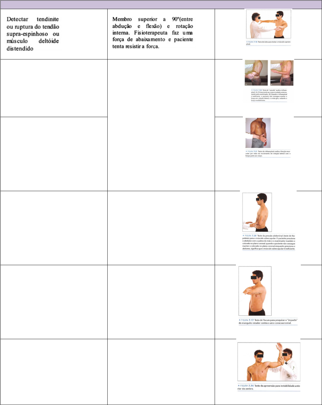 ORTOPEDIA OMBRO Teste de Jobe Músculo Supraespinal Teste da Cancela "O MS fica ao lado do tórax e o cotovelo em 90° de flexão, o braço é rodado passivamente pelo examinador, em sentido lateral, posição que deve ser mantida ativamente" Músculo Infraespinal Teste do Infraespinal "O paciente é instruído a realizar uma abdução de braço a 90º, flexão do cotovelo à 90º e, rotação externa do braço contra a resistência do terapeuta imposta na altura do punho do paciente." Teste de Napoleão "Periciado coloca a palma da mão junto ao abdome, mantendo a altura do cotovelo alinhada com a mão. O examinador empurra a mão contra o abdome e pede para o periciado manter esta posição." Músculo Subescapular Teste de Yocum "Paciente coloca a palma da mão no ombro oposto, enquanto o examinador eleva o cotovelo para a posição horizontal, provocando o atrito do SE sob o arco coracoacromial e sob a articulação acromioclavicular" Manguito rotador Teste da instabilidade anterior "estabilizando a articulação segurando-a por trás e então puxando o membro superior com o ombro abduzido em 90° e o cotovelo fletido em 90° (aumento da abdução e rotação externa)" Articulação glenoumeral Teste da instabilidade posterior/ Fukuda "O terapeuta atrás do paciente posiciona a sua mão sobre o olécrano do membro superior a ser testado e realiza uma tração do braço em sentido posterior. Com a outra mão espalmada ele mantém a escápula e visualiza a possível luxação posterior da cabeça umeral." Cápsula posterior COTOVELO Teste de Cozen/ cotovelo do tenista Epicondilite lateral Teste de Mills "Paciente com a mão fechada, o punho em dorsiflexão e o cotovelo em extensão. O examinador, então, forçará o punho em flexão e o paciente é orienta- do a resistir ao movimento. Em caso positivo, o paciente sentirá dor no epicôndilo lateral." Epicondilite lateral PUNHO Teste de Allen Avaliar o fluxo sanguíneo arterial para a mão --> patência da A. Radial e Ulnar Manobra de Froment "Pede-se para o paciente segurar um pedaço de papel entre o polegar e o indicador. Quando a função motora do nervo ulnar está íntegra, o paciente é capaz de manter a preensão usando o músculo adutor do polegar." Atrofia do adutor do polegar Sinal de Tinel "Consiste na percussão leve sobre o punho, na localização do nervo mediano. Assim, o resultado positivo é quando essa percussão transmite uma sensação de parestesia na região de distribuição do nervo mediano." Síndrome do Túnel do Carpo Manobra de finkelstein "O paciente aduz e envolve o polegar com os dedos. O teste é positivo se o desvio ulnar passivo do punho provocar dor forte nas bainhas dos nervos afetados." Tenossinovite de quervain (é patognomônico) QUADRIL Teste de Trendeleburg "fraqueza da musculatura abdutora do quadril - glúteo médio" "É positivo se, quando o quadril de um paciente que está de pé sustentado por somente uma perna, cai para o lado da perna levantada." Teste de Ludloff "Sentado, com os joelhos estendidos, o paciente é solicitado a levantar o calcanhar do lado afetado da mesa. Qualquer sintoma de fraqueza e / ou dor é considerado um teste positivo." Teste de Thomas Teste de Volkmann "com o paciente em decúbito dorsal, o exa- minador aplica força sobre as cristas ilíacas ântero -superiores, onde promove sobrecarga sobre as articulações sacroilíacas." Teste de Gaeslen Avaliar a dor proveniente da articulação sacro-ilíaca "Com o paciente em decúbito dorsal (deitado de barriga para cima) na beira da maca, a perna não testada é mantida em extensão, enquanto a perna testada é colocada em flexão máxima." Teste de Anvil O examinador abduz o membro do lado a ser testado em cerca de 45°, mantendo o joelho em extensão e executa a punho percussão do calcâneo. Teste de Patrick Paciente em posição supina deverá flexionar o joelho posicionando o pé no membro oposto que não será examinado Teste de Ober O paciente deverá estar em decúbito lateral, com o membro a ser testado no lado de cima. É realizada a flexão do joelho a 90 graus e abdução do quadril; o examinador então solta o membro. Teste de Ely O paciente encontra-se deitado de barriga para baixo e relaxado. O terapeuta está de pé ao lado do paciente, do lado da perna que irá ser testada. Uma mão deve estar na parte inferior das costas, a outra a segurar a perna pelo calcanhar. Passivamente deve flexionar o joelho de uma forma rápida. O calcanhar deve tocar as nádegas. Ambos os lados devem ser testados para comparação. O teste é positivo quando o calcanhar não chega a tocar na nádega, a anca do lado testado se eleva da mesa, o paciente sente dor ou parestesia nas costas ou pernas. JOELHO Teste da apreensão " A manobra consiste no deslocamento lateral da patela com o joelho em extensão observando as reações do paciente." Patela Deslocamento manual da patela Teste de Steinmann "É realizado com o paciente sentado sobre a mesa com a perna a pendente e os joelhos fletidos a 90º. A manobra consiste na realização passiva da rotação medial e lateral da perna." Meniscos Teste de Apley "Com o paciente em decúbito ventral, aplica-se força de tração através do joelho, associada a rotação interna e externa. A melhora do desconforto favorece a suspeita de lesão meniscal" Teste de Bragard "Demonstra aumento da dor à palpação da interlinha medial com a extensão e a rotação externa do joelho em casos de lesão do menisco medial." LIGAMENTOS CRUZADOS Teste do Pivot Shift LCA - Ligamento Cruzado anterior Teste de Lachman "Coloque o joelho do paciente em cerca de 20 a 30 graus de flexão O examinador deve colocar uma mão atrás da tíbia e a outra na coxa do paciente. É importante que o polegar do examinador esteja na tuberosidade da tíbia. Ao puxar a tíbia anteriormente, um LCA intacto deve impedir o movimento de translação anterior da tíbia no fêmur (“sensação de firmeza final” Teste da gave
