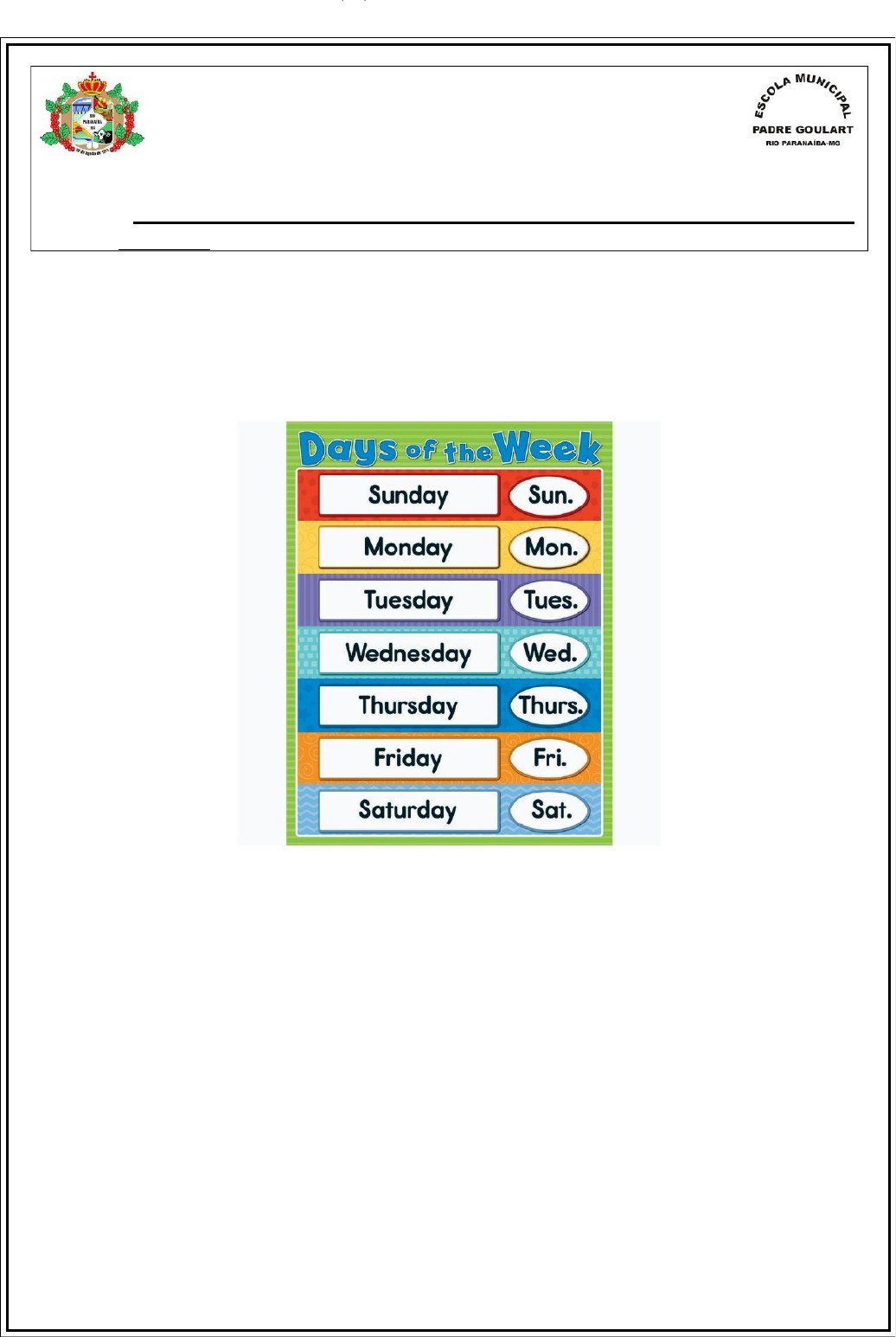 Escola Municipal Padre Goulart Atividades Desenvolvidas no Período da Pandemia / Covid 19 Plano Tutorado de Ensino / Ano 2021 Disciplina: Inglês / Professora: Cristina Conteúdo Relacionado:Days of the week/ Months/Seasons of the year Aluno(a): Turma: Atividade: 4 Data: 12/04/2021 Days of the week (dias da semana) Em inglês, os dias da semana são escritos sempre com letra maiúscula. Eles podem aparecer também na forma abreviada. Sunday: domingo Thursday: quinta-feira Monday: segunda-feira Friday: sexta-feira Tuesday: terça-feira Saturday: sábado Wednesday: quarta-feira Algumas expressões indicadoras de tempo que podem ser usadas com os dias ds semana: ( Impresso por Laiza Oliveira, CPF 053.358.897-99 para uso pessoal e privado. Este material pode ser protegido por direitos autorais e não pode ser reproduzido ou repassado para terceiros. 21/01/2022 14:04:22 ) . Today: hoje . Yesterday: ontem . Tomorrow: amanhã . Week: semana . Weekend: final de semana . Business day: dia útil . Last: último(a) . The day before yesterday: anteontem . Next: próximo(a) . The day after tomorrow: depois de amanhã Origem dos dias da semana · Monday: Day of the moon (Dia da Lua). Vem da palavra Mōnandæg, do inglês arcaico. O início da palavra significa “lua” e day” significa “dia”. · Tuesday: Tiw’s day (Dia do Deus Tiw). Vem da palavra Tiwesdæg, do inglês arcaico. O Deus Tiw, também chamado de Tew, Tyr ou Tywar, é um Deus da guerra e da glória na mitologia da Noruega. · Wednesday: Woden’s day (Dia do Deus Woden). Vem da palavra Wōdnesdæg, do inglês arcaico. O Deus Woden, também chamado de Odin, é o principal deus da mitologia da Noruega. · Thursday: Thor’s day (Dia do Deus Thor). Vem da palavra Þūnresdæg. O início da palavra, nos dias modernos, é traduzido como Thor, que é um deus da mitologia da Noruega associado aos trovões. · Friday: Freya’s day (Dia da Deusa Freia). Vem da palavra Frigedæg, do inglês arcaico. Freia é a deusa da beleza da mitologia nórdica · Saturday: Saturn’s day (Dia do Deus Saturno), já que “Saturn” significa “Saturno” e “day” significa “dia”. Vem da palavra Sæturnesdæg, do inglês arcaarc arcaico. · Sunday: Day of the Sun (Dia do Sol), já que “sun” significa “sol” e “day” significa “dia”. Vem da palavra Sunnandæg , do inglês arcaico. 1- Responda em inglês: a) Qual é o primeiro dia da semana? b) Qual dia vem antes de sábado? c) Qual dia vem depois de quarta-feira? d) Qual é o quarto dia da semana? e) Qual dia temos atividades de inglês? f) Qual dia vem depois de segunda-feira? g) Qual dia vem antes de domingo? h) Qual dia da semana você mais gosta? 2- Complete o quadro com os dias da semana: 3- Observe as imagens a seguir e marque a alternativa que contém os dias da semana que aparecem nelas, respectivamente: a) Segunda – terça – quarta b) Sexta – sábado – domigo c) Domingo – sexta – segunda d) Segunda – sexta – domingo e) Quinta – sábado – sexta Months of the year (Meses do ano) Assim como acontece com os dias da semana, em inglês, os meses do ano também são escritos com letra maiúscula. A forma abreviada se faz com as três primeiras letras da respectiva palavra. January: janeiro February: fevereiro March: março April: abril May: maio June: junho July: julho August: agosto September: setembro October: outubro November: novembro December: dezembro Origem dos meses do ano Inglês Português Origem do nome January Janeiro Tem origem no nome do deus Jano, deus romano das portas, dos inícios e fins. ( February Fevereiro )Tem origem no nome da deusa Februa, deusa do festival da purificação, que acontecia nessa época. March Março Tem origem no nome do deus Marte, filho de Februa e deus da guerra. ( April Abril )Vem do verbo em latim "aperire", que significa "abrir". Está relacionado com a abertura das flores nesse período, na primavera do hemisfério norte. May Maio Tem origem no nome da deusa da fecundidade, a deusa Maia. ( June Junho )Tem origem no nome da deusa Juno, deusa das mulheres, do casamento e do nascimento. July Julho Tem origem no nome do imperador romano Júlio César. August Agosto Tem origem no nome do líder romano Augusto César. Antigamente, o calendário romano começava em março e com isso setembro era September Setembro o sétimo mês, daí a derivação do nome. Uma reforma aplicada pelo imperador Júlio César instituiu janeiro como primeiro mês e só então setembro passou a ser o nono mês do ano. ( October Outubro )Antes da reforma aplicada pelo imperador Júlio César, outubro era o oitavo mês do ano. Em latim, "octo" significa "oito". ( November Novembro )Antes da reforma aplicada pelo imperador Júlio César, novembro era o nono mês do ano. Em latim, "novem" significa "nove". ( December Dezembro )Antes da reforma aplicada pelo imperador Júlio César, dezembro era o décimo mês do ano. Em latim, "decem" significa "dez". 4- Faça uma rápida pesquisa e responda as perguntas com os meses do ano: a) Qual é o menor mês do ano em número de dias? b) Qual é o menor mês do ano em número de letras? c) Qual é o quarto mês do ano? d) Qual é o maior mês do ano em número de letras? e) Qual mês comemoramos a independência do Brasil? f) Qual mês comemoramos a independência dos Estados Unidos? 5- Escolha a opção correta quanto a forma abreviada da palavra: a) January= JNY b) January= JNU c) January= JAY d) January= JAN e) January= JNA 6- Combine as datas comemorativas com os meses do ano em que elas ocorrem: Seasons of the year (Estações do ano) Em inglês, as estações do ano são chamadas seasons. São quatro estações ao longo do ano. . Spring (primavera): É a estação das flores. No Brasil, a primavera acontece entre os meses de setembro e dezembro. Nos Estados Unidos, acontece entre os meses de março e junho. . Summer (verão): É a estação do calor. O verão brasileiro acontece entre os meses de deze