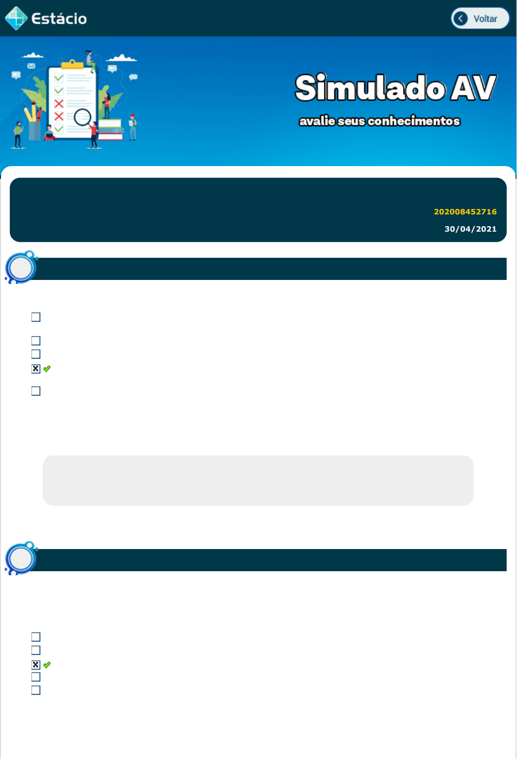 Disc.: DESENVOLV. WEB EM HTML5, CSS, JAVASCRIPT E PHP Aluno(a): HELOISA BUSQUIM 202008452716 Acertos: 10,0 de 10,0 30/04/2021 Acerto: 1,0 / 1,0 Dentre as alternativas a seguir, assinale a que NÃO se aplica ao conceito de Design Responsivo: Um site responsivo utiliza apenas uma URL, servindo a todos os usuários, independentemente de seus dispositivos. As consultas de mídias são essenciais para páginas responsivas, pois permitem adaptação do layout. O design de uma interface responsiva precisa entender o viewport, espaço de renderização da página. Como uma estratégia de desenvolvimento, recomenda-se começar o design responsivo pelas interfaces maiores e mais complexas. Um sítio responsivo simplifica o desenvolvimento, pois só precisa de um código para os diversos dispositivos. Respondido em 30/04/2021 17:48:36 Explicação: Como uma estratégia de desenvolvimento, recomenda-se começar o design responsivo pelas interfaces maiores e mais complexas. Acerto: 1,0 / 1,0 O objetivo principal de uma linguagem de marcação, como a HTML, é estruturar o conteúdo de um documento. Neste contexto, qual das opções abaixo não se aplica a conteúdo? Imagem Listas Cor do texto Tabelas Texto Respondido em 30/04/2021 17:38:33 Questão11a Questão22a Heloisa Busquim Explicação: Questão enviada pela EAD para inserção. Acerto: 1,0 / 1,0 Ao codificarmos uma página HTML tendo em mente a semântica, devemos utilizar: A tag HTML correta de acordo com o seu conteúdo ou finalidade. Atributos em todas as tags. A HTML5. O correto DTD: Strict, transitional ou frameset. As tags de estrutura, que são comuns na maioria as páginas Web. Respondido em 30/04/2021 17:49:15 Explicação: Remetem a: Tipos de tags: Estruturais, textuais e semânticas. Questão enviada pela EAD para inserção. Acerto: 1,0 / 1,0 O formulário é um elemento que permite interação do usuário e, consequentemente, que dados sejam enviados para um servidor Web. Neste contexto, assinale a afirmação correta O tratamento dos dados enviados pelo formulário deve ser feito com a utilização de uma linguagem de programação que rode no servidor (server side) A única maneira de validar os dados de um formulário é utilizando a HTML5. Apenas os formulários validados podem ser submetidos a um servidor Web. Quando não for necessário enviar os dados para um servidor, basta utilizar os campos do formulário, sem a tag principal Como é o único elemento HTML que permite interação do usuário, formulário precisa ficar sozinho em uma página Web, sem nenhum outro elemento de conteúdo. Respondido em 30/04/2021 17:39:44 Acerto: 1,0 / 1,0 (INSTITUTO AOCP - 2018 - PRODEB - Especialista de TIC - Construção de Software) De acordo com a linguagem CSS (Cascading Style Sheets) é possível configurar uma fonte de um programa HTML para ser exibida em Negrito. Qual é a propriedade que proporciona essa funcionalidade? font-variant font-style font-family font-size font-weight Respondido em 30/04/2021 17:45:32 Questão33a Questão44a Questão55a Acerto: 1,0 / 1,0 Utilizando JavaScript , qual é a sintaxe correta para alterar o conteúdo do elemento HTML de id="teste", por meio do clique do botão abaixo? document.p.innerHTML = "Universidade Federal do Ceará" document.getElementById('teste').innerHTML = 'Universidade Federal do Ceará' document.getElement("p").innerHTML = "Universidade Federal do Ceará" document.getElementByName("p").innerHTML = "Universidade Federal do Ceará" #demo.innerHTML = "Universidade Federal do Ceará" Respondido em 30/04/2021 17:50:06 Explicação: Deve-se obter o componente cujo id é teste para então alterar o seu conteúdo interno. Acerto: 1,0 / 1,0 Numa discussão entre os programadores sobre os conceitos de AJAX (Asynchronous JavaScript and XML), as seguintes afirmações foram feitas: (IBFC − TJ − PE − 2017 − Técnico Judiciário − Apoio Especializado − Programador de Computador − Prova: 61146) ( ) Permite atualizar dinamicamente o conteúdo, ou partes, de uma página Web. ( ) Embora usado no nome, a utilização da linguagem XML não é obrigatória. ( ) A XMLHttpRequest(XHR) é utilizada para enviar requisições pelo script para o lado client. Dê valores Verdadeiro (V) ou Falso (F) em cada afirmação e identifique a alternativa que apresenta a sequência correta (de cima para baixo): F - F - V V - V - V V - V - F F - F - F V - F - V Respondido em 30/04/2021 17:50:32 Explicação: . Questão66a Questão77a Acerto: 1,0 / 1,0 Sobre a linguagem PHP é INCORRETO afirmar que: Não pode ser embutida dentro do HTML. É especialmente adequada para o desenvolvimento Web. É uma linguagem de script open source de uso geral. NÃO é executada do lado do cliente. A primeira finalidade do PHP foi interpretar os formulários HTML. Respondido em 30/04/2021 17:52:50 Explicação: PHP e HTML possuem muita interação: PHP pode gerar HTML, e o HTML pode passar informações para on PHP. O PHP tambem pode ser embutido dentro do HTML, afinal são 2 linguagens integradas para desenvolvimento WEB Acerto: 1,0 / 1,0 (NC-UFPR - 2019 - Prefeitura de Matinhos - PR - Técnico em Informática) Qual instrução apresenta o conteúdo do primeiro elemento do vetor ou array declarado em PHP na forma? $estados = array("AM", "AP", "DF", "PR", "SP","SC", "RS"); echo $estados[0]; print_r( $estados ); print_r( $estados[1] echo $estados[1] $estados[1] Respondido em 30/04/2021 17:47:54 Acerto: 1,0 / 1,0 A implementação correta de uma classe chamada Usuário em PHP é (FADESP - 2017 - COSANPA - Analista de Sistema) Questão88a Questão99a Questão1100a Respondido em 30/04/2021 17:43:22 Explicação: A resposta do gabarito implementa todos os conceitos corretamente.