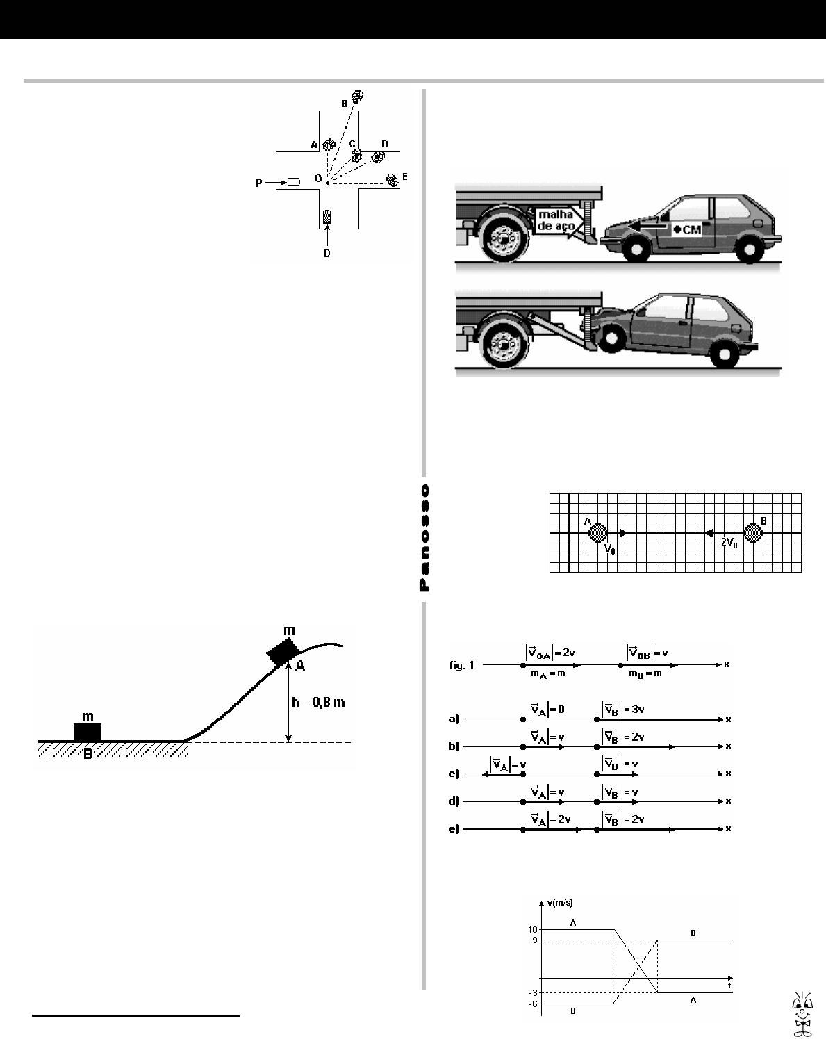 www.professorpanosso.com.br 1 Exercícios de Física - Prof. Panosso Colisões 1) Perto de uma esquina, um pipoqueiro, P, e um "dogueiro", D, empurram distraidamente seus carrinhos, com a mesma velocidade (em módulo), sendo que o carrinho do "dogueiro" tem o triplo da massa do carrinho do pipoqueiro. Na esquina, eles colidem (em O) e os carrinhos se engancham, em um choque totalmente inelástico. Uma trajetória possível dos dois carrinhos, após a colisão, é compatível com a indicada por a) A b) B c) C d) D e) E 2) Durante a colheita, um trator de massa M e velocidade de módulo v colide com um reboque de massa m em repouso. Após a colisão, ambos se deslocam juntos, sem rotações laterais. Desprezando-se tanto o atrito quanto as deformações, o módulo da velocidade do conjunto é a) [M/(M+m)] v b) (M+m) v c) [(m+M)/M] v d) [m/(m+M)] v e) [Mm/(m+M)] v 3) Uma flecha de massa 100g, a uma velocidade de 24m/s encontra uma ave, com massa de 900g, livre, em repouso sobre um galho. A ave ferida mais a flecha passam a ser um único corpo, com velocidade final, em m/s, de a) zero. b) 0,6. c) 1,2. d) 2,4. e) 6. 4) Uma pistola dispara um projétil contra um saco de areia que se encontra em repouso, suspenso a uma estrutura que o deixa plenamente livre para se mover. O projétil fica alojado na areia. Logo após o impacto, o sistema formado pelo saco de areia e o projétil move-se na mesma direção do disparo com velocidade de módulo igual a 0,25 m/s. Sabe-se que a relação entre as massas do projétil e do saco de areia é de 1/999. Qual é o módulo da velocidade com que o projétil atingiu o alvo? a) 25 m/s. b) 100 m/s. c) 250 m/s. d) 999 m/s. e) 1000 m/s. 5) Um pequeno bloco, de massa m = 0,5 kg, inicialmente em repouso no ponto A, é largado de uma altura h = 0,8 m. O bloco desliza, sem atrito, ao longo de uma superfície e colide com um outro bloco, de mesma massa, inicialmente em repouso no ponto B (veja a figura a seguir). Determine a velocidade dos blocos após a colisão, em m/s, considerando- a perfeitamente inelástica. 6) Uma partícula A, com massa m = 0,2 kg, colide frontalmente com uma partícula B, com massa maior que a de A, e que inicialmente se encontra em repouso. A colisão é totalmente elástica e a energia cinética final da partícula A cai para 64% de seu valor inicial. Se a velocidade inicial da partícula A for v³ = 20,0 m/s, calcule a) a velocidade final da partícula A. b) a quantidade de movimento da partícula B após a colisão. 7) O chamado "pára-choque alicate" foi projetado e desenvolvido na Unicamp com o objetivo de minimizar alguns problemas com acidentes. No caso de uma colisão de um carro contra a traseira de um caminhão, a malha de aço de um pára-choque alicate instalado no caminhão prende o carro e o ergue do chão pela plataforma, evitando, assim, o chamado "efeito guilhotina". Imagine a seguinte situação: um caminhão de 6000kg está a 54 km/h e o automóvel que o segue, de massa igual a 2000kg, está a 72 km/h. O automóvel colide contra a malha, subindo na rampa. Após o impacto, os veículos permanecem engatados um ao outro. a) Qual a velocidade dos veículos imediatamente após o impacto? b) Qual a fração da energia cinética inicial do automóvel que foi transformada em energia gravitacional, sabendo-se que o centro de massa do mesmo subiu 50 cm? 8) Dois discos, A e B, de mesma massa M, deslocam-se com velocidades VÛ = V³ e V½ = 2V³, como na figura, vindo a chocar-se um contra o outro. Após o choque, que não é elástico, o disco B permanece parado. Sendo E� a energia cinética total inicial (E� = 5 x (1/2 MV³£)), a energia cinética total E‚, após o choque, é a) E‚ = E� b) E‚ = 0,8 E� c) E‚ = 0,4 E� d) E‚ = 0,2 E� e) E‚ = 0 9) Duas partículas movem-se, inicialmente, conforme a figura 1 adiante. Após colidirem, sem perda de energia, as velocidades das partículas podem ser representadas pelo diagrama: 10) A figura representa o gráfico velocidade-tempo de uma colisão unidimensional entre dois carrinhos A e B. Calcule a razão entre as massa mÛ e m½ dos carrinhos. www.professorpanosso.com.br 2 Exercícios de Física - Prof. Panosso Colisões 11) Sobre uma mesa horizontal de atrito desprezível, dois blocos A e B de massas m e 2m, respectivamente, movendo-se ao longo de uma reta, colidem um com o outro. Após a colisão os blocos se mantém unidos e deslocam-se para a direita com velocidade ¬, como indicado na figura. O unico esquema que não pode representar os movimentos dos dois blocos antes da colisão é: 12) Uma esfera de massa m�=3,0kg movendo-se com velocidade constante v�=2,0 m/s, colide frontal e elasticamente com outra esfera de massa m‚=1,0 kg, inicialmente em repouso. As velocidades das esferas, imediatamente após o choque, em m/s, valem, respectivamente, a) 1,0 e 3,0 b) 1,0 e 2,0 c) 1,0 e 1,0 d) 1,5 e 0,50 e) 2,0 e 0,50 13) A esfera A, com velocidade 6,0m/s, colide com a esfera B, em repouso, como mostra a figura anterior. Após a colisão as esferas se movimentam com a mesma direção e sentido, passando a ser a velocidade da esfera A 4,0m/s e a da esfera B, 6,0m/s. Considerando mÛ a massa da esfera A e m½ a massa da esfera B, assinale a razão mÛ/m½. a) 1 b) 2 c) 3 d) 4 e) 5 14) Jogadores de sinuca e bilhar sabem que, após uma colisão não frontal de duas bolas A e B de mesma massa, estando a bola B inicialmente parada, as duas bolas saem em direções que formam um ângulo de 90°. Considere a colisão de duas bolas de 200g, representada na figura a seguir. A se dirige em direção a B com velocidade V=2,0m/s formando um ângulo ‘ com a direção y tal que sen‘=0,80. Após a colisão, B sai na direção y. a) Calcule as componentes x e y das velocidades de A e B logo após a colisão. b) Calcule a variação da energia (cinética de translação) na colisão. 15) A esfera A, de massa 2kg e velocidade 10m/s, colide com outra B de 1kg, que se encontra inicia