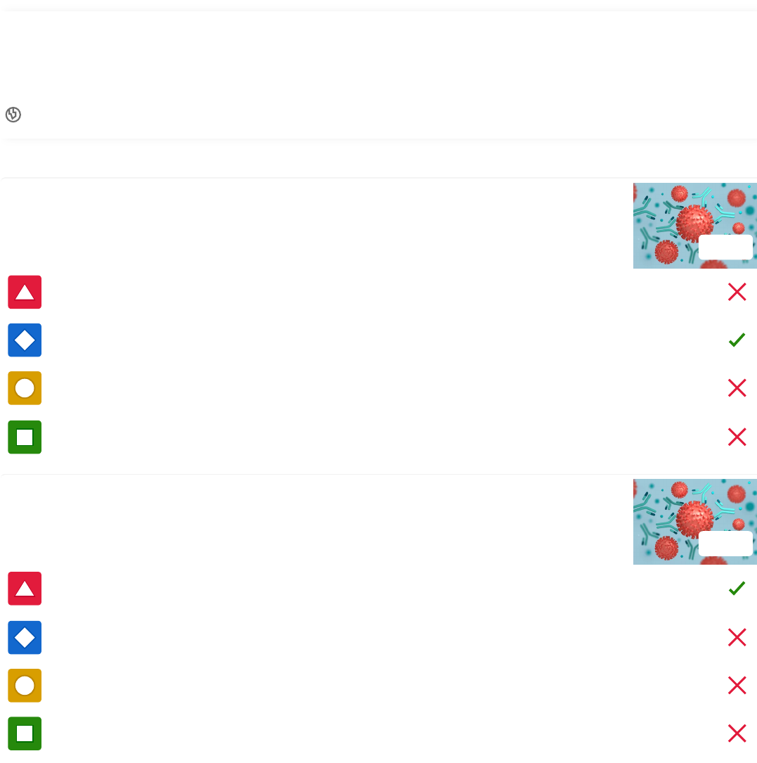 12/02/2023 19:35 Revisão Imunologia Clínica — Detalhes — Kahoot! https://create.kahoot.it/details/50191453-6524-4623-9204-bdc416d22ef4 1/6 Revisão Imunologia Clínica 2 jogos • 22 jogadores Um kahoot público Perguntas (20) 1 - Quiz Quais são os órgãos do sistema imunológico? Timo, baço, uretra e medula óssea Timo, baço, linfonodos e medula óssea Timo, cérebro e medula óssea Coração, linfonodos e medula óssea 2 - Quiz Qual a função dos anticorpos? Opsonização Criar poros na parede celular de bactérias Colorir as células facilitando a sua observação Causar destruição do material celular ao penetrar dentro das células 30 seg. 30 seg. 12/02/2023 19:35 Revisão Imunologia Clínica — Detalhes — Kahoot! https://create.kahoot.it/details/50191453-6524-4623-9204-bdc416d22ef4 2/6 3 - Quiz O que é um antígeno? Mesma coisa que anticorpo Partícula ou molécula capaz de de�agrar a produção de anticorpo especí�co São células do nosso próprio organismo Todas as opções são verdadeiras 4 - Quiz Podemos encontrar 5 classes de imunoglobulinas que são: As imunoglobulinas F (IgA), D (IgD), E (IgE), G (IgG) e M (IgM). As imunoglobulinas F (IgA), D (IgD), E (IgE), G (IgG) e M (IgM). As imunoglobulinas A (IgA), D (IgD), E (IgE), G (IgG) e M (IgM). As imunoglobulinas A (IgA), F (IgD), E (IgE), G (IgG) e M (IgM). 5 - Verdadeiro ou falso Antigeno imunógeno é o antígeno capaz de suscitar uma resposta imune e memória. True False 6 - Verdadeiro ou falso Hapteno são moléculas pequenas incapazes de provocar uma resposta imune sozinhas, necessitando proteínas. True False 30 seg. 30 seg. 30 seg. 30 seg. 12/02/2023 19:35 Revisão Imunologia Clínica — Detalhes — Kahoot! https://create.kahoot.it/details/50191453-6524-4623-9204-bdc416d22ef4 3/6 7 - Verdadeiro ou falso A interação entre o antígeno e o anticorpo ocorre por meio de superfícies complementares nas quais existe um epítopo. True False 8 - Quiz Dentre as classes de imunoglobulinas, a única classe que atravessa a placenta é: IgA IgE IgG IgM 9 - Quiz São exemplos de células apresentadoras de antígenos: Linfócitos T e promielócitos Células estomacais e hemácias Neurônios Células dendríticas e macrofagos. 10 - Quiz Dentre os linfócitos T, podemos citar os seguintes "tipos": Produtores de anticorpos e não produtores de anticorpos Células NK, Linfócitos B e T Regulador, Help e Citotóxico Granulócitos 30 seg. 30 seg. 30 seg. 30 seg. 12/02/2023 19:35 Revisão Imunologia Clínica — Detalhes — Kahoot! https://create.kahoot.it/details/50191453-6524-4623-9204-bdc416d22ef4 4/6 11 - Verdadeiro ou falso In�amação aguda é rápida, com ação curta, tendo como principais características o edema e a migração de leucócitos True False 12 - Verdadeiro ou falso A resposta imune adaptativa é a primeira linha de defesa contra uma variedade de bactérias, fungos, vírus e parasitas. True False 13 - Verdadeiro ou falso Imunidade adaptativa é aquela gerada ao longo da vida, ativada após um contato inicial com diferentes agentes invasores. True False 14 - Verdadeiro ou falso Na estrutura dos anticorpos. IgA e IgG são diméricos, IgD e IgE são monoméricos. Já IgM é o único pentamérico. True False 15 - Quiz Leucócito conhecido como polimorfonuclear, que possui a capacidade de deixar os vasos sanguíneos e penetrar nos tecidos Monócito Basó�lo Neutró�lo Eosinó�lo 30 seg. 30 seg. 30 seg. 30 seg. 30 seg. 12/02/2023 19:35 Revisão Imunologia Clínica — Detalhes — Kahoot! https://create.kahoot.it/details/50191453-6524-4623-9204-bdc416d22ef4 5/6 16 - Quiz Imunoglobulina mais abundante secretada no sangue durante a fase inicial de uma resposta primária por anticorpos é a: IgM IgM IgE IgA 17 - Quiz Imunoglobulina mais abundante secretada no sangue durante a fase �nal de uma resposta primária por anticorpos (memória) IgM IgG IgE IgA 18 - Quiz Unica imunoglobulina presente na membrana dos linfócitos B imaturos IgM igG IgA IgD 30 seg. 30 seg. 30 seg. 12/02/2023 19:35 Revisão Imunologia Clínica — Detalhes — Kahoot! https://create.kahoot.it/details/50191453-6524-4623-9204-bdc416d22ef4 6/6 19 - Quiz Imunoglobulina associoada a respostas de imune-proteção anti-parasitária (anti-helmintos). IgM IgG IgE IgA 20 - Verdadeiro ou falso O sistema complemento: conjunto de proteínas séricas que atuam em diferentes tipos de reações imuno-in�amatórias True False 30 seg. 30 seg.
