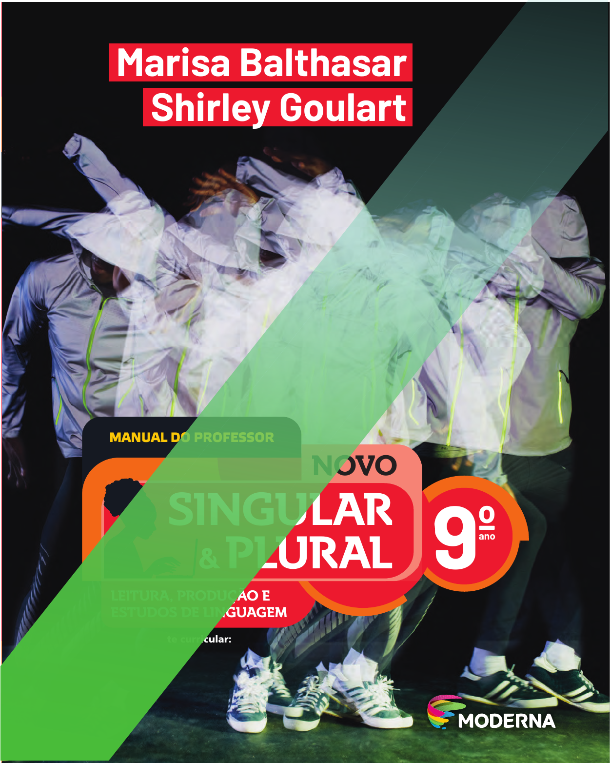 MANUAL DO PROFESSOR 9ºano LEITURA, PRODUÇÃO E ESTUDOS DE LINGUAGEM NOVO SINGULAR PLURAL& Componente curricular: LÍNGUA PORTUGUESA Marisa Balthasar Shirley Goulart MA TE RIA L D E D IV UL GA Çà O. V ER Sà O SU BM ET ID A À AV AL IA Çà O. Có dig o d a c ol eç ão : PN LD 20 24 - O bje to 1 00 09 P2 4 0 1 0 0 2 00 01 0 MA TE RIA L D E D IV UL GA Çà O. V ER Sà O SU BM ET ID A À AV AL IA Çà O. Có dig o d a c ol eç ão : PN LD 20 24 - O bje to 1 00 09 P2 4 0 1 0 0 2 00 01 0 Componente curricular: LÍNGUA PORTUGUESA 1a edição São Paulo, 2022 Marisa Balthasar Doutora em Letras (Teoria Literária e Literatura Comparada) pela Universidade de São Paulo. Formadora em programas de formação docente continuada em diversas redes estaduais e municipais de ensino, consultora em programas de educação integral. Professora na rede pública por 14 anos. Professora em escolas particulares do Ensino Superior. Autora de materiais didáticos. Shirley Goulart Mestra em Linguística Aplicada e Estudos da Linguagem pela Pontifícia Universidade Católica de São Paulo. Licenciada em Letras pelas Faculdades Integradas Rui Barbosa (SP). Professora na rede pública por 15 anos. Formadora em programas de formação continuada em redes estaduais e municipais de ensino. Consultora em programas e escolas particulares de educação integral para elaboração de currículo e formação de equipe. Professora em instituições do Ensino Superior. Autora de materiais didáticos. MANUAL DO PROFESSOR Componente curricular: LÍNGUA PORTUGUESA 1a edição São Paulo, 2022 LEITURA, PRODUÇÃO E ESTUDOS DE LINGUAGEM NOVO SINGULAR PLURAL& º9ano 1 3 5 7 9 10 8 6 4 2 Coordenação editorial: Ofício do Texto Projetos Editoriais, Liliane Fernanda Pedroso Edição de texto: Ofício do Texto Projetos Editoriais Assistência editorial: Ofício do Texto Projetos Editoriais Preparação de texto: Ofício do Texto Projetos Editoriais Gerência de design e produção grá�ca: Patricia Costa Coordenação de produção: Denis Torquato Gerência de planejamento editorial: Maria de Lourdes Rodrigues Coordenação de design e projetos visuais: Marta Cerqueira Leite Projeto grá�co: Tatiane Porusselli, Bruno Tonel e Douglas Rodrigues José Capa: Douglas Rodrigues José, Tatiane Porusselli, Apis Design e Fábio Luna Foto: Tara Moore/Stone/Getty Images Coordenação de arte: Wilson Gazzoni Agostinho Edição de arte: Regine Crema Editoração eletrônica: Teclas Editorial Coordenação de revisão: Elaine C. del Nero Revisão: Beatriz Rocha, Denise de Almeida, Márcia Leme, Renato da Rocha, Vera Rodrigues Coordenação de pesquisa iconográ�ca: Flávia Aline de Morais Pesquisa iconográ�ca: Jade Defacio, Joanna Heliszkowski Coordenação de bureau: Rubens M. Rodrigues Tratamento de imagens: Ademir Francisco Baptista, Ana Isabela Pithan Maraschin, Denise Feitoza Maciel, Marina M. Buzzinaro, Vânia Maia Pré-impressão: Alexandre Petreca, Fabio Roldan, José Wagner Lima Braga, Marcio H. Kamoto, Selma Brisolla de Campos Coordenação de produção industrial: Wendell Monteiro Impressão e acabamento: Reprodução proibida. Art. 184 do Código Penal e Lei 9.610 de 19 de fevereiro de 1998. Todos os direitos reservados EDITORA MODERNA LTDA. Rua Padre Adelino, 758 - Belenzinho São Paulo - SP - Brasil - CEP 03303-904 Atendimento: Tel. (11) 3240-6966 www.moderna.com.br 2022 Impresso no Brasil A imagem de capa mostra um jovem afrodescendente, de corpo inteiro, vestindo uma blusa com capuz que encobre sua cabeça, em um movimento de dança com efeito motion blur. O “rastro” deixado pelo movimento da dança sugere multiplicidade de ações. Os jovens, nessa fase da vida, percebem-se de forma mais complexa e crítica como indivíduos. Ao mesmo tempo que consideram a singularidade das pessoas, percebem responsabilidades e direitos, diferentes perspectivas, agindo no coletivo de forma a considerar sua multiculturalidade, diversidade, pluralidade. APRESENTAÇÃO Caro(a) professor(a): O exercício pleno da cidadania e a construção de identidades livres pressupõem a autonomia de agir e de pensar. Foi considerando isso que fizemos esta coleção: para ajudar os(as) estudantes a desen- volverem capacidades que lhes permitam adquirir cada vez mais autonomia de ação e de pensamento e também para garantir a você, professor(a), essa mesma autonomia em seu trabalho. Você notará que cada volume desta coleção está organizado em quatro unidades, com três capítulos, cada um priorizando frentes diferentes do ensino de Língua Portuguesa: Leitura e Produção, Práticas de Literatura, Estudos Linguísticos e Gramaticais. Apesar dessa forma de organização dos saberes desse componente curricular, o objetivo não é tratar leitura, produção textual, oralidade, análise linguística e semiótica de maneira estanque. Cada capítulo prioriza um deles, mas sempre buscando estabelecer relações com os demais. Essa divisão garante sua liberdade de escolher e explorar os capítulos na ordem em que se apresentam ou esco- lher outros caminhos a seguir com sua turma, ora dando ênfase a um aspecto do uso da língua, ora enfatizando outros. É porque acreditamos em você, professor(a), na sua capacidade de discernir quais são as neces- sidades da sua turma, quais são os objetivos a serem alcançados e em que ritmo, que lhe apresen- tamos esta coleção. Esperamos estar com você, lado a lado, apoiando-o(a) nessa caminhada. III SUMÁRIO O Manual do Professor ........................................................................................................................................ V Pressupostos teórico-metodológicos ........................................................................................................... VI Ensino e aprendizagem de língua materna ............................................................................................... VI A leitura, a escuta e a produção de textos sob a perspe