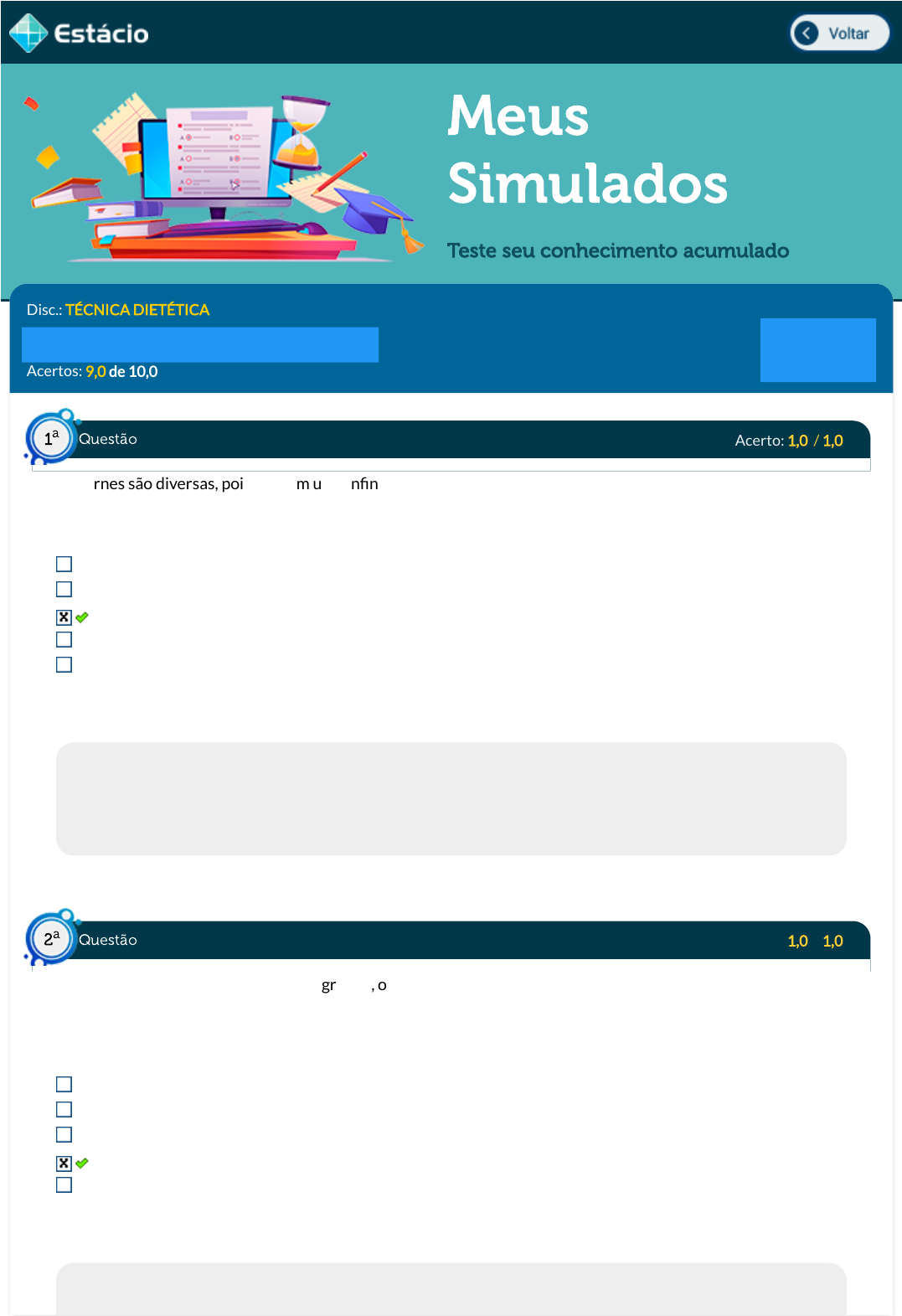 Meus Simulados Teste seu conhecimento acumulado Disc.: TÉCNICA DIETÉTICA Aluno(a): BRUNO MATHEUS MANCINI DA SILVA 202109553861 Acertos: 9,0 de 10,0 04/06/2023 Acerto: 1,0 / 1,0 As carnes são diversas, pois existem uma in�nidade de animais, sejam eles domesticados ou selvagens, de criação ou livres. De coloração também diversi�cada, que vai do branco ao vermelho púrpura. O que in�uencia na cor avermelhada da carne? Animais de acordo com a cor que eles possuem. A idade do animal. Maior ou menor quantidade de mioglobina e hemoglobina. O tipo de animal. Maior quantidade de sangue. Respondido em 04/06/2023 21:27:00 Explicação: Alguns animais possuem a cor mais clara e outros mais escura, mas não têm relação com a cor da pelagem, pele, penas, escamas nem o tipo do animal, ainda que se tenham carnes alaranjadas, essas são pela maior quantidade de carotenoides. O tom avermelhado varia de acordo com as quantidades de mioglobina e hemoglobina. Acerto: 1,0 / 1,0 Antigamente, ao se abater um animal grande, onde não era possível consumir tudo, uma das formas de conservação era a defumação, pois além de afastar vetores, também tem ação antimicrobiana. Além disso, deixa-se a carcaça do animal pendurada por cerca de 24 horas. O que acontece com a carne do animal nas primeiras 24 horas após abatido? A carne muda de cor e �ca ainda mais macia. A carne �ca macia demais depois volta a enrijecer. A carne torna-se mais intensa no sabor. A carne adquire rigidez depois volta a �car macia. A carne torna-se mais suave no sabor. Respondido em 04/06/2023 21:27:31 Explicação: Questão1 a Questão2 a https://simulado.estacio.br/alunos/inicio.asp javascript:voltar(); Após o abate, a carne tem sua maciez natural, porém, há ação do ácido láctico que a torna rígida em um primeiro momento para, depois, continuar sua ação e retornar a maciez anterior. Portanto, ela não �ca mais macia e seu sabor não se altera. Acerto: 1,0 / 1,0 Os ovos mais consumidos são os de cor branca, pois sua produção é a maior. Existem muitas cores, como azul, verde, marrom-escuro, rosado e avermelhado. Qual a diferença nutricional entre eles? A diferença está na forma de criação do animal, não na cor. Ovos sem serem branco são mais nutritivos de forma geral. Os ovos verdes contêm cloro�la e o branco não. Os ovos azulados contêm �avonoides e o branco não. O vermelho contém mais ômega 3 que o branco. Respondido em 04/06/2023 21:30:28 Explicação: Justi�cativa: O que in�uencia na cor dos ovos é a raça do animal e em termos de nutrientes, o que difere é a forma de criação do animal, não sua cor, portanto ovos coloridos não possuem �avonoides ou cloro�la ou outro nutriente diferente dos ovos brancos. Acerto: 1,0 / 1,0 ¿Produto gorduroso em forma de película que se forma na superfície do leite pela ação do calor¿, a nata é bem conhecida e muitos que consomem leite não a apreciam. A nata serve de base para qual produto muito conhecido? Ke�r Queijo Creme de leite Iogurte Requeijão Respondido em 04/06/2023 21:30:50 Explicação: Justi�cativa: O creme de leite é feito com a nata que se forma na superfície do leite, o ke�r é feito com todo o leite, não só a nata. O queijo é feito com o coalho, não só com a nata. O iogurte pode ser feito também sem gordura alguma. E o requeijão também é feito com leite e coalho. Acerto: 1,0 / 1,0 Pedro foi preparar um suco diferente e decidiu bater no liquidi�cador água �ltrada, uva roxa e mamão e para a surpresa o suco �cou com a coloração azulada. Qual o pigmento foi responsável por essa coloração? Rutina. Antocianina. Questão3 a Questão4 a Questão5 a Betacaroteno. Ácido cítrico. Quercetina. Respondido em 04/06/2023 21:31:36 Explicação: O mamão tem um Ph mais para alcalino, dessa forma, quando o pigmento arroxeado da uva, conhecido como antocianina, entrou em contato com este pH alcalino do mamão, houve a transformação da pigmentação em um tom azulado. Acerto: 1,0 / 1,0 O pedido de compras é a descrição e compilação de todos os gêneros necessários para a previsão e compra pela Unidade de Alimentação e Nutrição (UAN), em um período de tempo determinado (semanal, quinzenal, mensal, semestral, entre outros). A etapa inicial deste processo é: A elaboração de cardápio. A avaliação do valor calórico do cardápio. A avaliação da aceitação do cardápio. A frequência de diferentes preparações. O cálculo do peso bruto dos gêneros alimentícios. Respondido em 04/06/2023 21:33:22 Explicação: O ponto de partida para se criar a lista de compras é a elaboração do cardápio, sem o cardápio pronto não há possibilidade de criar a lista de compras e realizar o planejamento de pedido de insumos. Acerto: 1,0 / 1,0 Alguns procedimentos, por separarem determinadas partes dos alimentos, in�uenciam na constituição e no valor nutritivo dos alimentos. Sobre as técnicas de separação dos alimentos, das de�nições abaixo, assinale a CORRETA: Tamisar consiste na separação de dois sólidos. Misturar consiste na adição de ingredientes não miscíveis. Operação que exige pouco esforço e tempo. Destilar consiste em unir dois líquidos não miscíveis. Sedimentar consiste em separar dois sólidos. Espremer consiste na separação de dois líquidos. Respondido em 04/06/2023 21:37:20 Explicação: Justifcativa: Misturar é técnica de união e não de separação. Espremer e sedimentar são técnicas de separação de um sólido e um líquido. Destilar é a separação de dois líquidos com pontos de ebulição diferentes. Então, a alternativa com tamisar está correta, pois trata-se da separação de dois sólidos, podendo também ser chamado de peneirar. Questão6 a Questão7 a Acerto: 1,0 / 1,0 Em uma padaria, durante o preparo do pão, a ação realizada para unir os ingredientes é: Tamisar. Precipitar. Sedimentar. Centrifugar. Sovar. Respondido em 04/06/2023