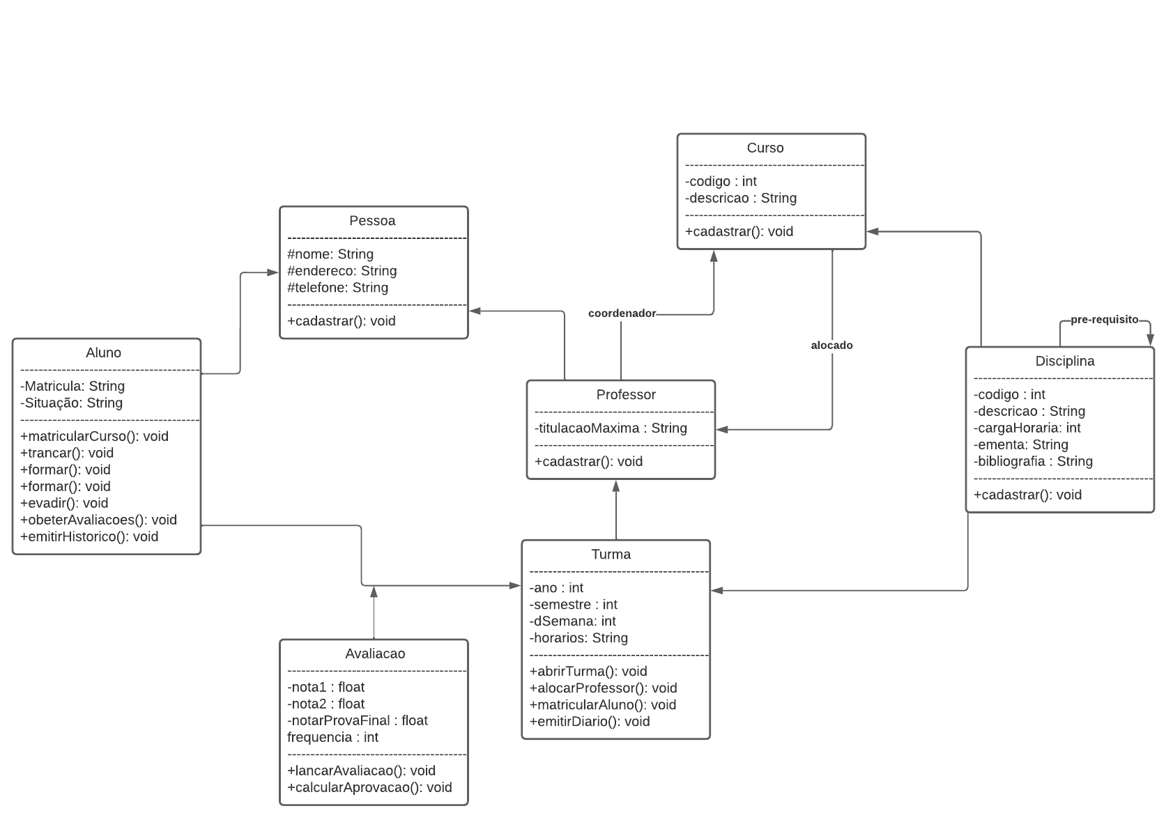 Aluno --------------------------------------- -Matricula: String -Situação: String --------------------------------------- +matricularCurso(): void +trancar(): void +formar(): void +formar(): void +evadir(): void +obeterAvaliacoes(): void +emitirHistorico(): void Pessoa --------------------------------------- #nome: String #endereco: String #telefone: String --------------------------------------- +cadastrar(): void Avaliacao --------------------------------------- -nota1 : float -nota2 : float -notarProvaFinal : float frequencia : int --------------------------------------- +lancarAvaliacao(): void +calcularAprovacao(): void Professor --------------------------------------- -titulacaoMaxima : String --------------------------------------- +cadastrar(): void Turma --------------------------------------- -ano : int -semestre : int -dSemana: int -horarios: String --------------------------------------- +abrirTurma(): void +alocarProfessor(): void +matricularAluno(): void +emitirDiario(): void Curso --------------------------------------- -codigo : int -descricao : String --------------------------------------- +cadastrar(): void coordenador alocado Disciplina --------------------------------------- -codigo : int -descricao : String -cargaHoraria: int -ementa: String -bibliografia : String --------------------------------------- +cadastrar(): void pre-requisito Diagrama em branco Página 1