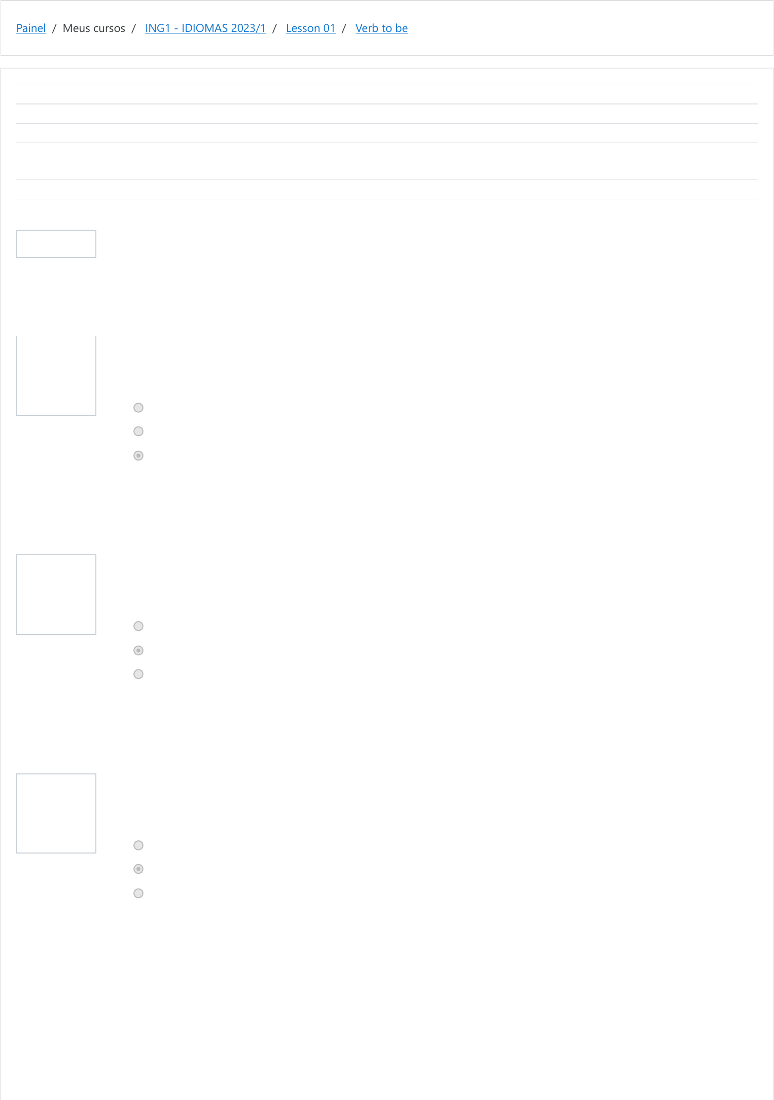 Painel / Meus cursos / ING1 - IDIOMAS 2023/1 / Lesson 01 / Verb to be Informação Questão 1 Correto Atingiu 1,00 de 1,00 Questão 2 Correto Atingiu 1,00 de 1,00 Questão 3 Correto Atingiu 1,00 de 1,00 Iniciado em domingo, 16 abr 2023, 19:38 Estado Finalizada Concluída em domingo, 16 abr 2023, 19:39 Tempo empregado 1 minuto 8 segundos Notas 6,00/6,00 Avaliar 10,00 de um máximo de 10,00(100%) The verb to be is used to talk about what you and other people are. Read the sentences and write the correct option. Rosa ______ from Brazil. _____ in the United States now. _______ family is from Brazil too. Escolha uma opção: a. Am – He is – His b. Are – She is – Your c. Is – She is – Her A resposta correta é: Is – She is – Her Chicago _____ in Canada. _______ in the USA. Escolha uma opção: a. Is – It's b. Isn't – It's c. Aren't – He's A resposta correta é: Isn't – It's Mr. Taylor and Ms.Jackson ______ professors at College. _______ friendly. ______ classes are great. Escolha uma opção: a. Are – We're – Their b. Are – They're – Their c. Is – They're – They're A resposta correta é: Are – They're – Their https://moodle.ifsul.edu.br/novohamburgo/my/ https://moodle.ifsul.edu.br/novohamburgo/course/view.php?id=336 https://moodle.ifsul.edu.br/novohamburgo/course/view.php?id=336#section-3 https://moodle.ifsul.edu.br/novohamburgo/mod/quiz/view.php?id=53154 Questão 4 Correto Atingiu 1,00 de 1,00 Questão 5 Correto Atingiu 1,00 de 1,00 Questão 6 Correto Atingiu 1,00 de 1,00 Chicago _____ in Illinois. The city _______ near Lake Michigan. Illinois is famous for _____famous lake. Escolha uma opção: a. Is – Is- Its b. Am – Is – Its c. Is – Is – It's A resposta correta é: Is – Is- Its The capital of United States ______ Washington, D.C. _______ not distant from Chicago. Escolha uma opção: a. Are – It's b. Is – We're c. Is – It's A resposta correta é: Is – It's Rosa and Victor _____ classmates. ______ friends. Escolha uma opção: a. Aren't – Their b. Aren’t - They’re c. Isn't – They're A resposta correta é: Aren’t - They’re ◄ Questions and answers Seguir para... Talking about friends ► https://moodle.ifsul.edu.br/novohamburgo/mod/quiz/view.php?id=53153&forceview=1 https://moodle.ifsul.edu.br/novohamburgo/mod/quiz/view.php?id=53155&forceview=1