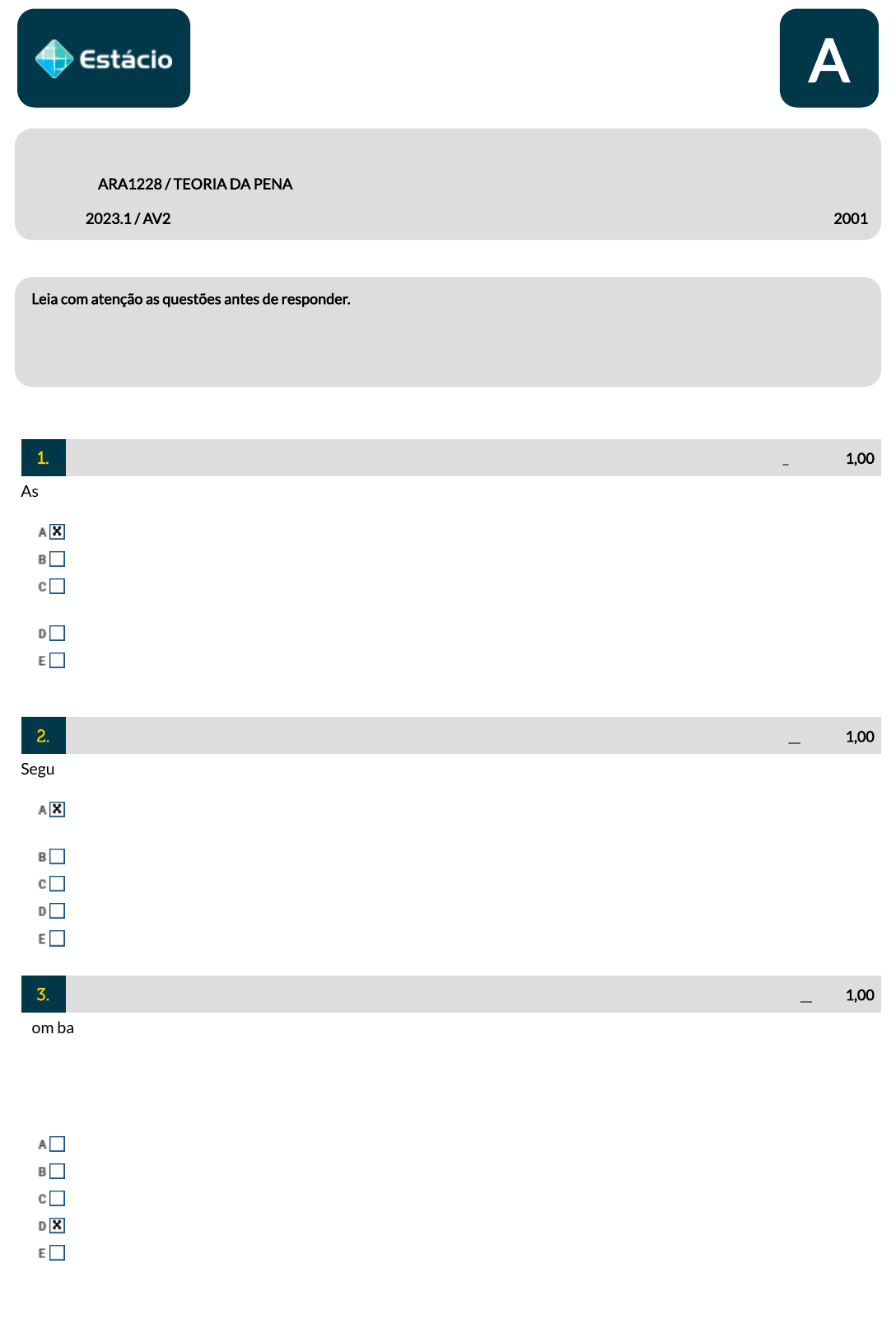 6323487028 A 22/05/2023 23:52 Nome: Matrícula: ________________ Disciplina: ARA1228 / TEORIA DA PENA Data: ___ /___ /______ Período: 2023.1 / AV2 Turma: 2001 Leia com atenção as questões antes de responder. É proibido o uso de equipamentos eletrônicos portáteis e consulta a materiais de qualquer natureza durante a realização da prova. Boa prova. 1. _______ de 1,00 Assinale a opção INCORRETA. A prescrição da pretensão punitiva em abstrato começa a correr: nos crimes permanentes, do dia praticado o ato que deu início à permanência. no caso de tentativa, do dia em que cessou a atividade criminosa. nos crimes contra a dignidade sexual de crianças e adolescentes, previstos neste Código ou em legislação especial, da data em que a vítima completar 18 (dezoito) anos, salvo se a esse tempo já houver sido proposta a ação penal. do dia em que o crime se consumou. nos de bigamia e nos de falsi�cação ou alteração de assentamento do registro civil, da data em que o fato se tornou conhecido. 2. _______ de 1,00 Segundo a teoria absoluta ou da retribuição, a pena: tem como objetivo punir o agente pelo mal causado à vítima e à sociedade. A pena seria uma retribuição ao mal causado é um ato de poder político e tem como função neutralizar o criminoso. é um ato de poder político e tem como função prevenir a prática de novas infrações criminosas. visa intimidar o sujeito, a �m de evitar que novos delitos sejam cometidos. tem a função de punir e prevenir a prática de novas infrações penais. 3. _______ de 1,00 Com base no texto a seguir, marque a opção que corresponda a espécie de concurso de crimes narrado: "Quando o agente, mediante mais de uma ação ou omissão, pratica dois ou mais crimes, idênticos ou não, aplicam-se cumulativamente as penas privativas de liberdade em que haja incorrido. No caso de aplicação cumulativa de penas de reclusão e de detenção, executa-se primeiro aquela." (art. 69 do Código Penal) Crime continuado Concurso formal Resultado diverso do pretendido Concurso material Erro na execução 4. _______ de 1,00 JUMAR foi condenado pelo crime de peculato a uma pena de 8 meses de reclusão, em razão de uma causa de diminuição de pena. Preenchidos os requisitos do art. 44 do CP, o juiz substitui a PPL por duas PRDs consistentes em prestação de serviço à comunidade e prestação pecuniária. Sobre esse fato, assinale a alternativa CORRETA: Todas as alterna�vas estão incorretas. Agiu errado o juiz, pois não cabe pena restri�va de direitos para penas de reclusão. Agiu errado o juiz, pois deveria ter fixado apenas uma pena restri�va de direitos ou multa. Agiu correto o juiz, pois deve sempre dar prioridade à prestação de serviço à comunidade e prestação pecuniária, segundo a lei. Agiu correto o juiz, pois estavam preenchidos os requisitos do art. 44 do CP, sendo de sua livre escolha quais PRDs aplicar e quantas. 5. _______ de 1,00 Em 16/11/2011, um indivíduo, réu primário com 21 anos de idade à época, cometeu furto simples (art. 155, caput, Código Penal ¿ pena de reclusão, de um a quatro anos, e multa). A denúncia foi oferecida em 10/11/2015 e recebida em 16/11/2015. Após a tramitação regular do processo, esse indivíduo foi condenado à pena de dois anos de reclusão, sentença publicada em 16/11/2018. Apenas a defesa recorreu, e o acórdão publicado em 16/11/2021 reduziu a pena para um ano de reclusão. A partir dessa situação hipotética, é correto a�rmar que não ocorreu prescrição nem em razão da pena em abstrato nem em razão da pena em concreto. houve, por pena em concreto �nal, prescrição retroativa entre o recebimento da denúncia e a sentença, pois há causa de redução do prazo prescricional. ocorreu, em razão da pena efetivamente aplicada, a prescrição superveniente entre a data de publicação da sentença e a do julgamento do acórdão. o juiz deveria ter reconhecido, com base na pena aplicada na sentença, a prescrição virtual ocorrida entre a data do fato e a do recebimento da denúncia. houve, devido à pena em concreto �nal, prescrição retroativa entre a data do fato e a do recebimento da denúncia. 6. _______ de 1,00 São causas de extinção da punibilidade, exceto: renúncia do direito de queixa ou pelo perdão aceito, nas ações públicas. abolitio criminis. prescrição, decadência ou perempção. graça ou indulto. morte do agente. 7. _______ de 1,00 "Art. 59 - O juiz, atendendo à culpabilidade, aos antecedentes, à conduta social, à personalidade do agente, aos motivos, às circunstâncias e consequências do crime, bem como ao comportamento da vítima, estabelecerá, conforme seja necessário e su�ciente para reprovação e prevenção do crime" Considerando o contido no Art. 59 do CP, o qual se estabelece na doutrina como sendo as "CIRCUNSTÂNCIAS JUDICIAIS", podemos a�rmar que estas são observadas dentro do Critério Trifásico de Aplicação de Pena quando da análise da: Primeira Fase - Pena Base. Segunda Fase - Pena Intermediária. É apenas uma mera faculdade do juízo a utilização do Art. 59 do CP, dentro do Critério Trifásico de Aplicação de Pena. Terceira Fase - Pena De�nitiva. Não existe a possibilidade de utilização do Art. 59 do CP no Critério Trifásico. Campus: PARÁ Prova Impressa em 22/05/2023 por JOAO NAZARENO NASCIMENTO MORAES JUNIOR Ref.: 6323487028 Prova Montada em 22/05/2023 8. _______ de 1,00 Mateus, inimigo de Juan, retorna para sua casa em determinada data, ocasião que �agra sua esposa e Juan juntos. Sob o domínio de violenta emoção, Mateus, com a intenção de matar tanto Juan quanto sua esposa, pega seu revólver na gaveta e, com apenas um disparo, consegue atingir ambos, causando o resultado morte nas duas vítimas. Considerando a conduta de Mateus e os resultados alcançados, estamos diante de qual modalidade de concurso de crimes? concurso formal continuado. concurso formal perfeito ou pr