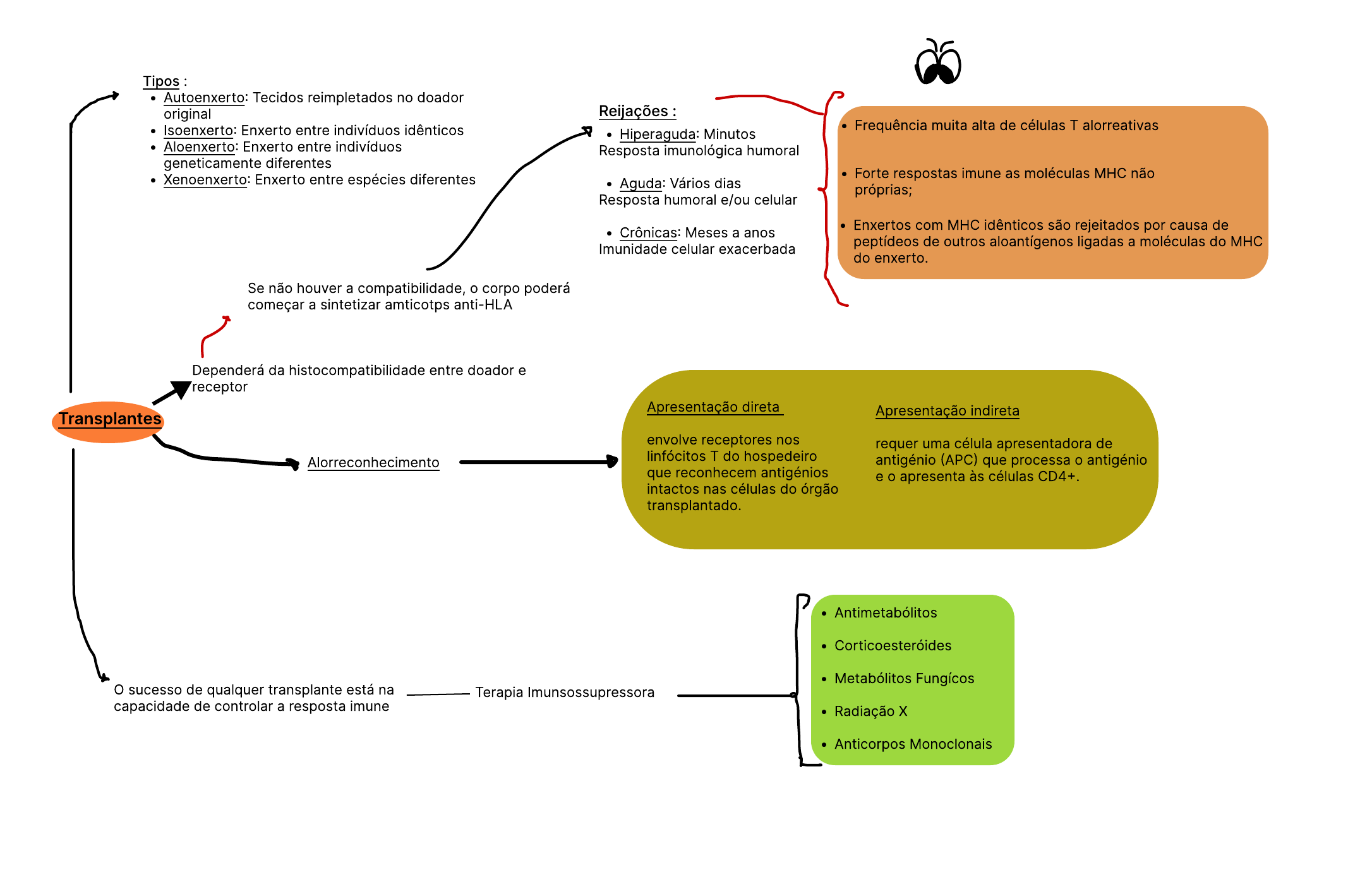 Transplantes Tipos Autoenxerto: Tecidos reimpletados no doador origina Isoenxerto: Enxerto entre indivíduos idêntico Aloenxerto: Enxerto entre indivíduos geneticamente diferente Xenoenxerto: Enxerto entre espécies diferentes Dependerá da histocompatibilidade entre doador e receptor Se não houver a compatibilidade, o corpo poderá começar a sintetizar amticotps anti-HLA Reijações : Frequência muita alta de células T alorreativas Forte respostas imune as moléculas MHC não próprias; Enxertos com MHC idênticos são rejeitados por causa de peptídeos de outros aloantígenos ligadas a moléculas do MHC do enxerto. Hiperaguda: Minutos Resposta imunológica humoral Aguda: Vários dias Resposta humoral e/ou celula Crônicas: Meses a anos Imunidade celular exacerbada O sucesso de qualquer transplante está na capacidade de controlar a resposta imune Terapia Imunsossupressora Antimetabólito Corticoesteróide Metabólitos Fungíco Radiação X Anticorpos Monoclonais Alorreconhecimento Apresentação direta envolve receptores nos linfócitos T do hospedeiro que reconhecem antigénios intactos nas células do órgão transplantado. Apresentação indireta requer uma célula apresentadora de antigénio (APC) que processa o antigénio e o apresenta às células CD4+.