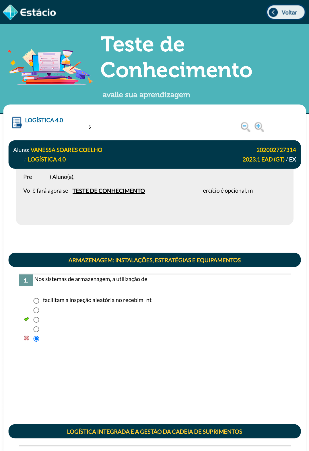 23/05/2023 23:03 Estácio: Alunos https://simulado.estacio.br/alunos/ 1/6 Teste de Conhecimento avalie sua aprendizagem Nos sistemas de armazenagem, a utilização de pallets para movimentação e armazenagem de materiais traz, dentre algumas vantagens, a de que LOGÍSTICA 4.0 Lupa DGT0038_202002727314_TEMAS Aluno: VANESSA SOARES COELHO Matr.: 202002727314 Disc.: LOGÍSTICA 4.0 2023.1 EAD (GT) / EX Prezado (a) Aluno(a), Você fará agora seu TESTE DE CONHECIMENTO! Lembre-se que este exercício é opcional, mas não valerá ponto para sua avaliação. O mesmo será composto de questões de múltipla escolha. Após responde cada questão, você terá acesso ao gabarito comentado e/ou à explicação da mesma. Aproveite para se familiarizar com este modelo de questões que será usado na sua AV e AVS. ARMAZENAGEM: INSTALAÇÕES, ESTRATÉGIAS E EQUIPAMENTOS 1. facilitam a inspeção aleatória no recebimento. podem ser utilizados para movimentar todo tipo de material. permitem disposição uniforme do estoque. têm custo baixo, se forem de alumínio. apresentam grande �exibilidade por estarem disponíveis em diversas dimensões. Data Resp.: 23/05/2023 22:57:56 Explicação: A resposta correta é: permitem disposição uniforme do estoque. LOGÍSTICA INTEGRADA E A GESTÃO DA CADEIA DE SUPRIMENTOS javascript:voltar(); javascript:voltar(); javascript:diminui(); javascript:aumenta(); 23/05/2023 23:03 Estácio: Alunos https://simulado.estacio.br/alunos/ 2/6 A combinação de interesses dos integrantes da equipe de logística e a sinergia entre planejamento e execução constituem a essência da integração da cadeia de suprimentos, fazendo-a um sistema único e coordenado. No que diz respeito aos elementos componentes do sistema de logística numa cadeia produtiva, conclui-se que: O comércio eletrônico vem crescendo rapidamente em todo o mundo e já assume grande parcela das vendas de grandes empresas varejistas, tornando a Logística ainda mais importante para sustentar os resultados atuais. Essa modalidade de comércio apresenta algumas características que a distinguem do comércio tradicional, EXCETO por: Para atender à demanda dos clientes, produtos devem ser distribuídos de maneira otimizada em termos de custo e tempo de atendimento. Muitas empresas optam por sistemas de estoques de múltiplos estágios. Os centros de distribuição são estágios importantes e que têm diversas funções na gestão da cadeia de suprimentos, EXCETO: 2. a cadeia de suprimentos objetiva utilizar valores individuais em seus elos e o segmento que não atender às metas deve substituir seus elementos. o sentido dos esforços não importa para o sucesso do sistema; o que vale é cada um ter sua direção. a cadeia de suprimentos deverá ser formatada com o objetivo de manter a lucratividade do processo comercial entre as empresas. nas cadeias de suprimento é de fundamental importância que cada um de seus elementos canalizem sua força de trabalho para suas atividades meio. a nova concorrência entre as cadeias de suprimentos não se baseia na e�ciência de elos individuais, e, sim, na capacidade da cadeia como um todo. Data Resp.: 23/05/2023 22:59:35 Explicação: A resposta correta é: a nova concorrência entre as cadeias de suprimentos não se baseia na e�ciência de elos individuais, e, sim, na capacidade da cadeia como um todo. 3. maior con�abilidade das transações comerciais. rapidez no lançamento de novos produtos e campanhas. coleta de mais informações sobre o consumidor e seus hábitos de compra. forte dependência de investimentos em Tecnologia da Informação. maior agilidade na relação entre consumidores e vendedores. Data Resp.: 23/05/2023 23:00:09 Explicação: A resposta correta é: maior con�abilidade das transações comerciais. 4. reduzir o número de rotas de transporte. coordenar o suprimento de matérias-primas com o ritmo de produção. simpli�car os meios de comunicação entre estágios de distribuição. possibilitar o uso de diversos modais de transporte. dispor de pontos para consolidação de cargas, crossdocking e merge-in-transit. Data Resp.: 23/05/2023 23:00:33 Explicação: 23/05/2023 23:03 Estácio: Alunos https://simulado.estacio.br/alunos/ 3/6 Quanto ao modal ferroviário, assinale a alternativa correta: A logística empresarial tornou-se, com o passar dos tempos, cada vez mais importante para a competitividade das empresas, isso porque uma gestão adequadamente realizada pode proporcionar uma grande vantagem competitiva em seu setor de atuação. Apesar de muito semelhantes é importante que diferenciemos dois conceitos relacionados fundamentais na logística empresarial. Como chamamos o processo de guarda de matérias-primas e produtos acabados e o processo de gestão desses inventários, respectivamente? A resposta correta é: coordenar o suprimento de matérias-primas com o ritmo de produção. GESTÃO DE TRANSPORTES 5. O modal ferroviário só se justi�ca ao transportar produtos de altíssimo valor agregado. Os operadores de transporte multimodal não costumam possui expertise para transporte ferroviário. O Veículo conhecido como roadrailer possui fácil adaptação da rodovia para as ferrovias. A navegação de cabotagem tornou o modal ferroviário obsoleto no Brasil. O modal ferroviário deve ser usado para transporte majoritário de produtos com alto valor agregado. Data Resp.: 23/05/2023 23:01:03 Explicação: A resposta correta é: O Veículo conhecido como roadrailer possui fácil adaptação da rodovia para as ferrovias. ARMAZENAGEM: INSTALAÇÕES, ESTRATÉGIAS E EQUIPAMENTOS 6. Armazenagem e planejamento de demanda Planejamento de demanda e armazenagem Armazenagem e estoque Planejamento de armazéns e gestão Planejamento de estoques e gestão de armazéns Data Resp.: 23/05/2023 23:01:33 Explicação: É muito importante diferenciar os conceitos de armazenagem e estoque. Apesar de muito semelhantes, o primeiro se refere à guarda de pro