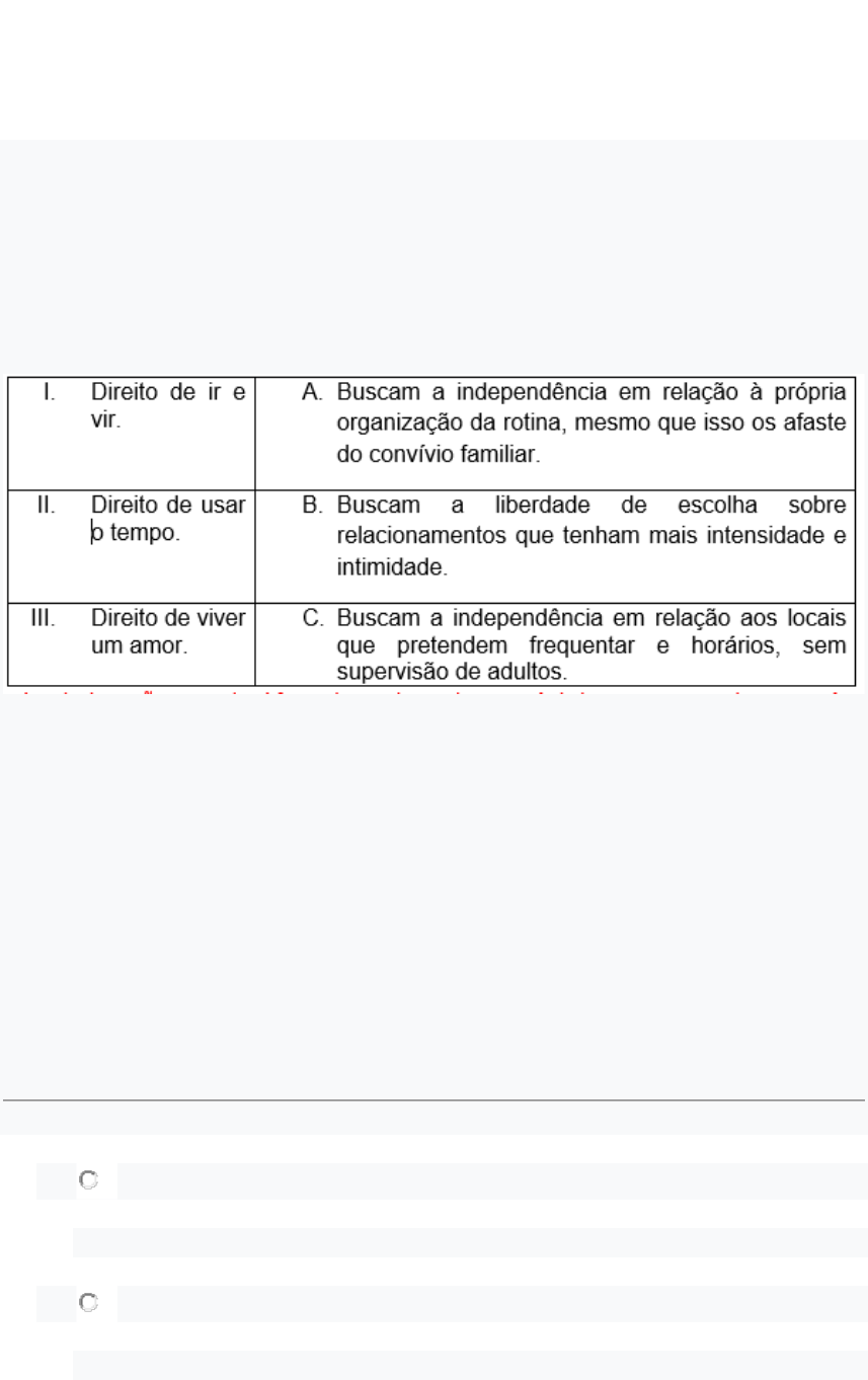 Psicologia do desenvolvimento e da aprendizagem 1) Aberastury e Knobel (2003) apontam que a maioria dos adolescentes busca realizar três “direitos” essenciais à constituição de sua identidade, durante o processo de individuação. Leia as afirmativas a seguir e associe as duas colunas conforme as perspectivas de cada “direito”: Início da descrição. O quadro é formado por duas colunas e três linhas. A primeira coluna traz três opções: 1. Direito de ir e vir; 2. Direito de usar o tempo; 3. Direito de viver um amor. A segunda coluna traz também três opções: A. Buscam a independência em relação à própria organização da rotina, mesmo que isso os afaste do convívio familiar; B. Buscam a liberdade de escolha sobre relacionamentos que tenham mais intensidade e intimidade; C. Buscam a independência em relação aos locais que pretendem frequentar e horários, sem supervisão de adultos. Fim da descrição. ABERASTURY, A.; KNOBEL, M. Adolescência normal: enfoque psicanalítico. Porto Alegre, RS: Artmed, 2003. Assinale a alternativa que traz a associação correta entre as colunas. Alternativas: • I – B; II – A; III – C. • I – B; II – C; III – A. • I – C; II – A; III – B. CORRETO • I – A; II – B; III – C. • I – C; II – B; III – A. Código da questão: 74174 2) A adolescência é compreendida como a passagem da fase da infância para a fase da juventude, permeada por uma transição que traz grandes mudanças de ordem física, cognitiva e psicossocial. Sobre a captação de recursos para esta empresa, analise as afirmativas a seguir: I. Puberdade é um processo físico, biológico e fisiológico que conduz o indivíduo à maturidade sexual e à capacidade de se reproduzir. II. O estirão de nascimento ocorre na puberdade e engloba o aumento rápido de altura, peso, musculatura e ossatura. III. No estágio operatório formal, o adolescente já é capaz de dominar o pensamento abstrato, isto é, refletir e chegar a conclusões acerca de temas mais elaborados que não se constituem fisicamente e que podem sofrer variação de cultura para cultura, tais como fé, amor, religião, política, liberdade, exploração, entre outros. IV. A indistinção é um processo da fase da adolescência que consiste na busca pela autonomia, individualidade, diferenciação dos demais e construção da própria identidade realizado pelo jovem, no qual ele busca criar uma fronteira para a influência dos pais. V. Na adolescência, ocorre um grande desenvolvimento cognitivo, ou seja, observa-se rapidez, precisão e alta capacidade em relação ao processamento das informações. Observa-se também melhor uso de recursos conceituais e abstratos, envolvimento intenso com temas que sejam do interesse do adolescente, uso cada vez mais apropriado e aprofundado da língua materna, bem como alto desenvolvimento do raciocínio e da lógica, entre outros aspectos. Assinale a alternativa que apresenta corretamente quais afirmativas são corretas. Alternativas: • II, IV e V, apenas. INCORRETO • I, II e IV, apenas. • I, II e V, apenas. • I, III e V, apenas. • II, III e IV, apenas. Código da questão: 74175 3) Cognição é a capacidade do ser humano de adquirir conhecimentos. Em relação a este complexo processo psicológico, analise as afirmativas a seguir e assinale-as com V (verdadeiro) ou F (falso): ( ) Este processo exige maturação cerebral e física (não é possível aprender a falar sem que as estruturas cerebrais sejam capazes de suportar o novo conhecimento e as novas habilidades). ( ) As emoções exercem importante papel no processo de aprendizagem. ( ) Os estímulos do meio ambiente e do meio social dos quais a criança participa não exercem influência sobre a cognição, já que este é um processo psicológico. ( ) A motivação do próprio indivíduo não tem relação com o aprender. ( ) A capacidade de manter atenção concentrada é um dos fatores que favorece o desenvolvimento cognitivo. Assinale a alternativa que contenha a sequência correta. Alternativas: • F – V – F – V – F. • V – F – F – V – V. • F – V – F – V – F. • F – F – V – V – V. • V – V – F – F – V. CORRETO Código da questão: 74167 4) Os processos psicológicos são sustentadores do desenvolvimento do ser humano e se relacionam com o sistema motor e com o processamento cognitivo. Os processos psicológicos básicos são: percepção, atenção, memória, aprendizagem, motivação, afetividade, inteligência, pensamento e linguagem. Sobre o desenvolvimento dos processos psicológicos básicos, analise as afirmativas a seguir: I. O circuito percepção-atenção-memória-aprendizagem envolve a ativação e a utilização de células nervosas, processamento mental e respostas, proporcionando eventos que, repetidos, podem gerar aprendizagem. II. A motivação é um processo psicológico básico que regula a ação do indivíduo e está presente a partir dos sete anos de idade, aproximadamente, quando a criança ingressa no estádio operatório-concreto. A motivação é o que os leva a explorar o mundo e aprender. III. A motivação está associada a fatores internos (como desejos e metas a serem alcançados pessoalmente) e pode estar relacionada a fatores externos (associada a um estímulo extrínseco: tirar boas notas nas provas para impressionar os pais, por exemplo). IV. O pensamento e a linguagem significam a compreensão e a gestão das emoções, ou seja, o entendimento que temos emoções e que estas podem ser ativadas e canalizadas para resolução de situações ou problemas do cotidiano. V. A inteligência é o processo que compreende a análise de situações complexas ou problemáticas, seguida da localização ou criação de respostas a cada uma das situações, de forma a viver melhor. Assinale a alternativa que apresenta corretamente quais afirmativas são corretas. Alternativas: • I, II e IV, apen