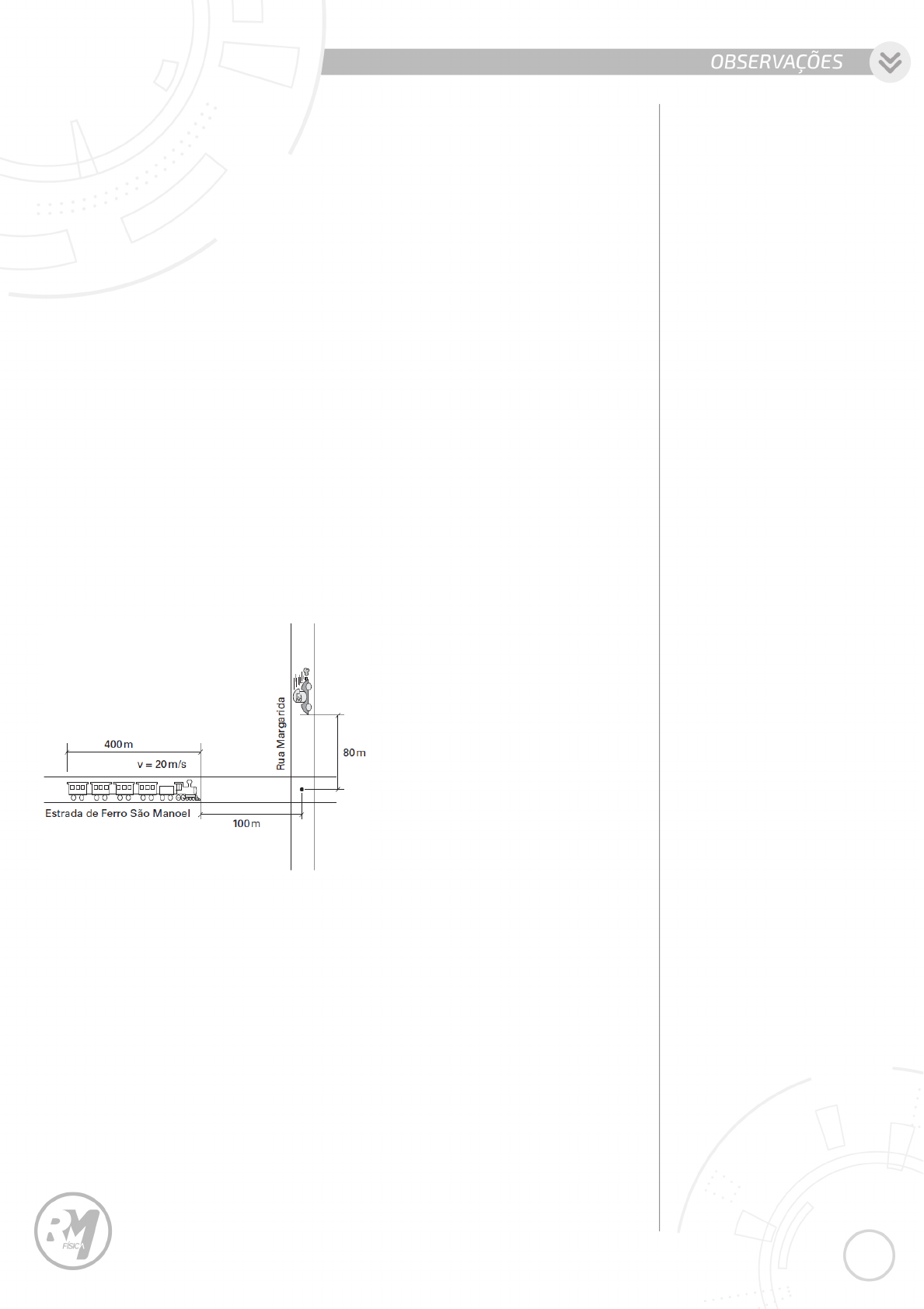 LISTA DE EXERCÍCIOS – FÍSICA PROF. CEZAR HENRIQUE TEXTO PARA AS DUAS PRÓXIMAS QUESTÕS Vettel vence mais uma! O alemão Sebastian Vettel reforçou o seu domínio no início da temporada 2011 da Fórmula 1 e venceu o Grande Prêmio da Malásia neste domingo (10/4/2011) novamente sem ser muito incomodado pelos adversários. Após largar na pole position, o alemão só deixou a liderança quando parou para trocar os pneus. Com duas paradas que duraram 10 s ao todo, Vettel ficou em movimento por 1h37min30s para vencer o circuito da malásia, o qual tem 56 voltas com 5543 m cada. (Adaptado de http://esporte.uol.com.br/f1) 01. A velocidade escalar média desenvolvida por Vettel durante toda a corrida foi aproximadamente: a) 190,5 km/h. b) 190,7 km/h. c) 190,9 km/h. d) 191,0 km/h. e)191,2 km/h. 02. O piloto Mark Webber (AUS/RBR-Renault) fez a volta mais rápida da corrida (46a) desenvolvendo velocidade escalar média 55,43 m/s. O tempo gasto por Webber para completar essa volta foi: a) 1 min 20 s. b) 1 min 30 s. c) 1 min 40 s. d) 1 min 50 s. e) 2 min. 03. A figura ilustra a vista aérea de uma cidade onde a Rua Margarida cruza com a linha de trem da Estrada de Ferro São Manoel. Um automóvel de tamanho desprezível cruza a linha de trem, por onde circula uma composição de largura desprezível, mas de comprimento 400m e velocidade 20m/s. Num certo momento as distâncias entre as dianteiras do trem, do automóvel e o ponto de cruzamento estão indicadas na figura. Para não haver colisão entre o trem e o automóvel a velocidade do automóvel tem que ser maior que v1 ou menor que v2. Dessa forma v1 e v2 valem respectivamente: A) 3,2m/s e 4m/s B) 4m/s e 3,2m/s C) 8,8m/s e 3,2m/s D) 16m/s e 3,2m/s E) 3,2m/s e 16m/s 04. Um veículo movimenta-se numa pista retilínea de 9,0km de extensão. A velocidade máxima que ele pode desenvolver no primeiro terço do comprimento da pista é 15m/s e nos dois terços seguintes é de 20m/s. O veículo percorreu esta pista no menor tempo possível. A sua velocidade média em todo o percurso foi: A) 18m/s B) 17m/s C) 16m/s D) 15m/s E) 14m/s 05. Um projeto da empresa brasileira Questtonó, chamado Digital Rails, supõe duas faixas exclusivas para veículos elétricos autônomos que trafegam com velocidade padrão e em sincronia com os semáforos. Conforme um comboio autônomo avançasse por uma via, os semáforos se abririam na sequência, em um cruzamento após o outro, levando em consideração a velocidade adequada, de forma que os veículos realizariam grande parte do trajeto sem ter de acelerar, frear ou parar. Em uma simulação, o carro comum se locomove com velocidade constante, freia uniformemente até parar em um semáforo e, depois, acelera uniformemente até atingir novamente outra velocidade constante; e o carro autônomo permanece todo o trajeto com velocidade constante. Nessa simulação, os gráficos que melhor representam o movimento desses dois carros, respectivamente, são: 06. Um trem de comprimento 100 m está estacionado com sua dianteira exatamente na entrada de uma ponte de 200 m de extensão. No instante zero o trem inicia a travessia da ponte. O gráfico abaixo mostra a velocidade escalar do trem em função do tempo. O intervalo de tempo para que o trem ultrapasse totalmente a ponte será: a) 12,5s b) 5s c) 7,5s d) 25s e) 17,5s 07. A distância de parada dos veículos pode ser afetada por uma grande variedade de parâmetros, entre eles o motorista, o veículo, o sistema de freio, o pneu, o pavimento e as condições ambientais. No tempo zero, o motorista reconhece o perigo e, depois do seu tempo de reação, começa a usar o freio. Depois do tempo de resposta do sistema de freio, a desaceleração do veículo começa, como mostrado no gráfico. Qual é a distância, em metros, percorrida pelo veículo exemplificado no texto? a) 14 b) 23 c) 27 d) 31 e) 35 08. Você foi contratado para sincronizar os quatro semáforos de uma avenida, indicados pelas letras e conforme a figura. Os semáforos estão separados por uma distância de Segundo os dados estatísticos da companhia controladora de trânsito, um veículo, que está inicialmente parado no semáforo tipicamente parte com aceleração constante de até atingir a velocidade de e, a partir daí, prossegue com velocidade constante. Você deve ajustar os semáforos A, B e C de modo que eles mudem para a cor verde quando o veículo estiver a de cruzá-los, para que ele não tenha que reduzir a velocidade em nenhum momento. Considerando essas condições, aproximadamente quanto tempo depois da abertura do semáforo os semáforos e devem abrir, respectivamente? a) e b) e c) e d) e e) e O,A, B C, 500 m. O, 21m s• 172 km h• 100 m O A,B C 20 s, 45 s 70 s. 25 s, 50 s 75 s. 28 s, 42 s 53 s. 30 s, 55 s 80 s. 35 s, 60 s 85 s. 09. A agricultura de precisão reúne técnicas agrícolas que consideram particularidades locais do solo ou lavoura a fim de otimizar o uso de recursos. Uma das formas de adquirir informações sobre essas particularidades é a fotografia aérea de baixa altitude realizada por um veículo aéreo não tripulado (vant). Na fase de aquisição é importante determinar o nível de sobreposição entre as fotografias. A figura ilustra como uma sequência de imagens é coletada por um vant e como são formadas as sobreposições frontais. O operador do vant recebe uma encomenda na qual as imagens devem ter uma sobreposição frontal de em um terreno plano. Para realizar a aquisição das imagens, seleciona uma altitude fixa de voo de a uma velocidade constante de A abertura da câmera fotográfica do vant é de Considere Com que intervalo de tempo o operador deve adquirir duas imagens consecutivas? a) segundos b) segundos c) segundos d) segundos e) segundos 10. O sistema de freios ABS (Anti-lock Braking System) aumenta a segurança dos veículos, fazendo com que as rodas não travem e continuem girando, evitando que os pneus derrapem. Uma caminhonete equipada com esse sistem
