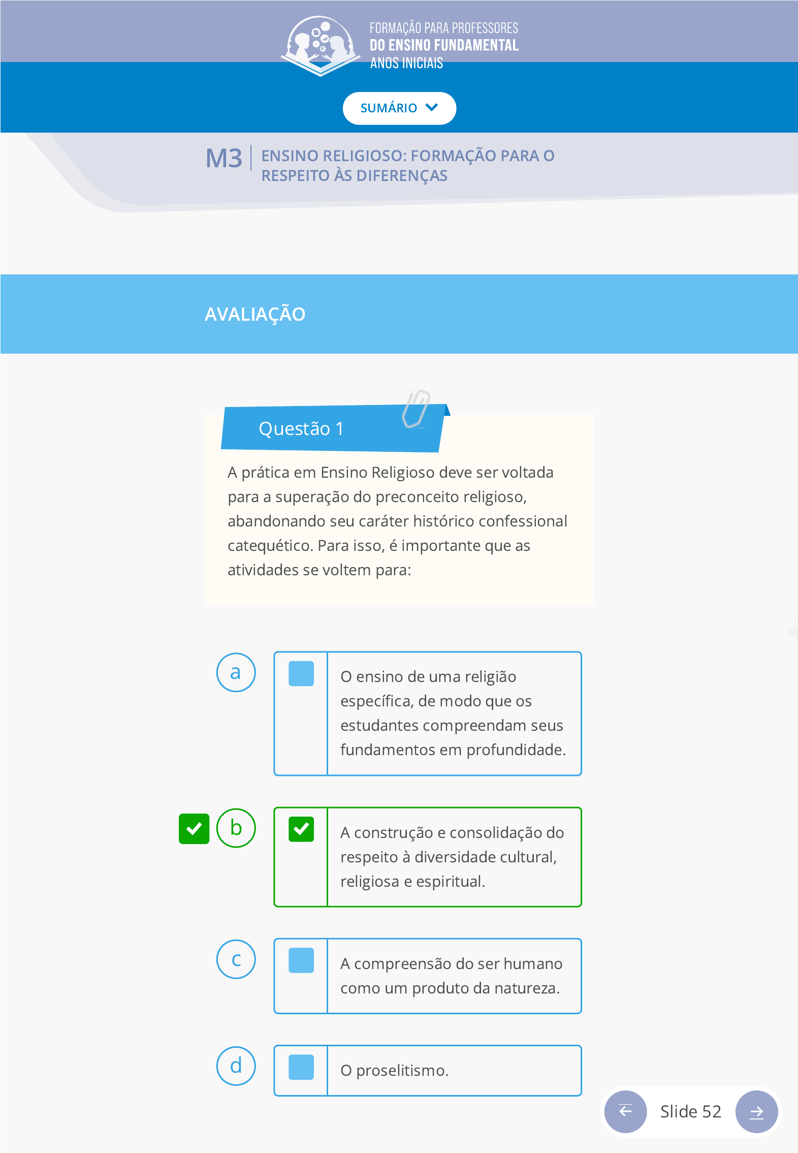 06/06/2023, 13:28 ENSINO RELIGIOSO: FORMAÇÃO PARA O RESPEITO ÀS DIFERENÇAS https://avamec.mec.gov.br/#/instituicao/seb/curso/14881/unidade/8216/acessar?continue=false 1/6 AVALIAÇÃO A prática em Ensino Religioso deve ser voltada para a superação do preconceito religioso, abandonando seu caráter histórico confessional catequético. Para isso, é importante que as atividades se voltem para: O ensino de uma religião especí�ca, de modo que os estudantes compreendam seus fundamentos em profundidade. a A construção e consolidação do respeito à diversidade cultural, religiosa e espiritual. b A compreensão do ser humano como um produto da natureza. c O proselitismo.d Questão 1 M3 ENSINO RELIGIOSO: FORMAÇÃO PARA O RESPEITO ÀS DIFERENÇAS SUMÁRIO Slide 52 https://avamec.mec.gov.br/ava-mec-ws/instituicao/seb/conteudo/modulo/4524/mod3/uni5/slide53.html https://avamec.mec.gov.br/ava-mec-ws/instituicao/seb/conteudo/modulo/4524/mod3/uni5/slide51.html 06/06/2023, 13:28 ENSINO RELIGIOSO: FORMAÇÃO PARA O RESPEITO ÀS DIFERENÇAS https://avamec.mec.gov.br/#/instituicao/seb/curso/14881/unidade/8216/acessar?continue=false 2/6 Os objetivos do Ensino Religioso, no ensino fundamental, conduzem a uma prática pedagógica que leva os estudantes a compreenderem a liberdade de consciência e de crença como direito fundamental de cada pessoa. Dessa forma, ao abordar os objetos de conhecimento, o professor deve privilegiar: O diálogo entre as diferentes perspectivas religiosas e seculares de vida. a O aprofundamento dos estudos sobre uma única religião. b A ideia de religiosidade para combater o ateísmo. c Aspectos da cultura local sem considerar o universal, pois a educação deve ser contextualizada. d Sobre a importância da utilização da linguagem artística como recurso didático-pedagógico no componente curricular do Ensino Religioso, assinale a alternativa que NÃO se adequa. A arte promove a re�exão dos estudantes sobre o mundo, sobre a própria atuação e sobre a Questão 2 Questão 3 Slide 52 https://avamec.mec.gov.br/ava-mec-ws/instituicao/seb/conteudo/modulo/4524/mod3/uni5/slide53.html https://avamec.mec.gov.br/ava-mec-ws/instituicao/seb/conteudo/modulo/4524/mod3/uni5/slide51.html 06/06/2023, 13:28 ENSINO RELIGIOSO: FORMAÇÃO PARA O RESPEITO ÀS DIFERENÇAS https://avamec.mec.gov.br/#/instituicao/seb/curso/14881/unidade/8216/acessar?continue=false 3/6 a atuação das demais pessoas nesse mundo, ou seja, aspectos importantes na prática do Ensino Religioso. A arte possui um imenso potencial para mobilizar sentimentos, pensamentos, percepções e sensibilidades, aspectos importantes para motivar os estudantes a debaterem sobre temas da realidade. b Utilizando a arte, os estudantes podem consolidar aprendizagens construídas por meio do fazer artístico, da criação. c A arte proporciona aos estudantes a visão da religião como expressão divina, cujos conteúdos não se conectam com a realidade concreta. d A prática pedagógica em Ensino Religioso deve conduzir para a compreensão de si mesmo e da sociedade, a partir da re�exão sobre o comportamento humano. Para que esse princípio seja materializado no dia a dia da sala de aula, é fundamental que: Apenas a ciência fundamente a prática pedagógica. a Questão 4 Slide 52 https://avamec.mec.gov.br/ava-mec-ws/instituicao/seb/conteudo/modulo/4524/mod3/uni5/slide53.html https://avamec.mec.gov.br/ava-mec-ws/instituicao/seb/conteudo/modulo/4524/mod3/uni5/slide51.html 06/06/2023, 13:28 ENSINO RELIGIOSO: FORMAÇÃO PARA O RESPEITO ÀS DIFERENÇAS https://avamec.mec.gov.br/#/instituicao/seb/curso/14881/unidade/8216/acessar?continue=false 4/6 O estudo dos objetos de conhecimento se faça, unicamente, pelo viés cultural. b A compreensão dos objetos em estudo se faça pelo viés cientí�co e cultural, e não ideológico. c A prática pedagógica seja fundamentada em aspectos ideológicos. d Sobre o processo de avaliação no Ensino Religioso, analise as a�rmações a seguir: I. É importante que sejam de�nidos critérios de avaliação, com base nos objetivos de ensino, considerando as potencialidades e as limitações dos estudantes. II. É fundamental que sejam oferecidas aos estudantes diferentes situações, procedimentos e instrumentos para a veri�cação do aprendizado construído. III. Deve-se promover uma avaliação predominantemente qualitativa, processual, cumulativa e que visa o efetivo aprendizado. Estão corretas as a�rmações: I e II.a II e III.b Questão 5 Slide 52 https://avamec.mec.gov.br/ava-mec-ws/instituicao/seb/conteudo/modulo/4524/mod3/uni5/slide53.html https://avamec.mec.gov.br/ava-mec-ws/instituicao/seb/conteudo/modulo/4524/mod3/uni5/slide51.html 06/06/2023, 13:28 ENSINO RELIGIOSO: FORMAÇÃO PARA O RESPEITO ÀS DIFERENÇAS https://avamec.mec.gov.br/#/instituicao/seb/curso/14881/unidade/8216/acessar?continue=false 5/6 Refazer Atividade Respondidas 5 de 5 questões Progresso do Módulo VOLTAR 52 de 53 AVANÇAR 1 2 3 4 5 6 7 8 9 10 11 12 13 14 15 16 17 18 19 20 21 22 23 24 25 26 27 28 29 30 31 32 33 34 35 36 I e III.c I, II e III. d Parabéns! Você chegou ao �nal da Formação em Ensino Religioso nos Anos Iniciais do Ensino Fundamental! Esperamos que você tenha aproveitado o conteúdo estudado. Caso queira aprofundar ainda mais seus estudos, consulte a lista de referências no próximo slide. Slide 52 https://avamec.mec.gov.br/ava-mec-ws/instituicao/seb/conteudo/modulo/4524/mod3/uni5/slide51.html https://avamec.mec.gov.br/ava-mec-ws/instituicao/seb/conteudo/modulo/4524/mod3/uni5/slide53.html https://avamec.mec.gov.br/ava-mec-ws/instituicao/seb/conteudo/modulo/4524/mod3/uni1/slide01.html https://avamec.mec.gov.br/ava-mec-ws/instituicao/seb/conteudo/modulo/4524/mod3/uni1/slide02.html https://avamec.mec.gov.br/ava-mec-ws/instituicao/seb/conteudo/modulo/4524/mod3/uni1/slide03.html https://avamec.mec.gov.br/ava-mec-ws/instituicao/seb/conteudo/modulo/4524/mod3/uni1/slide04.html https://av