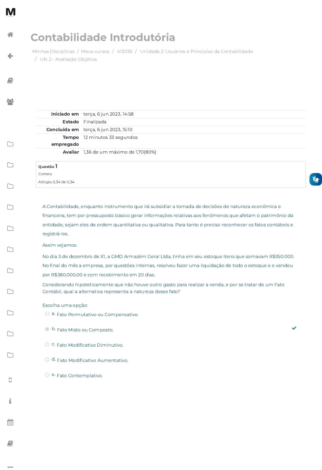 06/06/2023, 15:10 UN 2 - Avaliação Objetiva: Revisão da tentativa https://avap.multivix.edu.br/mod/quiz/review.php?attempt=3178985&cmid=1305924 1/5 Minhas Disciplinas / Meus cursos / 413035 / Unidade 2: Usuários e Princípios da Contabilidade / UN 2 - Avaliação Objetiva Contabilidade Introdutória Iniciado em terça, 6 jun 2023, 14:58 Estado Finalizada Concluída em terça, 6 jun 2023, 15:10 Tempo empregado 12 minutos 33 segundos Avaliar 1,36 de um máximo de 1,70(80%) Questão 1 Correto Atingiu 0,34 de 0,34 A Contabilidade, enquanto instrumento que irá subsidiar a tomada de decisões de natureza econômica e �nanceira, tem por pressuposto básico gerar informações relativas aos fenômenos que afetam o patrimônio da entidade, sejam eles de ordem quantitativa ou qualitativa. Para tanto é preciso reconhecer os fatos contábeis e registrá-los. Assim vejamos: No dia 3 de dezembro de X1, a GMD Armazém Geral Ltda, tinha em seu estoque itens que somavam R$350.000. No �nal do mês a empresa, por questões internas, resolveu fazer uma liquidação de todo o estoque e o vendeu por R$380,000,00 e com recebimento em 20 dias. Considerando hipoteticamente que não houve outro gasto para realizar a venda, e por se tratar de um Fato Contábil, qual a alternativa representa a natureza desse fato? Escolha uma opção: a. Fato Permutativo ou Compensativo. b. Fato Misto ou Composto. c. Fato Modi�cativo Diminutivo. d. Fato Modi�cativo Aumentativo. e. Fato Contemplativo. https://avap.multivix.edu.br/my/ https://avap.multivix.edu.br/course/view.php?id=20040 https://avap.multivix.edu.br/course/view.php?id=20040§ion=3 https://avap.multivix.edu.br/mod/quiz/view.php?id=1305924 https://avap.multivix.edu.br/my/ https://avap.multivix.edu.br/course/view.php?id=20040 https://avap.multivix.edu.br/user/index.php?id=20040 https://avap.multivix.edu.br/course/view.php?id=20040§ion=1 https://avap.multivix.edu.br/course/view.php?id=20040§ion=2 https://avap.multivix.edu.br/course/view.php?id=20040§ion=3 https://avap.multivix.edu.br/course/view.php?id=20040§ion=4 https://avap.multivix.edu.br/course/view.php?id=20040§ion=5 https://avap.multivix.edu.br/course/view.php?id=20040§ion=6 https://avap.multivix.edu.br/course/view.php?id=20040§ion=7 https://avap.multivix.edu.br/course/view.php?id=20040§ion=8 https://avap.multivix.edu.br/course/view.php?id=20040§ion=9 https://avap.multivix.edu.br/course/view.php?id=20040§ion=10 https://avap.multivix.edu.br/course/view.php?id=20040§ion=11 https://avap.multivix.edu.br/hooks/portal/ https://avap.multivix.edu.br/mod/page/view.php?id=1252%2F%22%20target%3D%22_blank https://avap.multivix.edu.br/calendar/view.php/ https://avap.multivix.edu.br/local/staticpage/view.php?page=biblioteca https://portalweb.multivix.edu.br/gabaritos/login.aspx https://avap.multivix.edu.br/ 06/06/2023, 15:10 UN 2 - Avaliação Objetiva: Revisão da tentativa https://avap.multivix.edu.br/mod/quiz/review.php?attempt=3178985&cmid=1305924 2/5 Questão 2 Correto Atingiu 0,34 de 0,34 Assinale a alternativa em que são listados unicamente usuários externos das informações contábeis. Escolha uma opção: Acionistas Minoritários, Gestores e Clientes. Clientes, Fornecedores e Acionistas Minoritários. Fornecedores, Conselho de Administração e Acionistas Controladores. Acionistas Controladores, Conselho de Administração e Fisco. Fisco, Acionistas Minoritários e Gestores. https://avap.multivix.edu.br/my/ https://avap.multivix.edu.br/course/view.php?id=20040 https://avap.multivix.edu.br/user/index.php?id=20040 https://avap.multivix.edu.br/course/view.php?id=20040§ion=1 https://avap.multivix.edu.br/course/view.php?id=20040§ion=2 https://avap.multivix.edu.br/course/view.php?id=20040§ion=3 https://avap.multivix.edu.br/course/view.php?id=20040§ion=4 https://avap.multivix.edu.br/course/view.php?id=20040§ion=5 https://avap.multivix.edu.br/course/view.php?id=20040§ion=6 https://avap.multivix.edu.br/course/view.php?id=20040§ion=7 https://avap.multivix.edu.br/course/view.php?id=20040§ion=8 https://avap.multivix.edu.br/course/view.php?id=20040§ion=9 https://avap.multivix.edu.br/course/view.php?id=20040§ion=10 https://avap.multivix.edu.br/course/view.php?id=20040§ion=11 https://avap.multivix.edu.br/hooks/portal/ https://avap.multivix.edu.br/mod/page/view.php?id=1252%2F%22%20target%3D%22_blank https://avap.multivix.edu.br/calendar/view.php/ https://avap.multivix.edu.br/local/staticpage/view.php?page=biblioteca https://portalweb.multivix.edu.br/gabaritos/login.aspx https://avap.multivix.edu.br/ 06/06/2023, 15:10 UN 2 - Avaliação Objetiva: Revisão da tentativa https://avap.multivix.edu.br/mod/quiz/review.php?attempt=3178985&cmid=1305924 3/5 Questão 3 Correto Atingiu 0,34 de 0,34 A Contabilidade brasileira, após 2007 com a promulgação da Lei 11.637/87, e com base nos CPCs, gerou a maior mudança desde 1976 (Lei 6.404/76), em que estão ocorrendo as mudanças de princípios contábeis e harmonização dos conceitos internacionais para aplicação na nossa Contabilidade Brasileira, trazendo maior comparabilidade de operações realizadas entre outras empresas no mundo, facilitando também a confecção de relatórios gerenciais (por centro de lucros e centros de custos) entre as diversas unidades de uma multinacional. Assim existe um grande auxílio na tomada de decisões diárias, e de melhor avaliação dos ativos e passivos reais da empresa. Portanto, a Contabilidade tem se evoluído e se dinamizado através dos tempos, produzindo informações com maior con�abilidade e veracidade, aumentando o nível de controle das operações empresariais e trazendo maior segurança nos investimentos das companhias. BORINELLI, Márcio Luiz; PIMENTEL, Renê Coppe. Curso de contabilidade para gestores, analistas e outros pro�ssionais. Relato pro�ssional: ESPÍRITO SANTO, Marcelo Muzy do. FIPECAFI-Fundação Instituto de Pesquisas Contábeis, Atuariais e Financeiras, FEA/USP. Ed. Atlas: São Paul