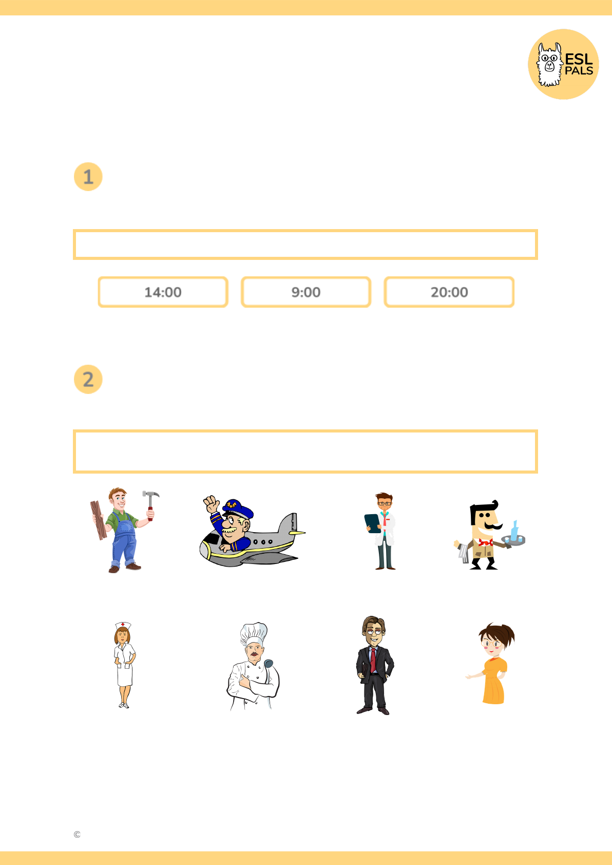 INTRODUCTIONS: VERB TO BE WARM UP Match the greeting to the correct time. “Good morning” “Good evening” “Good afternoon” 1. Can you name two other ways to greet people in English? JOBS Match the words to the pictures. teacher businessman doctor nurse carpenter pilot waiter chef 1. ______________ 2. ______________ 3. ______________ 4. ______________ 5. ______________ 6. ______________ 7. ______________ 8. ______________ ESL Pals 1 General English DIALOGUES Read the short dialogue and match it to the correct picture. Dialogue 1: John: Hello everyone. It is nice to meet you. Group: Hi! John: I am John and I am 24 year old. I am happy to join the reading club. Dialogue 2: Sandra: Hello. This is Sandra speaking. Customer: Hello Sandra. Can you please put me through to Adam? Sandra: Yes, of course. Please hold. Dialogue 3: Ella: Hello. I am Ella. I am 32 years old. Nice to meet you. Sam: Hello Ella, I am Sam. I am 38 years old. I am from England. Ella: That’s great. I am from Australia. Dialogue 4: Sarah: Hi! I am Sarah and this is my son, Jackson. Jade: Hello! I’m Jade! This is my daughter Anna. It is nice to meet you. Sarah: Nice to meet you too. We are from The USA. Jade: That’s great. We are from England. a. b. c. d. ESL Pals 2 General English THE VERB TO BE Read the theory about the verb to be and then complete the tasks. Affirmative (+) Negative (-) Subject Present Subject Present I am I Am not You are You Are not He / She / It is He / She / It Is not We are We Are not They are They Are not Examples ● I am Sarah. ● He is 25 years old. ● She is a chef. ● We are young. ● They are from Japan. ● I am not John. ● He is not 10 years old. ● She is not a banker. ● We are not young. ● They are not from England. Task 1: Fix the mistakes in the sentences. 1. I are Jonathan. 2. He am not 6 years old. 3. They is from The USA. 4. We am 20 years old. 5. She are not a dentist. 6. It are raining. ESL Pals 3 General English Task 2: Complete the sentences with am / is / are. 1. Susana _________ 23 years old. 2. We _________ from Australia. 3. He _________ a vet. 4. They _________ old. 5. She _________ a doctor. 6. I _________ 20 years old. Task 3: Read the statement and say if it's true or false for you. 1. I am a doctor. 2. I am not a firefighter. 3. I am 19 years old. 4. I am not 99 years old. 5. I am from Canada. 6. I am not from Spain. Task 4: Answer the questions. 1. How old are you? 2. Where are you from? 3. What is your job? ESL Pals 4 General English CONTRACTIONS Read the theory about contractions and then complete the task. Affirmative (+) Negative (-) Contraction Contraction I am I’m I am not I’m not You are You’re You are not You aren’t / You’renot He / She / It is He’s / She’s / It’s He / She / It is not He isn’t / He’s not She isn’t / She’s not It isn’t / It’s not We are We’re We are not We aren’t /We’re not They are They’re They are not They aren’t /They’re not Examples ● I’m Sarah. ● He’s 25 years old. ● She’s a chef. ● We’re young. ● They’re from Japan. ● I’m not John. ● He isn’t 10 years old. ● She isn’t a banker. ● We aren’t young. ● They aren’t from England. ESL Pals 5 General English Task: Rewrite the sentences using contractions. 1. I am 20 years old. 2. He is not a doctor. 3. You are not a chef. 4. We are not old. 5. We are from Canada. 6. I am not from South Africa. 7. She is a nurse. 8. They are from China. 9. It is not raining outside. 10. You are 20 years old. ESL Pals 6 General English HIS / HER / THEIR / OUR Read the theory about possessive pronouns and then complete the tasks. Possessive Pronouns I My You Your He His She Her It Its We Our They Their Examples: ● This is my book. ● His name is John. ● That is her job. ● This is its ball. ● This is our house. ● That is their car. Task 1: Fix the mistakes. 1. This is hers car. 2. Sam is his’s son. 3. There car is yellow. 4. Ours house is small. 5. It’s ears are very big. 6. I am good at mine job. ESL Pals 7 General English Task 2: Rewrite the sentences. Use a possessive pronoun. 1. The pink jacket is Ella’s pink jacket. 2. The red car is John’s red car. 3. This big house belongs to them. 4. She is Anna. 5. The dog is Janet’s dog. 6. This job is Sam’s job. He is very good at it. ESL Pals 8 General English INTRODUCTIONS: DIALOGUE Read and complete the dialogue exercises. Dialogue 1: Complete the dialogue with words from the box. How name Good old Delilah: ___________ morning. ___________ are you? Jonno: Good day! I am good thank you. What is your ___________ ? Delilah: My name is Delilah. What is your name? Jonno: My name is Jonno. How ___________ are you? Delilah: I am 23 years old. Dialogue 2: Shuffle the words to make questions. Sam: Hello! is/ What / name? / your Daisy: Hi! My name is Daisy. What’s your name? Sam: My name is Sam. I am from Canada. you / Where / from? / are Daisy: I am from Australia. do / you / What / do? Sam: I am a chef. Dialogue 3: Complete the dialogue with your information. Person: Hello! What is your name? You: My name is ______________. What is your name? Person: My name is Joan. I am from South Africa. Where are you from? You: I am from ______________. What do you do? Person: I am a teacher. What do you do? You: I’m a / an ______________. How old are you? Person: I am 25 years old, and you? You: I am ______________ years old. ESL Pals 9 General English READING Read the introductions and then rewrite them. Take a look at the example. Hello! My name is Moira. I am 12 years old and I am from Australia. I am a student! Her name is Moira. She is 12 years old and she is from Australia. She is a student. Hi! My name is June. I am 25 years old and I am from England. I am a doctor! 1. Hello! I’m Roger. I am from The USA. I am old. I am 60 years old. I am a teacher. 2. Good morning! Our names are Jane and Luke. We are from Canada. We are 30 years old and we are pilots. 
