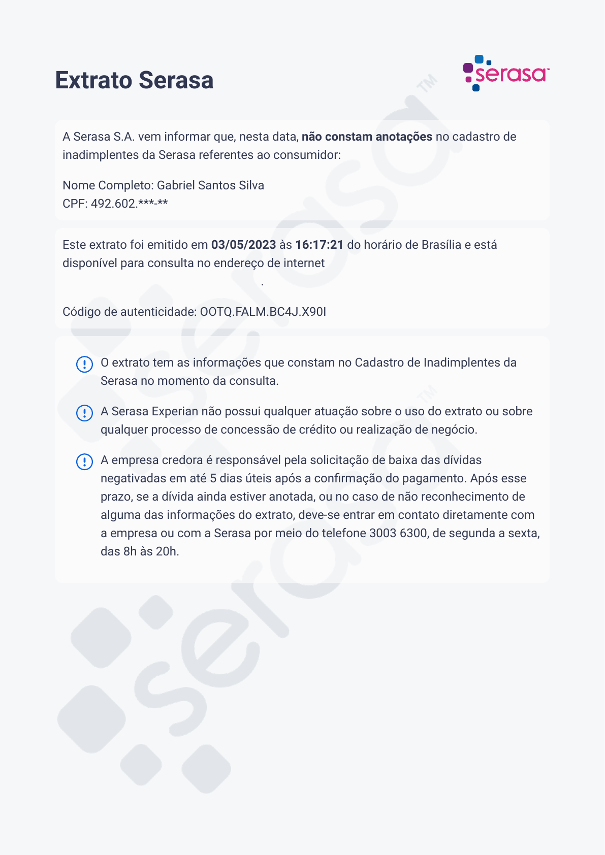 Extrato Serasa A Serasa S.A. vem informar que, nesta data, não constam anotações no cadastro de inadimplentes da Serasa referentes ao consumidor: Nome Completo: Gabriel Santos Silva CPF: 492.602.***-** Este extrato foi emitido em 03/05/2023 às 16:17:21 do horário de Brasília e está disponível para consulta no endereço de internet https://www.serasa.com.br/area- cliente/meu-cpf/pendencias/extrato. Código de autenticidade: OOTQ.FALM.BC4J.X90I O extrato tem as informações que constam no Cadastro de Inadimplentes da Serasa no momento da consulta. A Serasa Experian não possui qualquer atuação sobre o uso do extrato ou sobre qualquer processo de concessão de crédito ou realização de negócio. A empresa credora é responsável pela solicitação de baixa das dívidas negativadas em até 5 dias úteis após a confirmação do pagamento. Após esse prazo, se a dívida ainda estiver anotada, ou no caso de não reconhecimento de alguma das informações do extrato, deve-se entrar em contato diretamente com a empresa ou com a Serasa por meio do telefone 3003 6300, de segunda a sexta, das 8h às 20h. Extrato Serasa