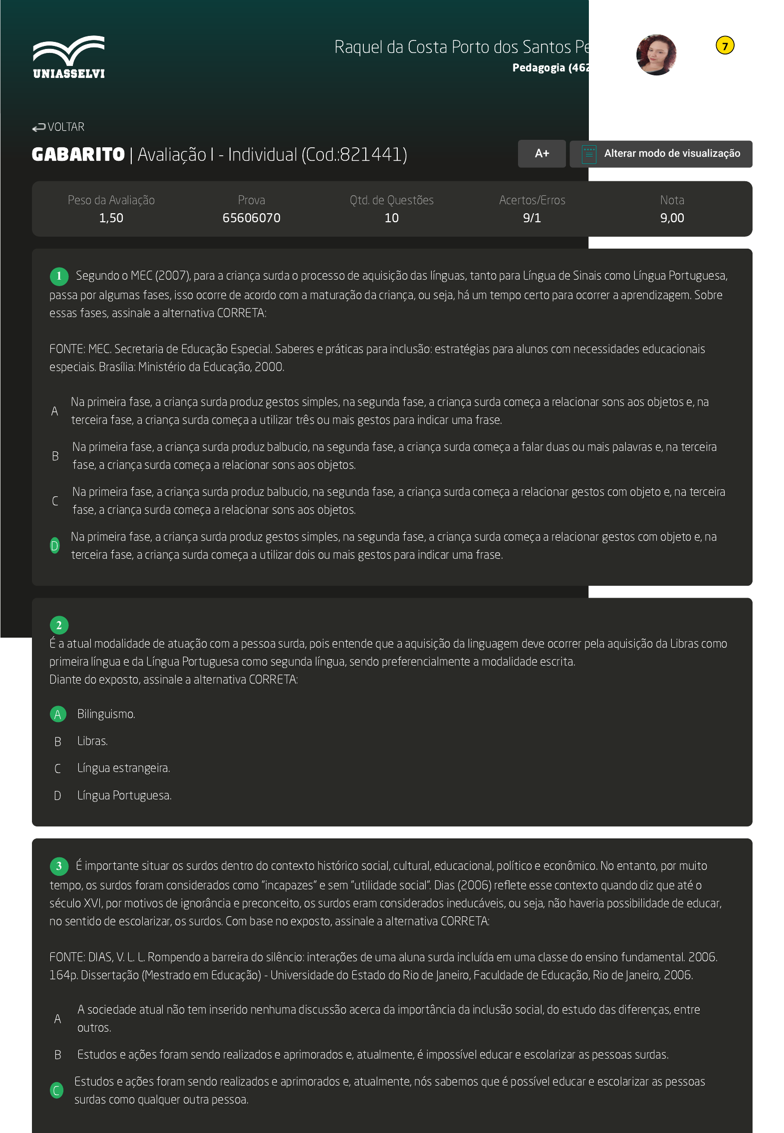 30/05/2023, 18:23 AVA https://ava2.uniasselvi.com.br/subject/grades-and-tests/answer-book/eyJ0ZXN0Ijp7InRlc3RDb2RlIjoiODIxNDQxIiwiZGVzY3JpcHRpb24iOiJBdmFsaWHDp8OjbyBJIC0gSW5kaXZpZHVhbCIsInBhcmFtZXRlciI6MTI5Mj… 1/4 GABARITO | Avaliação I - Individual (Cod.:821441) Peso da Avaliação 1,50 Prova 65606070 Qtd. de Questões 10 Acertos/Erros 9/1 Nota 9,00 Segundo o MEC (2007), para a criança surda o processo de aquisição das línguas, tanto para Língua de Sinais como Língua Portuguesa, passa por algumas fases, isso ocorre de acordo com a maturação da criança, ou seja, há um tempo certo para ocorrer a aprendizagem. Sobre essas fases, assinale a alternativa CORRETA: FONTE: MEC. Secretaria de Educação Especial. Saberes e práticas para inclusão: estratégias para alunos com necessidades educacionais especiais. Brasília: Ministério da Educação, 2000. A Na primeira fase, a criança surda produz gestos simples, na segunda fase, a criança surda começa a relacionar sons aos objetos e, na terceira fase, a criança surda começa a utilizar três ou mais gestos para indicar uma frase. B Na primeira fase, a criança surda produz balbucio, na segunda fase, a criança surda começa a falar duas ou mais palavras e, na terceira fase, a criança surda começa a relacionar sons aos objetos. C Na primeira fase, a criança surda produz balbucio, na segunda fase, a criança surda começa a relacionar gestos com objeto e, na terceira fase, a criança surda começa a relacionar sons aos objetos. D Na primeira fase, a criança surda produz gestos simples, na segunda fase, a criança surda começa a relacionar gestos com objeto e, na terceira fase, a criança surda começa a utilizar dois ou mais gestos para indicar uma frase. É a atual modalidade de atuação com a pessoa surda, pois entende que a aquisição da linguagem deve ocorrer pela aquisição da Libras como primeira língua e da Língua Portuguesa como segunda língua, sendo preferencialmente a modalidade escrita. Diante do exposto, assinale a alternativa CORRETA: A Bilinguismo. B Libras. C Língua estrangeira. D Língua Portuguesa. É importante situar os surdos dentro do contexto histórico social, cultural, educacional, político e econômico. No entanto, por muito tempo, os surdos foram considerados como "incapazes" e sem "utilidade social". Dias (2006) reflete esse contexto quando diz que até o século XVI, por motivos de ignorância e preconceito, os surdos eram considerados ineducáveis, ou seja, não haveria possibilidade de educar, no sentido de escolarizar, os surdos. Com base no exposto, assinale a alternativa CORRETA: FONTE: DIAS, V. L. L. Rompendo a barreira do silêncio: interações de uma aluna surda incluída em uma classe do ensino fundamental. 2006. 164p. Dissertação (Mestrado em Educação) - Universidade do Estado do Rio de Janeiro, Faculdade de Educação, Rio de Janeiro, 2006. A A sociedade atual não tem inserido nenhuma discussão acerca da importância da inclusão social, do estudo das diferenças, entre outros. B Estudos e ações foram sendo realizados e aprimorados e, atualmente, é impossível educar e escolarizar as pessoas surdas. C Estudos e ações foram sendo realizados e aprimorados e, atualmente, nós sabemos que é possível educar e escolarizar as pessoas surdas como qualquer outra pessoa. VOLTAR A+ Alterar modo de visualização 1 2 3 Raquel da Costa Porto dos Santos Pereira Pedagogia (4621163) 7 30/05/2023, 18:23 AVA https://ava2.uniasselvi.com.br/subject/grades-and-tests/answer-book/eyJ0ZXN0Ijp7InRlc3RDb2RlIjoiODIxNDQxIiwiZGVzY3JpcHRpb24iOiJBdmFsaWHDp8OjbyBJIC0gSW5kaXZpZHVhbCIsInBhcmFtZXRlciI6MTI5Mj… 2/4 D Embora a sociedade atual tenha inserido várias discussões acerca da importância da inclusão e escolarização de pessoas surdas, não é notada nenhuma mudança. O processo de aquisição das línguas ocorre de acordo com a maturação da criança, ou seja, tanto Libras quanto as línguas orais-auditivas são internalizadas pelas crianças do modo mais simples para o mais complexo. Em determinada fase a criança surda produz gestos simples e as crianças ouvintes balbuciam. Assinale a alternativa CORRETA que indica qual é essa fase: A Primeira fase. B Segunda fase. C Última fase. D Terceira fase. A aquisição da deficiência auditiva e surdez pode ocorrer de duas maneiras (congênitas ou adquiridas). Assinale a alternativa CORRETA que se refere à forma congênita: A Ingestão de remédios ototóxicos. B Exposição a sons impactantes (explosão) ou viroses. C Predisposição genética (otosclerose), quando ocorre meningite. D Hereditariedade, viroses maternas (rubéola, sarampo). Embora exista a marca distintiva da surdez em comum em todos os surdos, por outro lado, existem várias diferenças e marcas decorrentes de trajetórias de vida de cada indivíduo. Isto se dá devido às diferentes experiências pessoais e regionais. Assim, quando falamos sobre a perspectiva da cultura identidade e comunidade surda não existe um consenso entre os autores. Diante desta afirmação, classifique V para as sentenças verdadeiras e F para as falsas: ( ) Alguns contestam a interpretação homogeneizadora da surdez como fenômeno social na medida em que mostra que esses sujeitos constituem agrupamentos sociais. ( ) São caracterizados pela marca distintiva da surdez e por diferentes marcas decorrentes de trajetórias sociais singulares, ou seja, além da marca da deficiência. ( ) As comunidades surdas estão espalhadas pelo Brasil e as variações regionais têm determinado o desenvolvimento da cultura e identidade, não distinguindo a surdez. ( ) Existem outros fatores (origem social, relações sociais, espaço geográfico, entre outros) que foram determinantes na trajetória destes indivíduos. Agora, assinale a alternativa que apresenta a sequência CORRETA: A V - V - F - V. B V - V - V - F. C V - F - F - V. D F - V - F - V. O médico matemático e astrólogo italiano Gerolamo Cardano 