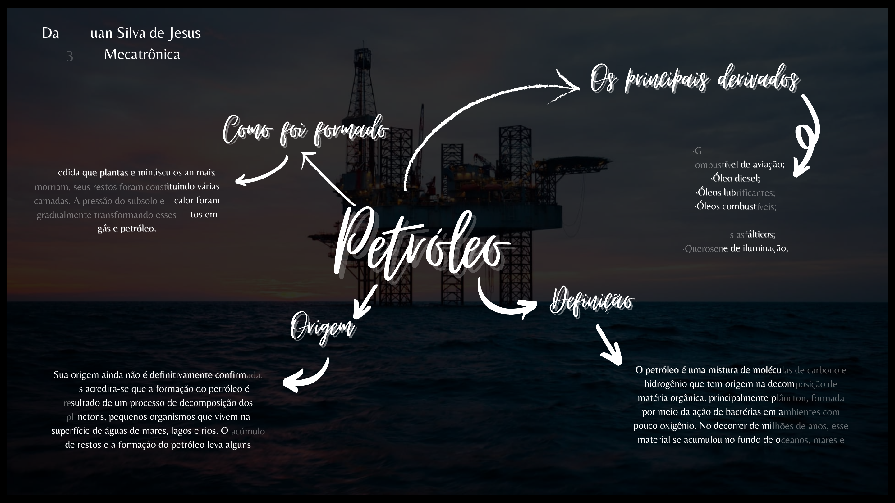 DefiniçãoDefinição PetróleoPetróleo O petróleo é uma mistura de moléculas de carbono eO petróleo é uma mistura de moléculas de carbono e hidrogênio que tem origem na decomposição dehidrogênio que tem origem na decomposição de matéria orgânica, principalmente plâncton, formadamatéria orgânica, principalmente plâncton, formada por meio da ação de bactérias em ambientes compor meio da ação de bactérias em ambientes com pouco oxigênio. No decorrer de milhões de anos, essepouco oxigênio. No decorrer de milhões de anos, esse material se acumulou no fundo de oceanos, mares ematerial se acumulou no fundo de oceanos, mares e lagos.lagos. OrigemOrigem Sua origem ainda não é definitivamente confirmada,Sua origem ainda não é definitivamente confirmada, mas acredita-se que a formação do petróleo émas acredita-se que a formação do petróleo é resultado de um processo de decomposição dosresultado de um processo de decomposição dos plânctons, pequenos organismos que vivem naplânctons, pequenos organismos que vivem na superfície de águas de mares, lagos e rios. O acúmulosuperfície de águas de mares, lagos e rios. O acúmulo de restos e a formação do petróleo leva algunsde restos e a formação do petróleo leva alguns milhões de anos.milhões de anos. Como foi formadoComo foi formado À medida que plantas e minúsculos animaisÀ medida que plantas e minúsculos animais morriam, seus restos foram constituindo váriasmorriam, seus restos foram constituindo várias camadas. A pressão do subsolo e o calor foramcamadas. A pressão do subsolo e o calor foram gradualmente transformando esses restos emgradualmente transformando esses restos em gás e petróleo.gás e petróleo. Os principais derivadosOs principais derivados ·Gasolina automotiva;·Gasolina automotiva; ·Combustível de aviação;·Combustível de aviação; ·Óleo diesel;·Óleo diesel; ·Óleos lubrificantes;·Óleos lubrificantes; ·Óleos combustíveis;·Óleos combustíveis; ·GLP;·GLP; ·Produtos asfálticos;·Produtos asfálticos; ·Querosene de iluminação;·Querosene de iluminação; David Ruan Silva de JesusDavid Ruan Silva de Jesus 3.2 D Mecatrônica3.2 D Mecatrônica
