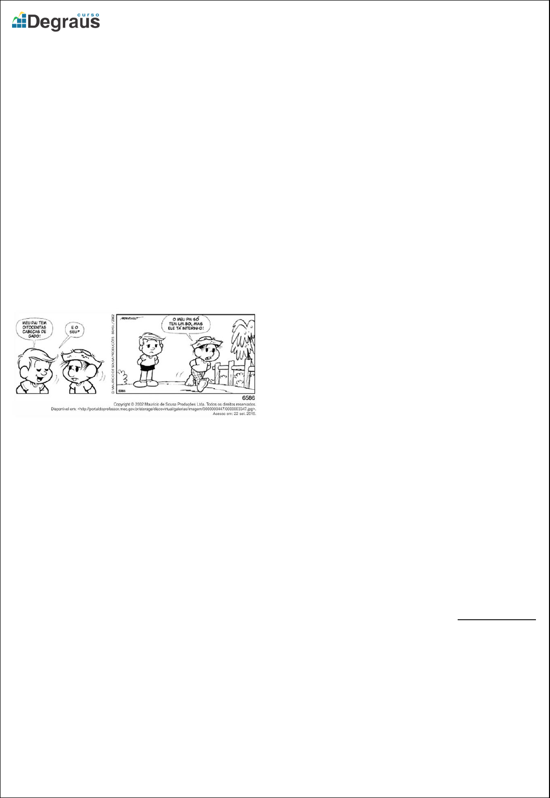 FIGURAS DE LINGUAGEM 1. Leia: Nos trechos: "...nem um dos autores nacionais ou nacionalizados de oitenta pra lá faltava nas estantes do major" e "...o essencial é achar-se as palavras que o violão pede e deseja" encontramos, respectivamente, as seguintes figuras de linguagem: a) prosopopeia e hipérbole b) hipérbole e metonímia c) metáfora e hipérbole d) metonímia e eufemismo e) metonímia e prosopopeia. 2. Em relação às figuras de linguagem, assinale a alternativa que apresenta uma metonímia. a) Ouço Mozart desde criança. b) Ele esperou muito tempo por seu doce abraço. c) Sua boca é um túmulo. d) A perna da mesa estava quebrada. e) O ator famoso bateu as botas hoje. 3. Responda à questão com base na tirinha abaixo. - “Meu pai tem oitocentas cabeças de gado! - E o seu? - O meu pai só tem um boi, mas ele tá inteirinho!” O humor da tirinha foi conferido, sobretudo, pela não compreensão por parte da personagem Chico Bento da figura de linguagem utilizada por seu interlocutor. A essa referida figura de linguagem dá-se o nome de a) ironia b) metonímia c) gradação d) hipérbole e) eufemismo 4. Assinale a alternativa em que o autor NÃO utiliza prosopopeia. a) “Quando essa ‘não palavra’ morde a isca, alguma coisa se escreveu.” (Clarice Lispector) b) “As palavras não nascem amarradas, elas saltam, se beijam, se dissolvem…” (Drummond) c) “A poesia vai à esquina comprar jornal”. (Ferreira Gullar) d) “A luminosidade sorria no ar: exatamente isto. Era um suspiro do mundo.” (Clarice Lispector) e) “Meu nome é Severino, Não tenho outro de pia”. (João Cabral de Melo Neto) 5. Nos enunciados abaixo, a palavra destacada NÃO tem sentido conotativo em: a) A comissão técnica está dissolvida. Do goleiro ao ponta- esquerda. b) Indispensável à boa forma, o exercício físico prejudica músculos e ossos, se mal praticado. c) O melhor tenista brasileiro perde o jogo, a cabeça e o prestígio em Roland Garros. d) Sob a mira da Justiça, os sorteios via 0900 engordam o caixa das principais emissoras. e) Alta nos juros atropela sonhos da classe média. 6. As figuras de linguagem são usadas como recursos estilísticos para dar maior valor expressivo à linguagem. No seguinte trecho “Tu és a chuva e eu sou a terra [...]” predomina a figura, denominada: a) ironia b) hipérbole c) eufemismo d) metáfora e) animismo 7. Identifique a única alternativa que possui eufemismo. a) Eu morri de rir com aquela história. b) Quem foi o inteligente que cometeu esses erros todos? c) Você está ficando muito cheinha. d) Ele veio voando para casa. e) Já disse isso um milhão de vezes. 8. Em, “Ele foi descansar ao lado de Deus.”, temos: a) Eufemismo b) Prosopopeia c) Hipérbole d) Metáfora e) n.d.a 9. No enunciado: “Virgílio, traga-me uma coca cola bem gelada!”, registra-se uma figura de linguagem denominada: a) gradação b) personificação c) ironia d) hipérbole e) metonímia 10. Na frase: “Faria isso mil vezes novamente, se fosse preciso.”, encontra-se a seguinte figura de linguagem: a) metáfora. b) hipérbole. c) eufemismo. d) gradação e) personificação. 11. "Ao tempo da lenha, os trens, cuspindo fagulhas, estragavam as roupas dos incautos passageiros." (Edmundo Dantés Passos). Na frase acima, os vocábulos grifados constituem um (uma): a) metáfora b) hipérbole c) animismo d) ironia e) eufemismo 12. Assinale, dentre os textos abaixo, extraídos da obra Relatos de sonhos e lutas, a alternativa que não apresenta exemplo de gradação. a) ...batem, torturam, mutilam, asfixiam, enforcam, escamam as unhas e devastam os cabelos, castram e matam... (p.95) b) ...e ainda assim lutamos, brigamos, guerrilhamos, rasgamos nossas veias para que nosso sangue adube esta terra que tanto amamos... (p.94) c) ...os laudos falam em infartos, derrames, ataques cardíacos, cânceres tenebrosos, embolias, esquizofrenias agudas, stresses e desajustes. (p.95) d) ...estas servem apenas para destruir o homem, para arrasá-lo, aniquilá-lo, reduzi-lo a um nada teledirigido... (p.94) e) Nada disso: simplesmente desejamos a justiça, almejamos a liberdade, sofremos pela paz, morremos pela verdade... (p.94) 13. Leia a tirinha e responda a questão: O discurso de uma das personagens da tirinha sofreu algumas alterações, provocadas pelo uso de uma figura de linguagem muito empregada no discurso político. Laerte construiu o efeito de humor baseado em: a) hipérboles b) metonímias c) prosopopeias d) eufemismos e) ironias 14. No trecho “Basta chegar a Pequim para desnudar a farsa de que a China é o chão de fábrica do planeta, mas não tem acesso aos bens que produz.”, a expressão metafórica em destaque indica que os chineses a) produzem muito. b) não são consumistas. c) produzem com pouca qualidade. d) não precisam daquilo que produzem. e) não produzem aquilo de que precisam. 15. Identifique a figura de linguagem no fragmento a seguir: Moça linda, bem tratada, Três séculos de família, Burra como uma porta: Um amor! Mário de Andrade a) Metonímia b) Gradação c) Eufemismo d) Personificação e) Ironia 16. A imagem abaixo representa qual figura de linguagem? a) prosopopeia b) eufemismo c) gradação d) metáfora e) animismo 17. Relacione as definições abaixo com as figuras de linguagem: ( ) Figura de linguagem em que se emprega um sentido incomum para uma palavra a partir de uma relação de semelhança entre dois termos. ( ) Figura de linguagem que consiste em expressar uma ideia com exagero, a fim de enfatizá-la ou destacá-la. ( ) Figura de linguagem que consiste no emprego de uma palavra por outra, com a qual tem uma relação de interdependência, proximidade. ( ) Figura de linguagem que consiste em atribuir características humanas a seres inanimados ou irracionais. ( ) Figura de linguagem que consiste no emprego de palavra ou expressão agradável para amenizar uma ideia desagradável ou grosseira. 1. Eufemismo. 2. Metáfora. 3. Metoní