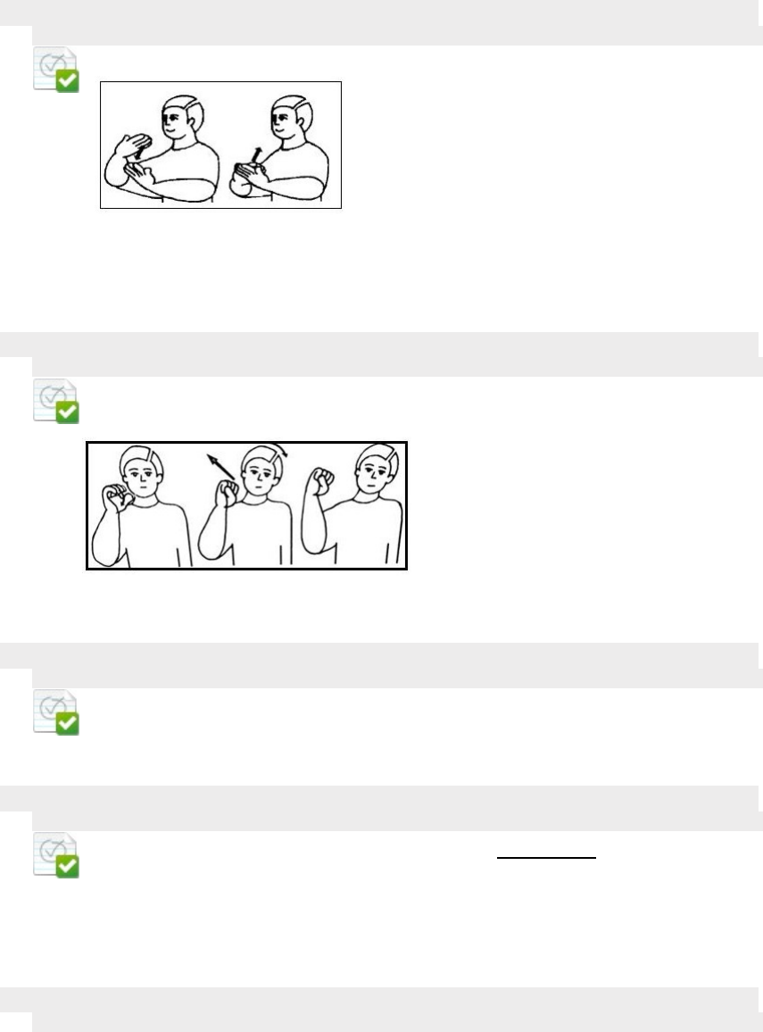 · Pergunta 1 1 em 1 pontos Assinale abaixo a alternativa que indica o significado do sinal ilustrado: Resposta Selecionada: c. ESTUDAR · Pergunta 2 1 em 1 pontos Qual é o sinal representado abaixo? Resposta Selecionada: b. ABRIL (mês). · Pergunta 3 1 em 1 pontos O número 3 e a letra W diferenciam-se por qual parâmetro? Resposta Selecionada: a. Orientação da palma da mão · Pergunta 4 1 em 1 pontos Analise as afirmativas abaixo e assinale a incorreta: Resposta Selecionada: e. Segundo a lei federal 10436/2002, a Língua Brasileira de Sinais - Libras não poderá substituir a fala da língua portuguesa, que se torna obrigatória para os surdos. · Pergunta 5 1 em 1 pontos Assinale a alternativa que indica a data correta: Resposta Selecionada: e. 7/agosto/2015 · Pergunta 6 1 em 1 pontos Os sinais SÁBADO e LARANJA se diferem por qual parâmetro? Resposta Selecionada: d. Por nenhum parâmetro, são sinais polissêmicos · Pergunta 7 1 em 1 pontos Quais palavras se referem às soletrações a seguir? Resposta Selecionada: c. TARDE; MÊS; FELIZ · Pergunta 8 1 em 1 pontos Stokoe (1960) evidenciou que as línguas de sinais apresentavam os mesmos aspectos linguísticos das línguas orais. Observe os itens abaixo e assinale a alternativa que contempla as caraterísticas da Libras. I- Modalidade viso-espacial. II- Iconicidade e arbitrariedade. III- É universal. IV- Possui cinco parâmetros Estão corretas: Resposta Selecionada: e. I, II e IV · Pergunta 9 1 em 1 pontos Assinale a alternativa correta que completa as lacunas da frase a seguir. Os ____________________ são um conjunto de regras da Libras, dentre eles podemos citar: ____________________ que refere-se se a palma da mão está voltada para cima, baixo, lateral, fora ou dentro com o corpo como referência; ________________ que indica onde o sinal encosta no corpo e _______________ que refere-se ao que faz parte do sinal e não é executado com as mãos. Resposta Selecionada: e. 5 parâmetros / orientação da palma da mão/ ponto de articulação/ expressões não manuais. · Pergunta 10 1 em 1 pontos Analise as afirmativas abaixo e assinale a correta: Resposta Selecionada: d. As línguas de sinais podem expressar quaisquer conceitos, concretos ou abstratos, simples ou complexos. ---Internal Use---