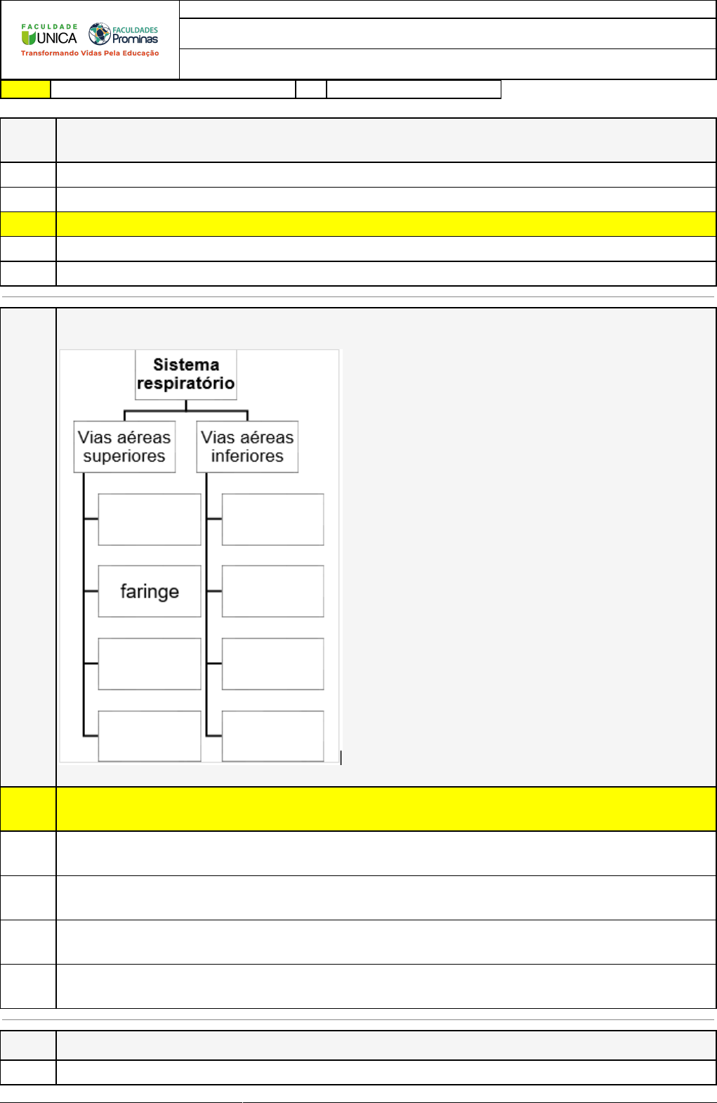 14/05/2023 11:24:33 1/3 REVISÃO DE SIMULADO Nome: WANDERSON MARINHO DA SILVA Disciplina: Fisiologia Humana Respostas corretas são marcadas em amarelo X Respostas marcardas por você. Questão 001 Indique a opção que apresenta um efeito crônico do treinamento aeróbio sobre o sistema cardiovascular nas condições de repouso: X A) Nenhuma das alternativas estão corretas. B) Taquicardia de repouso. C) Aumento do volume sistólico. D) Aumento do débito cardíaco. E) Aumento do hematócrito. Questão 002 Preencha a alternativa que completa a figura sobre os componentes do sistema respiratório. X A) Vias aéreas superiores: nariz, cavidade nasal e laringe. Vias aéreas inferiores: traqueia, brônquios, bronquíolos e alvéolos pulmonares. B) Vias aéreas superiores: nariz e cavidade nasal. Vias aéreas inferiores: traqueia, brônquios, coração e alvéolos pulmonares. C) Vias aéreas superiores: nariz, cavidade nasal, laringite. Vias aéreas inferiores: traqueia, brônquios, bronquíolos e alvéolos pulmonares. D) Vias aéreas inferiores: nariz, cavidade nasal e laringe. Vias aéreas superiores: traqueia, brônquios, bronquíolos e alvéolos pulmonares. E) Vias aéreas superiores: nariz, cavidade nasal e laringe. Vias aéreas inferiores: traqueia, brônquios, esterno e alvéolos pulmonares. Questão 003 Os vasos sanguíneos se dividem em três tipos, são eles: X A) veias, artérias e axônios. 14/05/2023 11:24:33 2/3 B) artérias, capilares e artrite. C) veias, artérias e capilares. D) veias, artérias e linfa. E) capilares, veias e artrose. Questão 004 O coração é uma bomba inteligente, capaz de aumentar sua vazão de acordo com a demanda metabólica. Em relação ao aumento do débito cardíaco durante o exercício, é correto dizer que ele é A) independente do retorno venoso. X B) diretamente proporcional ao conteúdo arterial de oxigênio. C) inversamente proporcional à pressão arterial média. D) Nenhuma das alternativas anteriores estão corretas. E) diretamente proporcional à intensidade de exercício ou ao consumo de oxigênio. Questão 005 Em relação ao consumo máximo de oxigênio em indivíduos saudáveis, é correto afirmar que: X A) a demanda muscular de oxigênio aumenta duas vezes mais durante o exercício físico máximo em comparação ao repouso. B) a capacidade de difusão pulmonar é um limitante do consumo máximo de oxigênio em nível do mar. C) Nenhuma das alternativas anteriores estão corretas. D) a diferença do vO2 é um dos determinantes do consumo máximo de oxigênio. E) a resposta de débito cardíaco durante o exercício em nível do mar não influencia o consumo máximo de oxigênio. Questão 006 O sangue circula por todo nosso corpo, garantindo, desse modo, o transporte de substâncias pelo organismo. Para realizar um circuito completo, o sangue passa duas vezes pelo nosso coração. O sangue vindo de diferentes regiões do corpo (exceto pulmões) chega ao coração pelas ____________ e sai do coração em direção ao corpo pela ____________. Marque a alternativa que completa, respectivamente, os espaços anteriores. A) Artérias pulmonares e veia pulmonar. X B) Artérias aortas e veia cava. C) Veias pulmonares e artéria pulmonar. D) Veias cavas e artéria aorta. E) Artérias cavas e veia aorta. 14/05/2023 11:24:33 3/3 Questão 007 (UFPE - adaptada) Com relação à função de artérias e veias na circulação humana, analise a figura e as proposições a seguir: Esquema da circulação do sangue no corpo humano 1- Artérias pulmonares (1) levam aos pulmões o sangue vindo do corpo. 2- Veias pulmonares (2) trazem para o coração o sangue oxigenado nos pulmões. 3- Artéria aorta (3) leva o sangue oxigenado a todas as partes do corpo. 4- Veias cavas (4) trazem o sangue rico em gás carbônico do corpo ao coração. Estão corretas: A) 2, 3 e 4 apenas. X B) 1, 2 e 3 apenas. C) 1, 2, 3 e 4. D) 2 e 4 apenas. E) 1 e 3 apenas. Questão 008 O sistema cardiovascular é formado pelo coração e uma grande quantidade de vasos sanguíneos. Esses vasos podem ser classificados em três tipos distintos: artérias, veias e capilares. Sobre as artérias, marque a alternativa correta. X A) Atuam transportando exclusivamente sangue oxigenado. B) Atuam transportando sangue do coração para outras partes do corpo. C) Atuam transportando exclusivamente sangue rico em gás carbônico. D) Atuam transportando sangue de diversas partes do corpo em direção ao coração. E) Todas as alternativas acima estão corretas.