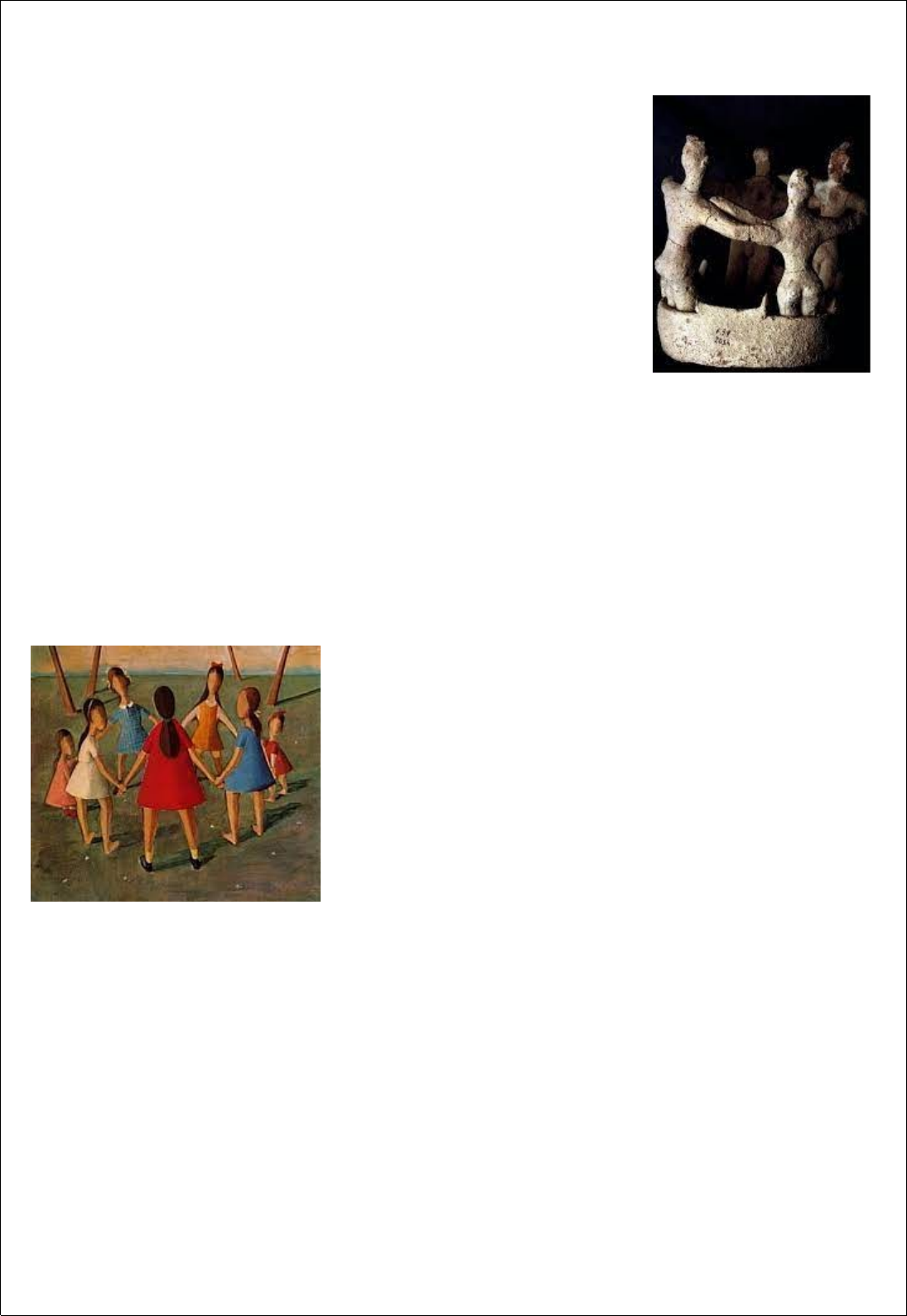 A música em nossa vida e as danças circulares. A dança pode ter diferentes funções de acordo com o contexto e o lugar em que ela é praticada. Escultura grega, feita há cerca de 1500 a.C. Muitas danças tradicionais, por exemplo são dançadas em círculo. Essas danças, chamadas de danças circulares, tem uma função simbólica de manter a união e a coesão do grupo. As cantigas de roda fazem parte da tradição de muitos países. São uma mistura de canto e dança, muito popular entre os povos. As danças circulares são consideradas, pelos estudiosos, como as danças coletivas mais antigas da humanidade. Em muitos lugares, as danças circulares são conhecidas como ciranda. ATIVIDADES 1- Observe a obra abaixo e responda: a- Qual o nome da obra? _______________________________________ ________________________________________ b- Qual o nome do artista? ________________________________________ ________________________________________ Milton dacosta. RODA. 1942. c- O que as crianças representadas na obra estão fazendo? __________________________________________________________________________________________________________________________________ d- Olhe atentamente para as meninas na obra. O que você observou? __________________________________________________________________________________________________________________________________ e- Qual música você imagina que as meninas estão dançando? ________________________________________________________________ A música em nossa vida e as danças circulares. A dança pode ter diferentes funções de acordo com o contexto e o lugar em que ela é praticada. Escultura grega, feita há cerca de 1500 a.C. Muitas danças tradicionais, por exemplo são dançadas em círculo. Essas danças, chamadas de danças circulares, tem uma função simbólica de manter a união e a coesão do grupo. As cantigas de roda fazem parte da tradição de muitos países. São uma mistura de canto e dança, muito popular entre os povos. As danças circulares são consideradas, pelos estudiosos, como as danças coletivas mais antigas da humanidade. Em muitos lugares, as danças circulares são conhecidas como ciranda. ATIVIDADES 1- Observe a obra abaixo e responda: a- Qual o nome da obra? _______________________________________ ________________________________________ b- Qual o nome do artista? ________________________________________ ________________________________________ Milton dacosta. RODA. 1942. c- O que as crianças representadas na obra estão fazendo? __________________________________________________________________________________________________________________________________ d- Olhe atentamente para as meninas na obra. O que você observou? __________________________________________________________________________________________________________________________________ e- Qual música você imagina que as meninas estão dançando? ________________________________________________________________ A música em nossa vida e as danças circulares. A dança pode ter diferentes funções de acordo com o contexto e o lugar em que ela é praticada. Muitas danças tradicionais, por exemplo são dançadas em círculo. Essas danças, chamadas de danças circulares, tem uma função simbólica de manter a união e a coesão do grupo. As cantigas de roda fazem parte da tradição de muitos países. São uma mistura de canto e dança, muito popular entre os povos. As danças ci rculares são consideradas, pelos estudiosos, como as danças coletivas mais antigas da humanidade. Em muitos lugares, as danças circulares são conhecidas como ciranda. ATIVIDADE S 1 - Observe a obra abaixo e responda : a - Qual o nome da obra ? _______________________________________ ________________________________________ b - Qual o nome do artista ? ________________________________________ ________________________________________ M ilton da c osta. RODA . 1942. c - O que as crianças representadas na obra estão fazendo? _________________________________________________________________ _________________________________________________________________ d - Olhe atentamente para as meninas na obra . O que você o bservou? ____ _____________________________________________________________ _________________________________________________________________ e - Qual música você imagina que as meninas estão dançando? ________________________________________________________________ Escultura grega, feita há cerca de 1500 a.C. A música em nossa vida e as danças circulares. A dança pode ter diferentes funções de acordo com o contexto e o lugar em que ela é praticada. Muitas danças tradicionais, por exemplo são dançadas em círculo. Essas danças, chamadas de danças circulares, tem uma função simbólica de manter a união e a coesão do grupo. As cantigas de roda fazem parte da tradição de muitos países. São uma mistura de canto e dança, muito popular entre os povos. As danças circulares são consideradas, pelos estudiosos, como as danças coletivas mais antigas da humanidade. Em muitos lugares, as danças circulares são conhecidas como ciranda. ATIVIDADES 1- Observe a obra abaixo e responda: a- Qual o nome da obra? _______________________________________ ________________________________________ b- Qual o nome do artista? ________________________________________ ________________________________________ Milton dacosta. RODA. 1942. c- O que as crianças representadas na obra estão fazendo? _________________________________________________________________ _________________________________________________________________ d- Olhe atentamente para as meninas na obra. O que você observou? _________________________________________________________________ _________________________________________________________________ e- Qual música você imagina que as meninas estão dançando? ________________________________________________________________ Escultura grega, fei