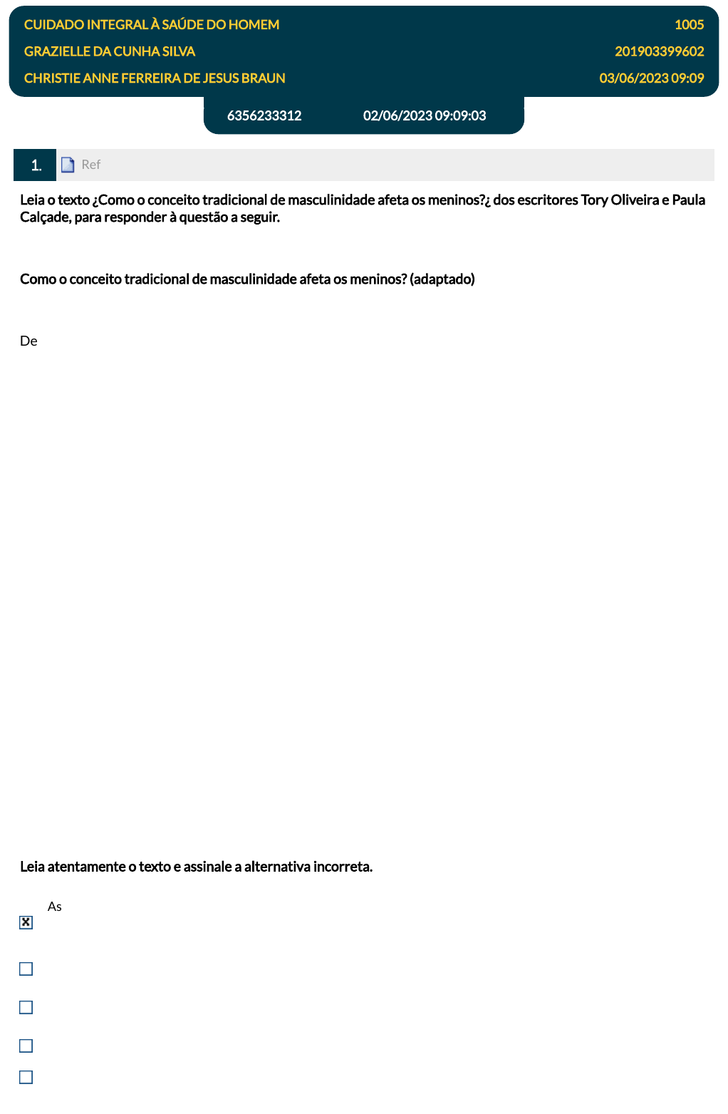 CUIDADO INTEGRAL À SAÚDE DO HOMEM 1005 GRAZIELLE DA CUNHA SILVA 201903399602 CHRISTIE ANNE FERREIRA DE JESUS BRAUN 03/06/2023 09:09 6356233312 02/06/2023 09:09:03 1. Ref.: 6103119 Leia o texto ¿Como o conceito tradicional de masculinidade afeta os meninos?¿ dos escritores Tory Oliveira e Paula Calçade, para responder à questão a seguir. Como o conceito tradicional de masculinidade afeta os meninos? (adaptado) Deixar de dizer que ama um amigo, não poder abraçar quem se gosta, esconder seus sentimentos e não poder chorar. Para muitos meninos, essas são algumas das regras não escritas das masculinidades. Nascido dos debates sobre gênero, o conceito de masculinidades abarca as regras sociais delimitadas aos homens para que eles construam sua maneira de agir consigo, com o outro e com a sociedade. Muito cedo se aprende que a pena para quem não seguir um código estrito, que de�ne a masculinidade, é ser visto como ¿menos homem¿, associado à feminilidade, e, assim, estar vulnerável à violência e ao bullying dos pares. Segundo Marcelo Hailer, pesquisador do Núcleo Inanna de Pesquisas sobre Sexualidades, Feminismos, Gêneros e Diferenças, da PUC-SP, ¿A narrativa social valoriza homens brancos, heterossexuais, fortes, com condições econômicas favoráveis¿. Para o pesquisador, a escola pode ser um campo de cobranças dessa performance masculina. A ausência de discussões sobre o impacto disso para meninos e meninas pode resultar em violência dentro do ambiente escolar. ¿Enquanto não houver debate nas escolas, esses valores vão continuar resultando em violência física e psicológica, porque não há outras alternativas para essas crianças lidarem com as angústias e dúvidas em outros lugares também¿. ¿A maneira como os garotos são criados faz com que aprendam a esconder os sentimentos por trás de uma máscara de masculinidade¿ a�rma o psicólogo americano William Pollack no documentário ¿A Máscara em Que Você Vive¿ (2015). Disponível atualmente na Net�ix, o �lme introduz o debate sobre masculinidades de maneira acessível, mostrando como essa construção rígida do que é ser homem impacta a vida, a educação e a saúde de meninos. ¿Os homens têm di�culdade de expressar aquilo que sentem. Em geral, isso se dá por meio da violência: quando está triste, com raiva, quando sente medo ou insegurança, em todos esses aspectos, a violência é uma fuga muito grande. Temos uma di�culdade de entender os sentimentos e de lidar com eles de maneira não violenta¿, explica Caio César Santos, professor de Geogra�a, youtuber e pesquisador de masculinidades desde 2015. (Fonte: Nova Escola) Leia atentamente o texto e assinale a alternativa incorreta. As quatro ações citadas no primeiro período do texto são utilizadas como exemplos de proibições que, por impedir o desenvolvimento afetivo dos meninos, são combatidas e questionadas pelos defensores do conceito tradicional de masculinidade. A expressão destacada no trecho ¿Nascido dos debates sobre gênero, o conceito de masculinidades¿ tem sentido conotativo, metafórico, já que o conceito é uma construção social e não um fenômeno natural, biológico. No segundo parágrafo, são utilizadas, por meio do discurso direto, opiniões de uma autoridade no assunto debatido, objetivando atribuir maior credibilidade ao desenvolvimento do texto. É fundamental que exista, na escola, um espaço para a discussão dos valores que constroem o padrão de masculinidade tradicional, para que, a partir desses debates, possam diminuir as agressões. Todas as a�rmativas estão incorretas Respondido em 02/06/2023 09:22:34 javascript:alert('C%C3%B3digo da quest%C3%A3o: 6103119.'); 2. Ref.: 6106557 A Política Nacional de Atenção Integral à Saúde do Homem (PNAISH) foi lançada pelo Ministério da Saúde com o intuito de promover a melhoria das condições de saúde da população masculina brasileira. Em seus conteúdos são abordadas as diretrizes que devem nortear os planos, programas, projetos e ações de saúde voltados para esta população (BRASIL, 2009). Em relação às diretrizes da PNAISH, é CORRETO a�rmar que: A assistência à saúde do homem nos diversos pontos de atenção da rede dispensa a perspectiva de uma linha de cuidado. A compreensão acerca da complexidade dos modos de vida e da situação social do indivíduo assume papel secundário em se tratando de saúde do homem. É proposta uma reorganização das ações de saúde de forma que os homens considerem os serviços de saúde também como espaços masculinos. A implementação desta política deve ocorrer de forma hierarquizada, priorizando as ações da atenção especializada e hospitalar. A execução desta política deve ser feita de forma dissociada das demais políticas do Ministério da Saúde, devido às especi�cidades do tema tratado. Respondido em 02/06/2023 09:24:08 3. Ref.: 6105662 Para atingir o objetivo geral de promover a melhoria das condições de saúde da população masculina no Brasil, a Política Nacional de Atenção Integral à Saúde do Homem (PNAISH) tem como foco homens na faixa etária de: 21 a 58 anos. 25 a 69 anos. 18 a 45 anos. 21 a 55 anos. 20 a 59 anos. Respondido em 02/06/2023 09:21:34 4. Ref.: 7630193 Ao realizar a anamnese e o exame físico de um paciente homem, o enfermeiro está colocando em prática a seguinte etapa do Processo de Enfermagem: Histórico. Avaliação. Planejamento. Diagnóstico. javascript:alert('C%C3%B3digo da quest%C3%A3o: 6106557.'); javascript:alert('C%C3%B3digo da quest%C3%A3o: 6105662.'); javascript:alert('C%C3%B3digo da quest%C3%A3o: 7630193.'); Implementação. Respondido em 02/06/2023 09:09:10 5. Ref.: 7646661 Sobre as principais causas de morbimortalidade da população masculina analise as alternativas abaixo e sinalize como Verdadeira (V) ou Falsas (V): ( ) Os homens morrem mais por causas externas como acidentes e violência do que as mulheres ( ) Os h
