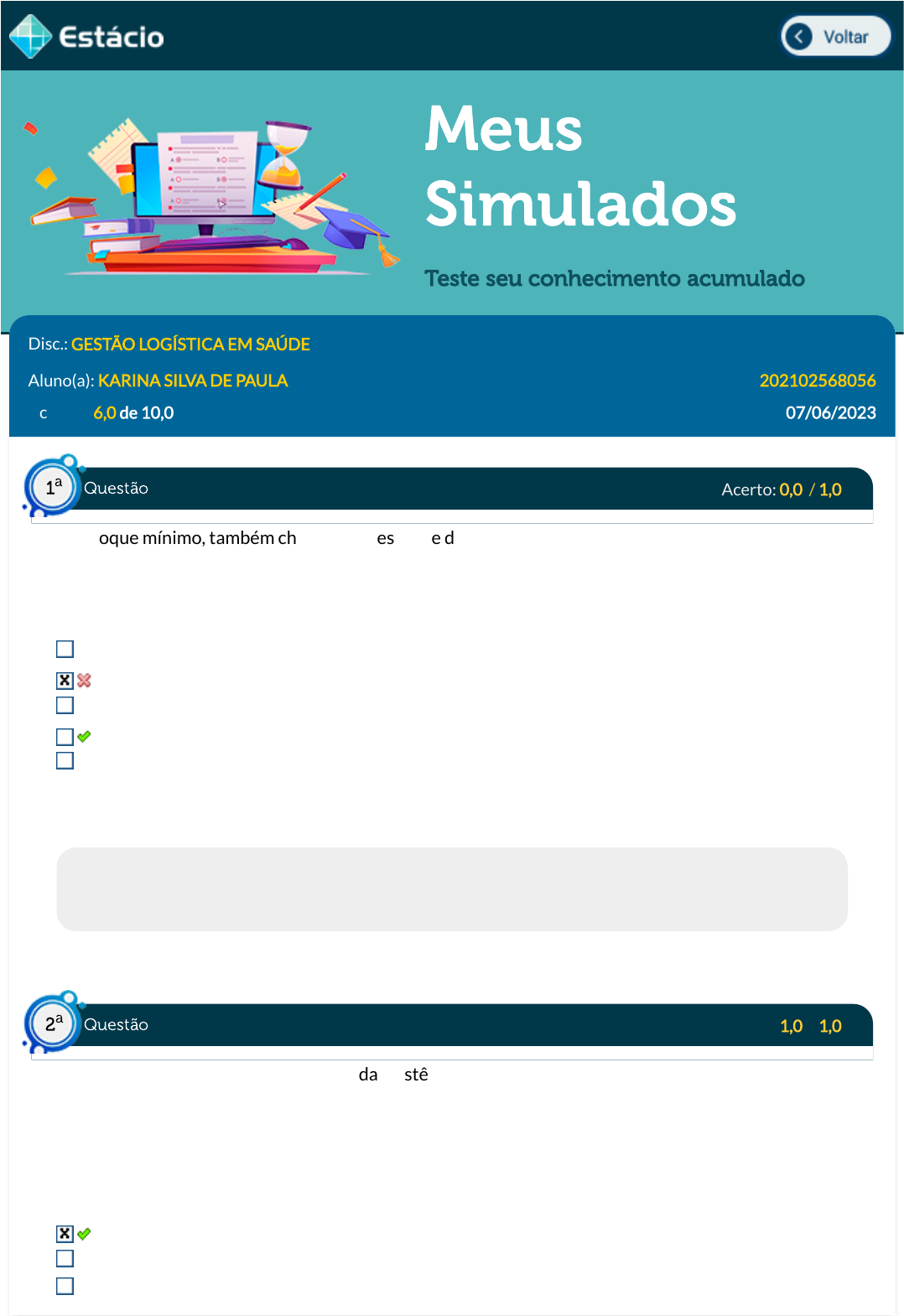 07/06/2023, 11:48 Estácio: Alunos https://simulado.estacio.br/alunos/ 1/5 Meus Simulados Teste seu conhecimento acumulado Disc.: GESTÃO LOGÍSTICA EM SAÚDE Aluno(a): KARINA SILVA DE PAULA 202102568056 Acertos: 6,0 de 10,0 07/06/2023 Acerto: 0,0 / 1,0 O estoque mínimo, também chamado de estoque de segurança, por de�nição, é a quantidade mínima que deve existir em estoque, que se destina a cobrir eventuais atrasos no ressuprimento, objetivando a garantia do funcionamento ininterrupto e e�ciente do processo produtivo, sem o risco de faltas. Entre as causas que ocasionam essas faltas, podemos considerar: Estabilidade nas épocas de aquisição e consumo; Alto padrão de qualidade, quando o Controle de Qualidade aprova os lotes; Remessas por parte do fornecedor dentro dos prazos estabelecidos Oscilação do consumo. Acuracidade elevada dos estoques Respondido em 07/06/2023 11:22:42 Explicação: OSCILAÇÃO DE CONSUMO Acerto: 1,0 / 1,0 As atividades empresariais dependem da existência conjunta de cinco fatores de produção: natureza, capital e trabalho e tecnologia integrados por um quinto fator denominado empresa. Qual fator listado abaixo está descrito no texto a seguir: Trata-se de um recurso que ganha importância a cada dia. Produz um diferencial em relação aos demais, normalmente traduzido em menores custos, ou um outro diferencial que possa ser transformado em algum tipo de vantagem econômica, como mais lucro. Tecnologia Natureza Capital Questão1 a Questão2 a https://simulado.estacio.br/alunos/inicio.asp javascript:voltar(); 07/06/2023, 11:48 Estácio: Alunos https://simulado.estacio.br/alunos/ 2/5 Empresa Trabalho Respondido em 07/06/2023 11:24:08 Explicação: A resposta para esta questão é "Tecnologia", em virtude de ser este o recurso que a cada dia vem se desenvolvendo e exercendo um diferencial no gerenciamento da cadeia de suprimentos, reduzindo custos ou apresentando outros diferenciais que possam ser transformados em qualquer vantagem econômica que gere lucro. Por este motivo, as empresas continuam investindo em tecnologia, aperfeiçoando seu sistema logístico porque, atualmente, ele é o grande diferencial no mercado. Acerto: 1,0 / 1,0 No que tange a área de gestão de suprimentos, podemos citar como a principal mudança que afeta a logística: Agregação de valor aos produtos Economia centralizada Globalização Ciclo vida produto Distribuição Respondido em 07/06/2023 11:25:27 Explicação: Globalização Acerto: 0,0 / 1,0 Determinar as quantidades a serem compradas, assim como os prazos é uma função de Compras. Essas informações são coletadas e analisadas periodicamente, junto aos demais departamentos. A função de fornecer uma previsão que pode ser traduzida em programa de produção, logo, também em uma programação de compras é do seguinte departamento: Recursos Humanos Produção Vendas Finanças. Desdenvolvimento de Produtos Respondido em 07/06/2023 11:27:23 Explicação: Questão3 a Questão4 a 07/06/2023, 11:48 Estácio: Alunos https://simulado.estacio.br/alunos/ 3/5 Normalmente, a área de vendas informa à área de compras a sua "Previsão de Vendas" ou "Previsão de Demanda" dependendo do sistema utilizado pela empresa, pull ou push. No entanto, dependendo da estruturação da empresa, esta informação pode ser fornecida pela área de marketing. Acerto: 1,0 / 1,0 A classi�cação dos itens de material é um procedimento necessário a �m de racionalizar o controle de materiais em estoque. Qual a classi�cação que signi�ca a redução da diversidade de itens de material em estoque que se destinam a um mesmo �m ? Caso existam dois ou mais itens de material que são empregados para a mesma �nalidade, com o mesmo resultado. Identi�cação Padronização Descrição Normalização Simpli�cação Respondido em 07/06/2023 11:31:10 Explicação: SIMPLIFICAÇÃO Acerto: 0,0 / 1,0 Os estoques podem ser classi�cados em diversos tipos. Qual denominação abaixo se relaciona com o seguinte texto: Esse tipo de estoque requer alguma forma de processamento para ser transformada em produto acabado. Materiais de Embalagem Produto Acabado Produto em Processo Componentes de Máquinas Matéria Prima Respondido em 07/06/2023 11:36:17 Explicação: MATÉRIA PRIMA Acerto: 1,0 / 1,0 Os indicadores de desempenho são informações que registram e retratam o comportamento de uma atividade, de uma função ou de toda uma organização. Dos tipos de indicadores em Compras e Questão5 a Questão6 a Questão7 a 07/06/2023, 11:48 Estácio: Alunos https://simulado.estacio.br/alunos/ 4/5 Suprimentos citados qual NÃO SE CONSTITUI em indicador do setor. Nível de atendimento por pedidos, setores, departamentos. Desempenho na entrega em termos de quantidade e prazos. Níveis de preços, estimado e real. Evolução dos preços. Valor das compras por pedidos, setores, departamentos. Giro dos estoques de materiais para evitar elevado nível de capital imobilizado. Respondido em 07/06/2023 11:42:14 Explicação: Todas as opções sugeridas são funções do ciclo de compras ou suprimentos com exceção da opção "Giro dos estoques de materiais para evitar elevado nível de capital imobilizado" que pertence à área de Estoques e Armazenagem. Acerto: 0,0 / 1,0 É notável a presença dominante das lâminas, isqueiros e, sem dúvida, das canetas esferográ�cas BIC no mundo inteiro em distribuidores, supermercados, farmácias e outros varejos no mundo inteiro. Considerando as características dos produtos, da demanda e do negócio, qual o sistema que mais se adaptaria à distribuição? Sistema Direto Sistema Escalonado Merge In Transit Sistema Cross Docking Sistema Misto Respondido em 07/06/2023 11:44:00 Explicação: Sistema Escalonado Acerto: 1,0 / 1,0 O diretor de logística de uma empresa de produção de bens de consumo tem a missão de colaborar na expansão do negócio. Para isso, ele está avaliando duas opções de investimento, a sab