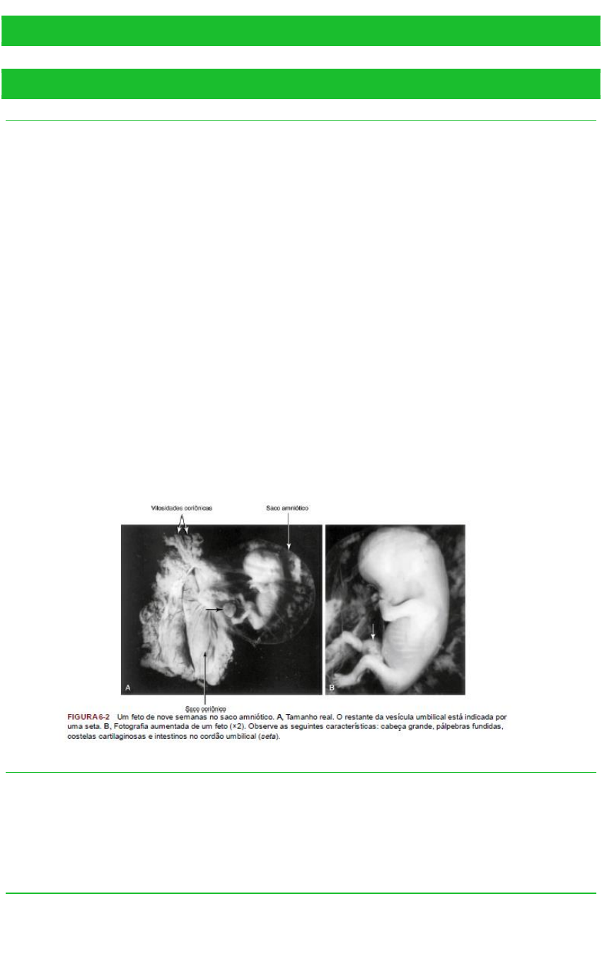 DESENVOLVIMENTO FETAL 1.0 EXPLICAR O DESENVOLVIMENTO FETAL. 1.1. 9ª A 12ª SEMANA. 9º SEMANA No início do período fetal (9º semana) a cabeça constitui a metade da medida do CCN do feto. Posteriormente, o crescimento no comprimento corporal se acelera rapidamente, por volta de 12 semanas o CCN mais que dobrou A cabeça ainda é desproporcionalmente grande em comparação com o restante do corpo A face é larga, os olhos estão amplamente separados, as orelhas apresentam uma baixa implantação e as pálpebras estão fusionadas No início da 9º semana, as pernas são curtas e as coxas relativamente pequenas As genitálias externas dos sexos masculino e feminino parecem semelhantes até o final da 9º semana. Sua forma madura ainda não está estabelecida até a 12º semana O FÍGADO é o principal local de eritropoiese (formação de hemácias) A formação de urina começa entre a 9º e a 12º semana e esta é eliminada através da uretra para o líquido amniótico na cavidade amniótica Os produtos residuais fetais são transferidos para a circulação materna por meio da passagem através da membrana placentária 10º SEMANA As alças intestinais são claramente visíveis na extremidade proximal do cordão umbilical até a metade da 10º semana. O intestino ainda não se acomodou na cavidade abdominal. 11º SEMANA Os intestinos retornam para o abdome, para a cavidade abdominal 12º SEMANA Os centros de ossificação primária surgem no esqueleto, especialmente no crânio e nos ossos longos (fêmur) Os membros superiores quase atingiram os seus comprimentos relativos finais, mas os membros inferiores ainda não estão bem desenvolvidos e são ligeiramente mais curtos do que os seus comprimentos relativos finais Por volta do final da 12º semana, a eritropoiese é reduzida no fígado e começa no BAÇO 1.2. 13ª A 16ª SEMANA. O crescimento é muito rápido durante esse período Por volta da 16º semana, a cabeça é relativamente menor do que a cabeça do feto de 12 semanas e os membros inferiores cresceram Os movimentos dos membros tornam-se coordenados por volta da 14º semana, mão são muito leves para serem percebidos pela mãe, mas são visíveis durante os exames ultrassonográficos A OSSIFICAÇÃO DO ESQUELETO FETAL é ativa durante esse período e os ossos em desenvolvimento são claramente visíveis nas imagens de ultrassom por volta do início da 16º semana MOVIMENTOS LENTOS DOS OLHOS ocorrem na 14º semana Na 14º semana, o padrão dos cabelos no couro cabeludo também é determinado durante esse período Por volta da 16º semana, os ovários estão diferenciados e contêm OS FOLÍCULOS OVARIANOS PRIMORDIAIS A GENITÁLIA DOS FETOS MASCULINOS E FEMININOS PODE SER IDENTIFICADA POR VOLTA DA 12 À 14º SEMANAS Por volta da 16º semana, os olhos miram anteriormente e não anterolateralmente As orelhas externas estão próximas às suas posições definitivas nos lados da cabeça 1.3. 17ª A 20ª SEMANA. O crescimento desacelera durante esse período, mas o feto aumenta seu CCN em, aproximadamente, 50mm Os movimento fetais (PONTAPÉS) são comumente sentidos pela mãe A pele é agora coberta por um material gorduroso, o VERNIZ CASEOSO O verniz é uma mistura de células epiteliais mortas e uma substância gordurosa proveniente das glândulas sebáceas fetais. Ele protege a delicada pele fetal de abrasões, rachaduras e endurecimentos que resultam da exposição ao líquido amniótico Os fetos são cobertos por um pelo fino, aveludado, o LANUGO, que ajuda o verniz a aderir à pele O pelo das sobrancelhas e os cabelos são visíveis na 20º semana A GORDURA MARROM se forma durante esse período e é o local de produção de calor por meio da oxidação dos ácidos graxos Essa gordura especializada é chamada de TECIDO ADIPOSO. É um tecido conjuntivo que consiste principalmente em células gordurosas e é encontrado, sobretudo, na base do pescoço, posterior ao esterno e na área perirrenal. Por volta da 18º semana, o útero fetal é formado e a canalização da vagina se inicia. Muitos folículos ovarianos primários também são visíveis Por volta da 20º semana, os testículos começam a sua descida, mas ainda estão localizados na parede abdominal posterior, assim como os ovários 1.4. 21ª A 25ª SEMANA. O feto ganha mais peso e já está mais proporcional A pele está mais translúcida durante a parte inicial desse período A pele é rósea a avermelhada porque os capilares sanguíneos são visíveis Na 21º semana, os movimentos oculares rápidos se iniciam e as respostas de piscar ao sobressalto foram descritas na 22º e na 23º semanas As células epiteliais secretórias (pneumócitos do tipo II) nas paredes interalveolares do pulmão começam a secretar SURFACTANTE, lipídio tensoativo que mantém abertos os alvéolos pulmonares em desenvolvimento. Diminui a tensão que existe na troca dos alvéolos pulmonares. Por volta da 24º semana, as unhas dos dedos das mãos estão presentes Um feto de 22 a 25 semanas nascido prematuramente pode sobreviver se receber cuidados intensivos, mas há uma chance de que possa vir a falecer porque o seu sistema respiratório é imaturo até aquele momento. O risco de comprometimento do desenvolvimento nervoso é alto nos fetos nascidos antes de 26 semanas 1.5. 26ª A 29ª SEMANA. Durante esse período, os fetos geralmente sobrevivem se nascerem prematuramente e receberem cuidados intensivos Os pulmões e a vasculatura pulmonar se desenvolveram suficientemente para proporcionar uma troca gasosa adequada O sistema nervoso central amadureceu para um para um estágio no qual pode comandar movimentos respiratórios ritmados e controlar a temperatura corporal A taxa mais alta de mortalidade neonatal ocorre em recém-nascidos classificados como de baixo peso ao nascimento (menor ou igual 2,500g) e de peso muito baixo ao nascimento (menor ou igual 1,500g) As PÁLPEBRAS ESTÃO ABERTAS na 26º semana e o lanugo (pelo fino e aveludado), assim