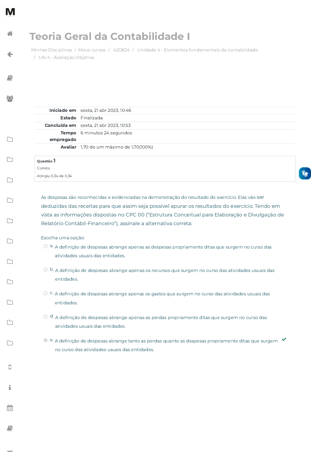 Minhas Disciplinas / Meus cursos / 420824 / Unidade 4 - Elementos fundamentais da contabilidade / UN 4 - Avaliação Objetiva Teoria Geral da Contabilidade I Iniciado em sexta, 21 abr 2023, 10:46 Estado Finalizada Concluída em sexta, 21 abr 2023, 10:53 Tempo empregado 6 minutos 24 segundos Avaliar 1,70 de um máximo de 1,70(100%) Questão 1 Correto Atingiu 0,34 de 0,34 As despesas são reconhecidas e evidenciadas na demonstração do resultado do exercício. Elas vão ser deduzidas das receitas para que assim seja possível apurar os resultados do exercício. Tendo em vista as informações dispostas no CPC 00 (“Estrutura Conceitual para Elaboração e Divulgação de Relatório Contábil-Financeiro"), assinale a alternativa correta: Escolha uma opção: a. A de�nição de despesas abrange apenas as despesas propriamente ditas que surgem no curso das atividades usuais das entidades. b. A de�nição de despesas abrange apenas os recursos que surgem no curso das atividades usuais das entidades. c. A de�nição de despesas abrange apenas os gastos que surgem no curso das atividades usuais das entidades. d. A de�nição de despesas abrange apenas as perdas propriamente ditas que surgem no curso das atividades usuais das entidades. e. A de�nição de despesas abrange tanto as perdas quanto as despesas propriamente ditas que surgem no curso das atividades usuais das entidades. https://avap.multivix.edu.br/my/ https://avap.multivix.edu.br/course/view.php?id=20252 https://avap.multivix.edu.br/course/view.php?id=20252§ion=5 https://avap.multivix.edu.br/mod/quiz/view.php?id=1313177 https://avap.multivix.edu.br/my/ https://avap.multivix.edu.br/course/view.php?id=20252 https://avap.multivix.edu.br/user/index.php?id=20252 https://avap.multivix.edu.br/course/view.php?id=20252§ion=1 https://avap.multivix.edu.br/course/view.php?id=20252§ion=2 https://avap.multivix.edu.br/course/view.php?id=20252§ion=3 https://avap.multivix.edu.br/course/view.php?id=20252§ion=4 https://avap.multivix.edu.br/course/view.php?id=20252§ion=5 https://avap.multivix.edu.br/course/view.php?id=20252§ion=6 https://avap.multivix.edu.br/course/view.php?id=20252§ion=7 https://avap.multivix.edu.br/course/view.php?id=20252§ion=8 https://avap.multivix.edu.br/course/view.php?id=20252§ion=9 https://avap.multivix.edu.br/course/view.php?id=20252§ion=10 https://avap.multivix.edu.br/course/view.php?id=20252§ion=11 https://avap.multivix.edu.br/hooks/portal/ https://avap.multivix.edu.br/mod/page/view.php?id=1252%2F%22%20target%3D%22_blank https://avap.multivix.edu.br/calendar/view.php/ https://avap.multivix.edu.br/local/staticpage/view.php?page=biblioteca https://portalweb.multivix.edu.br/gabaritos/login.aspx https://avap.multivix.edu.br/ Questão 2 Correto Atingiu 0,34 de 0,34 Questão 3 Correto Atingiu 0,34 de 0,34 O balanço patrimonial é uma das demonstrações mais importantes da contabilidade, pois apresenta a estrutura patrimonial das entidades, de maneira estática. De acordo com o CPC 26 (“Apresentação das demonstrações contábeis”), o balanço patrimonial deve apresentar a seguinte estrutura: Escolha uma opção: a. Caixa / Clientes / Fornecedores. b. Caixa / Clientes / Estoques. c. Não há ordem a seguir. d. Caixa / Fornecedores / Impostos. e. Caixa / Clientes / Imobilizado. De forma geral, os passivos são as obrigações das empresas, ou seja, os valores que as organizações têm a pagar. De acordo com o CPC 00 (“Estrutura Conceitual para Elaboração e Divulgação de Relatório Contábil-Financeiro"), passivo é uma obrigação presente da entidade, derivada de eventos já ocorridos, cuja liquidação se espera que resulte em saída de recursos capazes de gerar benefícios econômicos. Diante dessas informações, assinale a alternativa correta: Escolha uma opção: a. Todas as contas patrimoniais devem fazer parte do passivo. b. As contas do passivo são compostas por bens e direitos. c. As contas classi�cadas como tangíveis dizem respeito a bens não mensuráveis e fazem parte do passivo. d. O passivo possui uma semelhança com o ativo: sua classi�cação. Da mesma forma que os ativos são classi�cados em circulante e não circulante, aplicamos o mesmo conceito aos passivos. e. As obrigações, por mais que possam ser enquadradas nas contas ativas, devem ser classi�cadas como passivo. https://avap.multivix.edu.br/my/ https://avap.multivix.edu.br/course/view.php?id=20252 https://avap.multivix.edu.br/user/index.php?id=20252 https://avap.multivix.edu.br/course/view.php?id=20252§ion=1 https://avap.multivix.edu.br/course/view.php?id=20252§ion=2 https://avap.multivix.edu.br/course/view.php?id=20252§ion=3 https://avap.multivix.edu.br/course/view.php?id=20252§ion=4 https://avap.multivix.edu.br/course/view.php?id=20252§ion=5 https://avap.multivix.edu.br/course/view.php?id=20252§ion=6 https://avap.multivix.edu.br/course/view.php?id=20252§ion=7 https://avap.multivix.edu.br/course/view.php?id=20252§ion=8 https://avap.multivix.edu.br/course/view.php?id=20252§ion=9 https://avap.multivix.edu.br/course/view.php?id=20252§ion=10 https://avap.multivix.edu.br/course/view.php?id=20252§ion=11 https://avap.multivix.edu.br/hooks/portal/ https://avap.multivix.edu.br/mod/page/view.php?id=1252%2F%22%20target%3D%22_blank https://avap.multivix.edu.br/calendar/view.php/ https://avap.multivix.edu.br/local/staticpage/view.php?page=biblioteca https://portalweb.multivix.edu.br/gabaritos/login.aspx https://avap.multivix.edu.br/ Questão 4 Correto Atingiu 0,34 de 0,34 Questão 5 Correto Atingiu 0,34 de 0,34 O patrimônio líquido de uma organização é a diferença entre o ativo e o passivo. De acordo com a Lei n. 6.404/1976, o patrimônio líquido deve respeitar uma ordem, que é a seguinte: Escolha uma opção: a. Capital social, reserva de capital, reservas de lucro, ações em tesouraria, lucros acumulados, ajuste de avaliação patrimonial. b. Capital social, reserva de capital, reservas de lucro, aç