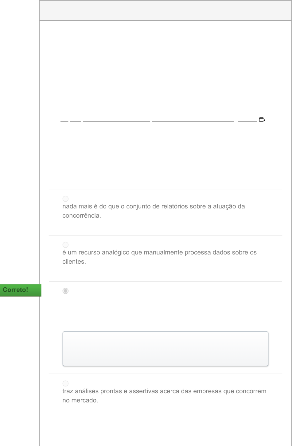 Pontuação desta tentativa: 1 de 1 Enviado 7 mar em 16:53 Esta tentativa levou 10 minutos. 0,2 / 0,2 ptsPergunta 1 Leia o texto a seguir: O BI (Business Intelligence) ajuda as organizações a analisar dados históricos e atuais, para que possam descobrir rapidamente insights práticos para a tomada de decisões estratégicas. As ferramentas de Business Intelligence tornam isso possível processando grandes conjuntos de dados em várias fontes e apresentando as descobertas em formatos visuais fáceis de entender e compartilhar. Fonte: O que é Business Intelligence? Microsoft Power Bi. Disponível em: https://powerbi.microsoft.com/pt-br/what-is-business-intelligence/. O Big Data faz parte da temática relativa à Business Intelligence a medida em que nada mais é do que o conjunto de relatórios sobre a atuação da concorrência. é um recurso analógico que manualmente processa dados sobre os clientes. corresponde aos dados, em grande quantidade, produzidos a cada segundo. Correto!Correto! A alternativa está correta, pois o Big Data significa, na tradução para o português, grandes dados, ou seja, é o grande volume de dados que o contexto das empresas geram devido sua existência e transações, a cada milésimo de segundo. traz análises prontas e assertivas acerca das empresas que concorrem no mercado. https://powerbi.microsoft.com/pt-br/what-is-business-intelligence/ é uma ferramenta tecnológica que possui um sistema de processamento de dados em escala. 0,2 / 0,2 ptsPergunta 2 Leia o texto a seguir: Não é segredo para ninguém que as empresas atualmente têm que lidar com um vasto volume de informações. Também não é segredo que as informações, em sua maioria, estão armazenadas em bancos de dados digitais e têm naturezas diversas: científica, comercial, governamental etc. Nesse contexto, identificar o que é relevante e criar valor para um determinado negócio seria uma tarefa impossível se não fosse o auxílio de ferramentas adequadas — e uma delas é o Data Mining. Fonte: GUIMARAES. L. O que é Data Mining e como pode ajudar a sua empresa. Know Solutions. Disponível em: https://www.knowsolution.com.br/o-que-e-data- mining-e-como-pode-ajudar-a-sua-empresa/ Adaptado. Considerando a importância do Data Mining para as organizações, avalie as afirmações a seguir: I. O Data Mining, também conhecido como ERP, é um sistema de planejamento de recursos empresariais de alto valor. II. O Data Mining permite a extração de conhecimentos que, à princípio, são desconhecidos para a organização. III. O Data Mining, assim como CRM utiliza uma técnica para manter o bom relacionamento com o cliente. IV. O Data Mining consegue explorar diversos dados, permitindo assim diferentes correlações. É correto o que se afirma em: II, apenas. I e II, apenas. II e IV, apenas. Correto!Correto! III e IV, apenas. III, apenas. A alternativa está correta, pois apenas as afirmações I e II estão corretas. A afirmação I está incorreta, pois o Data Mining é uma ferramenta diferente do ERP, uma vez que se refere a mineração de dados. A afirmação II está correta, pois o Data Mining consiste em explorar dados úteis. A afirmação III está incorreta, pois o CRM não é Data Mining e sim uma outra ferramenta de Business Intelligence. A afirmação IV está correta, pois o Data mining captura dados segundo regras de associações, o que possibilita considerá-los em subconjuntos e fazer diferentes correlações. 0,2 / 0,2 ptsPergunta 3 Leia o texto a seguir: Durante décadas, a gestão funcionou como um jogo — ganhava o player que fazia as melhores previsões e se antecipava aos movimentos dos outros jogadores. O que dava a ele a capacidade de pensar na próxima jogada: know-how? Intuição? Mesmo que não haja uma resposta, o fato é que esse tipo de gestão sempre trouxe riscos, mas, hoje, o Business Intelligence promete mudar essa realidade. Fonte: Inteligência de mercado: traga o Business Intelligence para o seu lado. Panorama Positivo, 26 ago. 2020. Disponível em: https://www.meupositivo.com.br/panoramapositivo/business-intelligence/ . Considerando as informações, avalie as afirmações abaixo: I. Uma empresa que faz uso de relatório inteligentes, com alta qualidade e com informações compreensivas sobre os dados, está fazendo bom uso do Business Intelligence. II. As organizações que possuem informações assertivas acerca de seu cenário, seja sob a forma de recursos gráficos, mapas, etc., estão atuando com inteligência de mercado. III. Os conhecimentos gerados pela inteligência de mercado não têm base em achismo, antes considera pesquisas sérias sobre as informações úteis para a empresa. É correto o que se afirma em: II, apenas. I, II e III. Correto!Correto! I e II, apenas. II e III, apenas. III, apenas. A alternativa está correta, pois as afirmações I, II e III estão corretas. A afirmação I está correta, pois a organização que usa relatórios inteligentes capta mais facilmente os insights do mercado. A afirmação II está correta, pois a empresa que trata dados, atua com o Business Intelligence e dessa forma consegue aproveitar as oportunidades que surgem. A afirmação III está correta, pois a empresa que encaminha pesquisas de mercado obtém dados reais do mesmo para acompanhamentos diversos como demandas de produtos, hábitos de consumo etc. 0,2 / 0,2 ptsPergunta 4 Leia o texto a seguir: Bons gestores estão sempre buscando melhorar a performance de suas empresas. Para isso, existem ferramentas que têm o objetivo de fazer com que essa meta seja alcançada. Uma delas é o Enterprise Resource Planning (ERP). Grandes empresas, que contam com elevada produção, movimentação e prestação de serviços e produtos, inevitavelmente precisam de um controle mais sistemático e organizado para seus serviços de Tecnologia da Informação (TI). Esses serviços englobam aquelas atividades que precisam de monitoramento constante e das quai