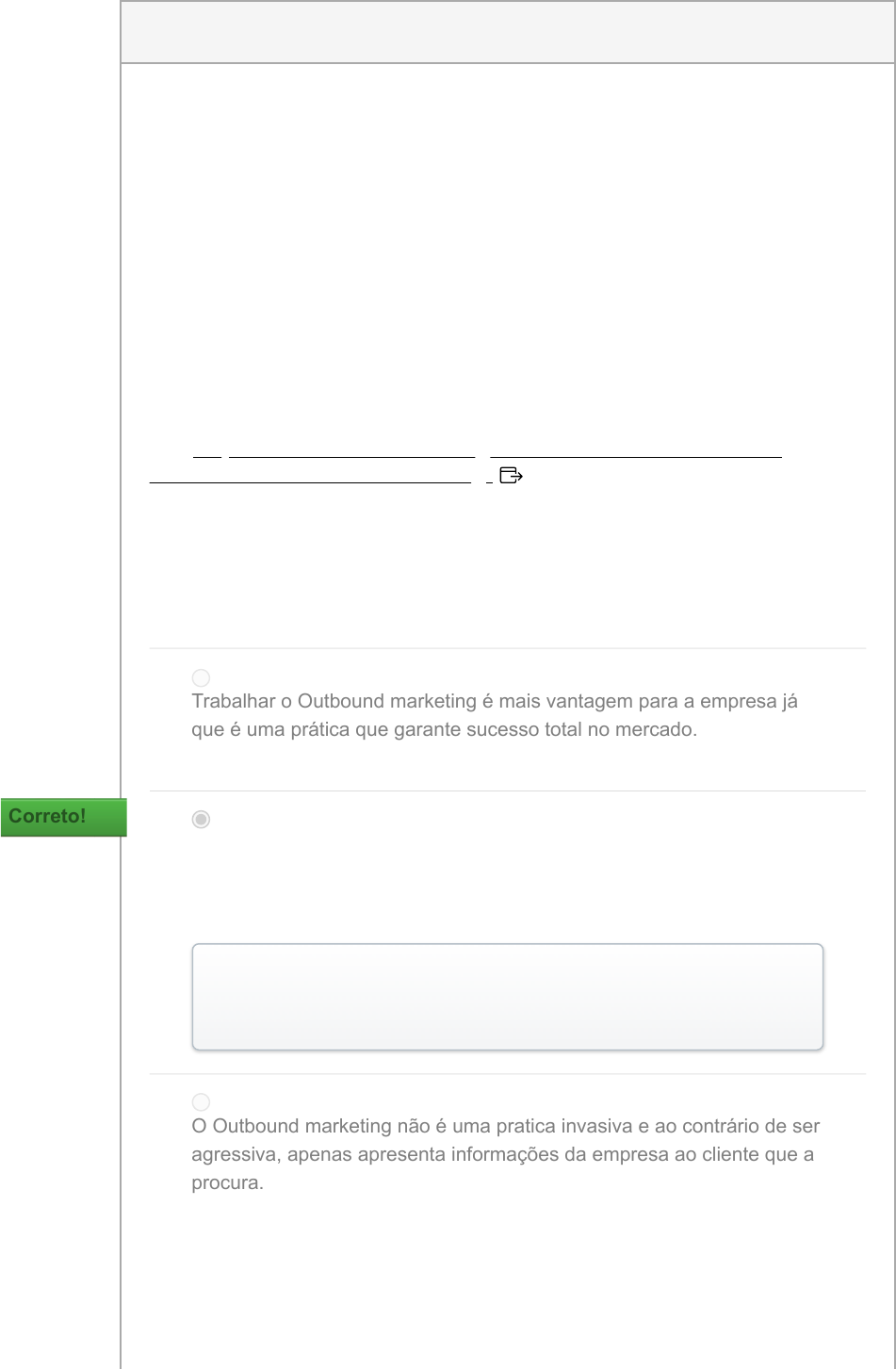 Pontuação desta tentativa: 1 de 1 Enviado 9 mar em 9:46 Esta tentativa levou 11 minutos. 0,2 / 0,2 ptsPergunta 1 Leia o texto a seguir: O Outbound Marketing é conhecido como marketing de interrupção, porque procura o cliente de uma forma mais direta, interrompendo a atividade que ele está fazendo. A vantagem do Outbound, é que ele atinge um público grande que já foi pré-selecionado, de acordo com os perfis de clientes que a empresa deseja. Com isso, as chances, da quantidade de clientes crescer mais rapidamente aumentam e a chegada de mais clientes significa a entrada de mais dinheiro e de crescimento para as empresas. Fonte: VETTORE. R. Entenda a diferença entre Inbound e Outbound Marketing. Mais Clicks, 18 mar. 2018. Disponível em: https://maisclicks.com/blog/entenda-a-diferenca-entre- inbound-e-outbound-marketing/ . Considerando as informações apresentadas, assinale a opção correta: Trabalhar o Outbound marketing é mais vantagem para a empresa já que é uma prática que garante sucesso total no mercado. O Outbound marketing, de forma contrária ao Inbound marketing, trabalha com uso de panfletagem virtual, de forma intromissiva. Correto!Correto! A alternativa está correta, pois o Outbound é uma técnica tradicional de abordagem de clientes que leva a marca da empresa e seu produto até o cliente, interrompendo-o, seja através de anúncios, telemarketing, links patrocinados etc. O Outbound marketing não é uma pratica invasiva e ao contrário de ser agressiva, apenas apresenta informações da empresa ao cliente que a procura. https://maisclicks.com/blog/entenda-a-diferenca-entre-inbound-e-outbound-marketing/ O Outbound possui taxa de rejeição baixa, contudo isso acontece por parte dos clientes. O Outbound não implica em qualquer custo para a empresa e por essa razão é utilizada por todas elas. 0,2 / 0,2 ptsPergunta 2 Leia o texto a seguir: O ramo da inteligência que visa a detecção, prevenção e neutralização de ameaças é chamado contrainteligência. Seu objetivo é proteger a própria agência de inteligência, seus métodos, processos, instalações e ações de inteligência adversa, consideradas ameaças. Exemplo disto é a contraespionagem visando neutralizar espião de outra agência, neste caso, a contrainteligência policial age para evitar que um criminoso entre nos quadros da polícia e assim por diante. Também no campo privado a contrainteligência marca seu lugar em questões afetas a espionagem industrial e econômica. Fonte: SUZART, P.S; ROSSETI, D. A inteligência e a contrainteligência no mundo corporativo. IBDEE – Instituto Brasileiro de Direito e Ética Empresarial. Disponível em: https://ibdee.org/artigos/a-inteligencia-e-a- contrainteligencia-no-mundo-corporativo/ . Considerando as informações, avalie as afirmações a seguir: I. A contraespionagem atua para afastar quem possa prejudicar a organização mediante a sua atuação no mercado. II. A contrainteligência é utilizada por empresas de TI que fazem uso de processamento de dados secretos. III. Detectar ou obstruir riscos são algumas das práticas comuns da contrainteligência. IV. A contrainteligência trabalha com prevenção de ameaças, como ações de hackers ao sistema da empresa. Estão corretas apenas a(s) afirmações(s): https://ibdee.org/artigos/a-inteligencia-e-a-contrainteligencia-no-mundo-corporativo/ I, III e IV. Correto!Correto! IV. I e II. II e III. III. Alternativa está correta, pois apenas as afirmações I, III e IV estão corretas. A afirmação I está correta, pois a contrainteligência obstrui intervenções invasivas negativas à empresa. A afirmação II está incorreta, pois a contrainteligência é utilizada por qualquer tipo de empresa e não apenas as empresas de TI. A afirmação III está correta, pois a contrainteligência atua retendo ataques, evitando roubo de dados. A afirmação IV está correta, pois a contrainteligência ativamente promove a segurança da organização. 0,2 / 0,2 ptsPergunta 3 Leia o texto a seguir: Com o passar dos anos, o Inbound Marketing evoluiu de um mero conceito para tornar-se uma das principais estratégias de marketing para o desenvolvimento de negócios online. O Inbound Marketing consiste em traçar um caminho orgânico para que as pessoas se interessem pelo que o seu negócio tem a oferecer e, com isso, elas mesmas procurem a sua empresa. Assim, utilizam- se “chamarizes”: posts no seu blog, e-books , podcasts, redes sociais e mais. Esse tipo de estratégia de marketing de conteúdo tem como objetivo atrair os consumidores certos até a sua marca, gerando cada vez mais oportunidades de venda. Fonte: BRUM, E. Inbound Marketing – O que é? Por que fazer? Como fazer? Dinamize. Disponível em: https://www.dinamize.com.br/blog/inbound- marketing/ . Refletindo sobre o Inbound marketing, avalie as seguintes asserções e a relação proposta entre elas. I. O Inbound marketing é uma estratégia passiva e indireta no que se refere à abordagem de clientes. PORQUE https://www.dinamize.com.br/blog/ebook/ https://www.dinamize.com.br/blog/inbound-marketing/ II. O Inbound marketing faz com que o cliente morda a isca da empresa, voluntariamente. A respeito dessas asserções, assinale a opção correta: A asserção I é uma proposição verdadeira, e a II é uma proposição falsa. As asserções I e II são ambas proposições falsas. A asserção I é uma proposição falsa, e a II é uma proposição verdadeira. As asserções I e II são proposições verdadeiras, e a II é uma justificativa da I. Correto!Correto! As asserções I e II são proposições verdadeiras, mas a II não é uma justificativa da I. A alternativa está correta, pois as asserções I e II são proposições verdadeiras, e a II é uma justificativa da I. A asserção I é verdadeira, pois o Inbound marketing não aborda clientes de forma ativa e direta, interrompendo-o, antes, o faz de forma discreta. A asserção II é verdadeira