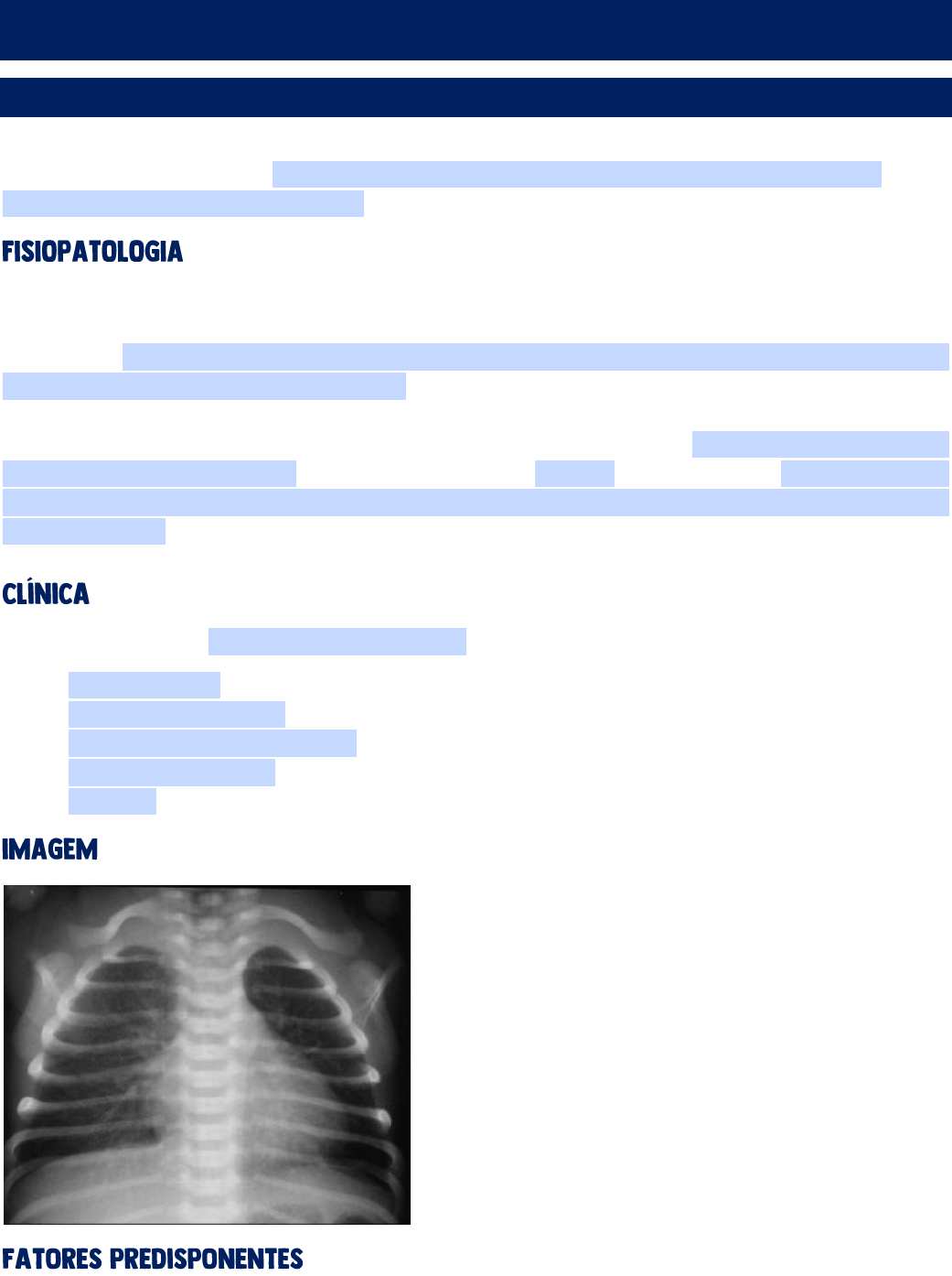 DISTÚRBIOS RESPIRATÓRIOS DO RN SÍNDROME DO PULMÃO ÚMIDO A síndrome do pulmão úmido, também conhecida como taquipneia transitória do RN (TTRN), consiste em doença respiratória de intensidade leve a moderada, com evolução benigna e autolimitada, que pode ocorrer em qualquer RN. Na vida intrauterina, os pulmões do feto são preenchidos por um líquido, que é secretado pelas células epiteliais das vias aéreas e é importante para o desenvolvimento pulmonar. À medida que o parto se aproxima, ocorre a diminuição da secreção e aumento da reabsorção desse líquido. Durante o trabalho de parto, um percentual desse líquido é removido e, ao nascimento, o restante é eliminado nas primeiras horas de vida pelos capilares pulmonares e sistema linfático. Contudo, na TTRN, há uma diminuição da reabsorção desse líquido, o que causa o edema, levando à diminuição da complacência pulmonar, aumento do esforço respiratório, aprisionamento do ar e hiperinsuflação. Se manifesta logo após o nascimento (até 2h após o parto) e resolve-se em 24-48h. • FR: 80-120 rpm (FR normal: 40-60 rpm) • Retração intercostal • Batimento de asas do nariz • Gemido expiratório • Cianose (variável) • Hiperexpansão pulmonar • Rebaixamento do diafragma • Aumento da trama broncovascular • Líquidos septais O quadro melhora rapidamente (6h) • Cesárea eletiva sem trabalho de parto • Nascimento prematuro • Sedação materna • Trabalho de parto prolongado • Filho de mãe diabética • Macrossomia • APGAR <7 no primeiro minuto O Diagnóstico do desconforto respiratório pode ser feito através do Boletim de Silverman-Andersen (BSA), que mede o grau de desconforto e estima a gravidade do comprometimento pulmonar. • BSA < 5 = Dificuldade respiratória leve • BSA ≥ 10 = Grau máximo de dispneia • Oxigenação o FIO2 baixa - < 40%: não costumam necessitar de oferta muito alta de oxigênio o HOOD (Capacete) o CPAP nasal • Controle térmico/ambiente térmico neutro • Controle da glicemia • Alimentação/SOG: FR > 60-80 rpm aumentam o trabalho respiratório e impedem a alimentação oral. Nesse caso, deve-se avaliar o fornecimento da nutrição por SOG ou fluidos intravenosos. • Hidratação venosa • Monitorização • Benigna e autolimitada • Resolve-se dentro de 24-48h • Melhora progressiva • Bom prognóstico • Sem complicações ou sequelas • Pneumonia • Cardiopatia • Doença da Membrana Hialina: consiste na Síndrome do Desconforto Respiratório (SDR) e ocorre devido à deficiência de surfactante. É mais comum em prematuros.