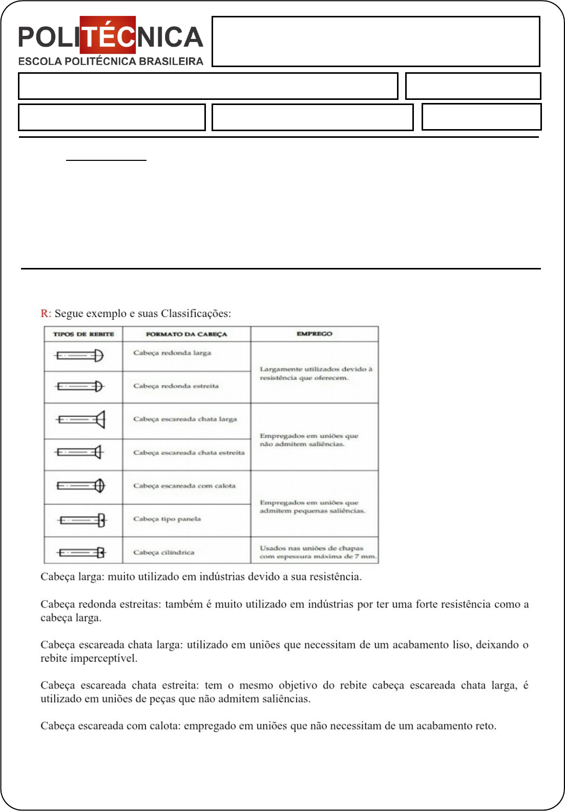 Atividade de Pesquisa 02: Elementos de Máquinas 1 – Pesquise na ABNT NBR 9580: 2015 (ASSOCIAÇÃO BRASILEIRA DE NORMAS TÉCNICAS, 2015), a classificação dos rebites de acordo com o formato da cabeça. Cite os tipos e comente. Elementos de Máquinas Aluno (a): Alisson da silva oliveira Data: 21/05/2023 Atividade de Pesquisa 02 NOTA: INSTRUÇÕES: Esta Atividade de pesquisa contém 06 questões, totalizando 10 (dez) pontos. Você deve preencher dos dados no Cabeçalho para sua identificação o Nome / Data de entrega Utilize o espaço abaixo destinado para realizar a atividade. Ao terminar grave o arquivo com o nome Atividade de Pesquisa 01(nome do aluno). Envie o arquivo pelo sistema. Atividade de Pesquisa 02: Elementos de Máquinas 2 – Os parafusos podem ser providos de cabeça para permitir o atarraxamento, cada qual com uma configuração projetada para a aplicação específica. Pesquise sobre o tipo de cabeça de parafuso e sua finalidade. Atividade de Pesquisa 02: Elementos de Máquinas 3 – Quer saber como são fabricados alguns tipos de roscas? 4 – O que é soldagem e quais os tipos? 5 – Quais as Vantagens e desvantagens da soldagem com eletrodo revestido, da soldagem TIG e da MIG/MAG? Atividade de Pesquisa 02: Elementos de Máquinas 6 – Elabore um resumo contendo informações de quando um componente deve ser soldado. 7 – O que é fixação por interferência? Cite exemplos. 8 – Na construção de máquinas, as molas helicoidais de arame de aço são as mais empregadas. Justifique essa afirmação. 9 – O que é têmpera e quais as suas etapas? Atividade de Pesquisa 02: Elementos de Máquinas 10 - Identifique como funcionam os acoplamentos, freios e volantes.