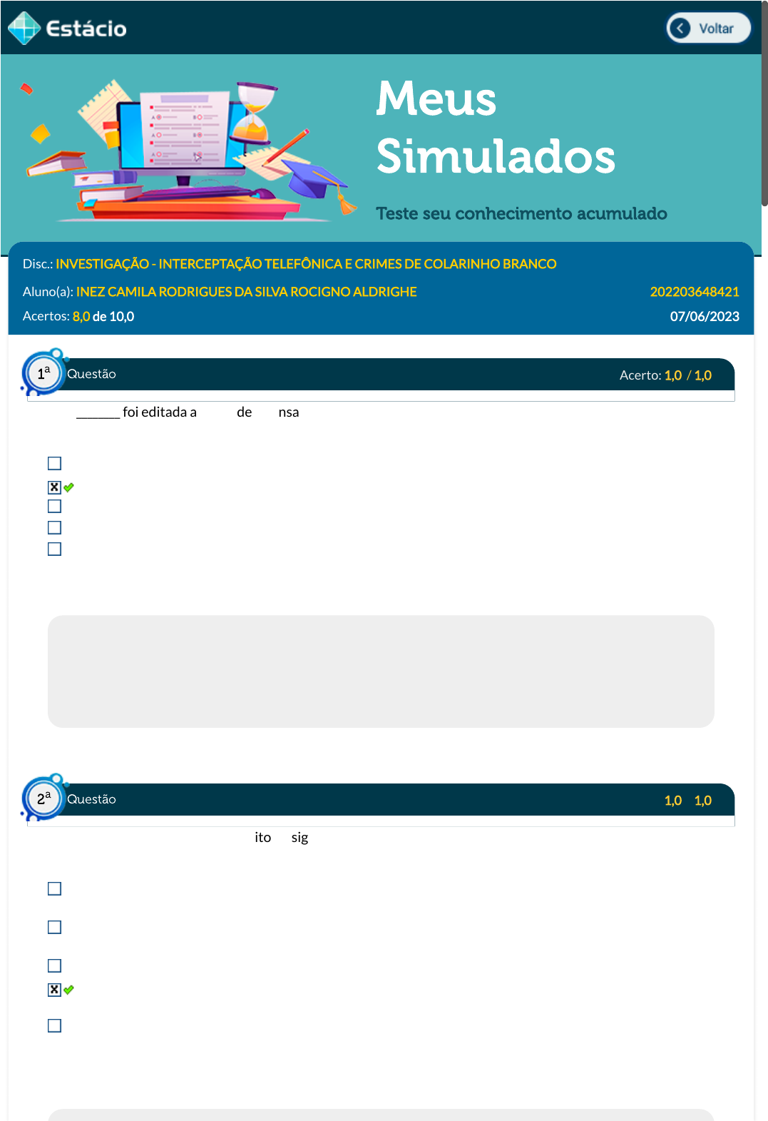 07/06/2023, 22:08 Estácio: Alunos https://simulado.estacio.br/alunos/ 1/1 Meus Simulados Teste seu conhecimento acumulado Disc.: INVESTIGAÇÃO - INTERCEPTAÇÃO TELEFÔNICA E CRIMES DE COLARINHO BRANCO Aluno(a): INEZ CAMILA RODRIGUES DA SILVA ROCIGNO ALDRIGHE 202203648421 Acertos: 8,0 de 10,0 07/06/2023 Acerto: 1,0 / 1,0 A ___________ foi editada a partir de intensa discussão sobre a "CPI dos grampos telefônicos" com a intenção de disciplinar e uniformizar o procedimento da interceptação telefônica pelo Poder Judiciário. Lei nº 9.296/96. Resolução nº 59 do CNJ. Resolução nº 415 do CNMP. Lei nº 12.965/14 (Marco Civil da Internet). Lei nº 4.117/62 (Código Brasileiro de Telecomunicações). Respondido em 07/06/2023 21:47:11 Explicação: Foi a Resolução nº 59, de 9 de setembro de 2008, de ordem do Conselho Nacional de Justiça (CNJ) que disciplinou e uniformizou as rotinas visando ao aperfeiçoamento o procedimento de interceptação de comunicações telefônicas e de sistemas de informática e telemática nos órgãos jurisdicionais do Poder Judiciário, a que se refere a Lei nº 9.296, de 24 de julho de 1996. Acerto: 1,0 / 1,0 A interceptação telefônica e o direito ao sigilo das comunicações, ao longo dos anos, foi objeto de tratamento legal por diferentes diplomas legais. Sobre o tema, assinale a alternativa correta. Nenhuma lei posterior à de nº 9.296/96 buscou regulamentar a temática da interceptação no âmbito da rede mundial de computadores. De acordo com o Código Brasileiro de Telecomunicações (Lei nº 4.117/62), o conhecimento dado ao juiz competente, mediante requisição ou intimação, constitui violação de telecomunicação. A inviolabilidade do sigilo da correspondência somente teve assento constitucional a partir de 1988. A Lei nº 9.296/96 aplica-se tanto à interceptação do �uxo de comunicações em sistemas de informática quanto em telemática. Antes de 1996, não era possível determinar uma interceptação telefônica, pois não existia lei especí�ca que a regulamentasse. Respondido em 07/06/2023 21:48:03 Questão1 a Questão2 a https://simulado.estacio.br/alunos/inicio.asp javascript:voltar();