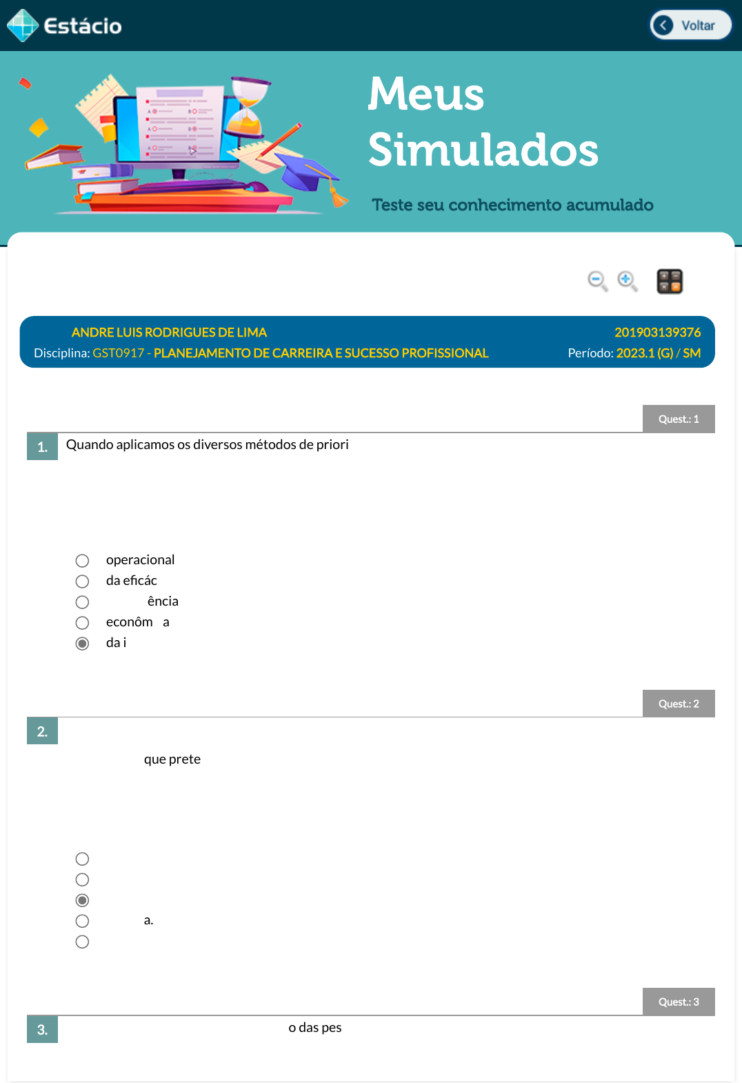 Meus Simulados Teste seu conhecimento acumulado Quest.: 1 Quando aplicamos os diversos métodos de priorização de atividades para gerar uma ordem de prioridades e organizar as nossas atividades na busca pela gestão do tempo, matrizes como as de Eisenhower, ou outras matrizes colocam que as atividades que são urgentes e não têm prioridade devem ser delegadas a outras pessoas. Essa forma de tratar algumas atividades nos garante a expansão de nossa capacidade produtiva e de gestão do nosso tempo, ampliando o nosso alcance e realizações. A essa prática está relacionada com a melhoria Quest.: 2 VUNESP (Adaptada) - 2020 Para pessoas que pretendem melhorar a sua performance, atingirem seus objetivos e otimizarem os resultados obtidos diariamente, é imprescindível que apliquem técnicas de gerenciamento das rotinas e do tempo. É imprescindível, também, que estabeleçam indicadores para medir o quanto se está atingindo os objetivos, cumprindo as metas e conseguindo alcançar ou superar seus resultados. Os indicadores que medem o cumprimento dos objetivos são indicadores de Quest.: 3 A partir dos anos 1990, o protagonismo das pessoas passa a ser predominante nos estudos de carreira. O indivíduo se torna o principal responsável pela gestão de sua carreira e dá espaço surgimento das novas carreiras, sobre as quais podemos dizer que: Lupa Calc. Aluno: ANDRE LUIS RODRIGUES DE LIMA Matr.: 201903139376 Disciplina: GST0917 - PLANEJAMENTO DE CARREIRA E SUCESSO PROFISSIONAL Período: 2023.1 (G) / SM 1. operacional da e�cácia da e�ciência econômica da ine�cácia 2. produtividade. lucratividade. e�ciência. e�cácia. qualidade. 3. javascript:voltar(); javascript:alert('Quest%C3%A3o com o c%C3%B3digo de refer%C3%AAncia 201910846054.') javascript:alert('Quest%C3%A3o com o c%C3%B3digo de refer%C3%AAncia 201909251368.') javascript:alert('Quest%C3%A3o com o c%C3%B3digo de refer%C3%AAncia 201909249995.') javascript:diminui(); javascript:aumenta(); javascript:calculadora_on(); Quest.: 4 Considerando a importância do autoconhecimento para orientar a carreira, indique qual dessas dimensões não formam parte desse conhecimento: Quest.: 5 Quais os tipos de gastos possíveis para uma pessoa realizar em seu planejamento �nanceiro? Quest.: 6 Os nutrientes que podem fornecer energia são: Quest.: 7 Sobre os cursos lato sensu, considere a relação entre as asserções abaixo: I. Estes cursos, também chamados de especialização, tem como função o aperfeiçoamento ou atualização de uma área especí�ca PORQUE II. Uma de suas �nalidades é quali�car o egresso para uma determinada função. Sobre a relação entre as asserções assinale a alternativa correta. A estrutura organizacional é a prioridade. São gerenciadas mais pela organização do que pela pessoa. Acontecem somente dentro da organização. Têm a pessoa como prioridade. Têm a hierarquia organizacional como balizadora da carreira. 4. Os valores que consideramos mais importantes. Nível de renda familiar. Fraquezas em relação a nossas atitudes. Propósitos na nossa vida. Competências pro�ssionais destacadas. 5. Gastos gerais, gastos obrigatórios, gastos supér�uos, e gastos de investimentos. Gastos gerais, gastos obrigatórios, gastos de investimentos. Gastos obrigatório, gastos supér�uos, e gastos de investimentos. Gastos transitórios, gastos supér�uos, gastos diários. Gatos transitórios, gastos gerais, gastos obrigatórios, gastos de investimentos. 6. vitaminas e minerais. carboidratos e proteínas. carboidratos e minerais. proteínas e vitaminas. lipídios e vitaminas. 7. Ambas são verdadeiras, mas a II não complementa a I A a�rmativa II e verdadeira e a I é falsa. A a�rmativa I e verdadeira e a II é falsa. Ambas são verdadeiras e a II complementa a I Ambas são falsas. javascript:alert('Quest%C3%A3o com o c%C3%B3digo de refer%C3%AAncia 201909250229.') javascript:alert('Quest%C3%A3o com o c%C3%B3digo de refer%C3%AAncia 201909251174.') javascript:alert('Quest%C3%A3o com o c%C3%B3digo de refer%C3%AAncia 201909219950.') javascript:alert('Quest%C3%A3o com o c%C3%B3digo de refer%C3%AAncia 201907989701.') Quest.: 8 As Diretrizes para o funcionamento do Ensino Superior no Brasil são uma responsabilidade do Ministério da Educação. Sobre esta prerrogativa analise as a�rmativas abaixo: I. Cabe ao Ministério determinar a quantidade de horas necessárias para a integralização dos cursos superiores no país. II. É facultativa a criação de um Projeto Pedagógico de curso III. Os trabalhos de Conclusão de Curso existem em todos os cursos superiores, obrigatoriamente Estão corretas. Quest.: 9 Mariana gosta de se organizar para estudar. Planeja o que vai fazer e utiliza diferentes métodos de estudo. Um deles consiste em selecionar os conceitos principais do conteúdo estudado e organizar uma representação grá�ca, em que os conceitos são interligados na forma de proposições. Esse método é chamado Quest.: 10 O mapa conceitual ou mental é um recurso útil nos estudos e no processo de aprendizagem porque 8. Apenas a a�rmativa I Apenas a a�rmativa II Apenas as a�rmativas II e III Apenas as a�rmativas I e II Apenas a a�rmativa III 9. método Cornell. método pomodoro. �ash cards. mapas mentais ou mapas conceituais. memorização. 10. corresponde a uma exaustiva descrição de todos os pontos estudados. desfaz as relações e ligações entre conceitos e aspectos do conteúdo estudado. representa gra�camente conceitos de forma isolada. contribui para representar conceitos e organizar o conhecimento. ajuda a ter uma visão compartimentada e isolada de cada ponto estudado. Não Respondida Não Gravada Gravada javascript:alert('Quest%C3%A3o com o c%C3%B3digo de refer%C3%AAncia 201907989702.') javascript:alert('Quest%C3%A3o com o c%C3%B3digo de refer%C3%AAncia 201909251195.') javascript:alert('Quest%C3%A3o com o c%C3%B3digo de refer%C3%AAncia 201909251190.')