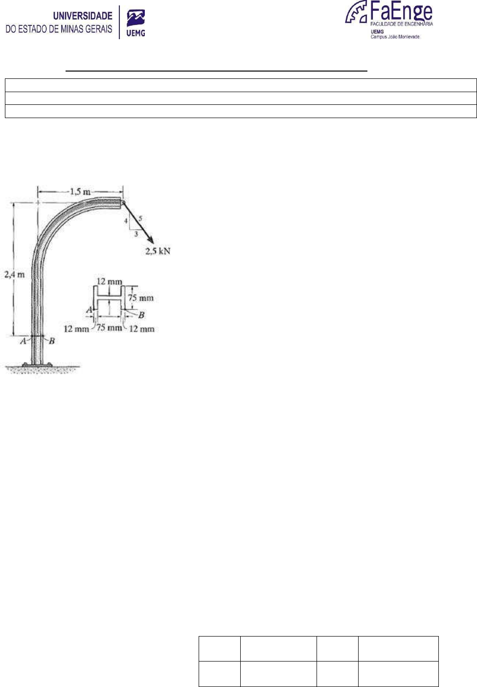 1ª LISTA DE EXERCÍCIOS DE RESISTÊNCIA DOS MATERIAIS II NOME: PROFESSOR: Alberto Souza DISCIPLINA: Resistência dos Materiais II TURMA: EC5 PERÍODO: 5º DATA: VALOR: / 10 pontos 1) A lança de guindaste é submetida a uma carga de 2,5 kN. Determine o estado de tensão nos pontos A e B. Mostre os resultados em um elemento de volume diferencial localizado em cada um desses pontos. Respostas A = 84,13 MPa A = 0 MPa B = -85,61 MPa B = 0 MPa 2) O painel de sinalização está sujeito a carga uniforme do vento de 1,5 kPa. Determine as componentes da tensão nos pontos A, B, C e D no poste de sustentação de 100 mm de diâmetro devido a esta carga. Mostre os resultados em um elemento de volume localizado em cada um desses pontos. Respostas A = 107 MPa A = 15,28 MPa B = 0 MPa B = 14,77 MPa C = - 107 MPa C = 15,28 MPa D = 0 MPa D = 15,79 MPa 3) A travessa ou longarina de suporte principal da carroceria do caminhão está sujeita à carga distribuída uniforme. Determine as tensões de flexão e cisalhamento nos pontos A e B. Respostas A = 0,00 MPa A = 21,26 MPa B = 101,55 MPa B = 0,00 MPa 4) As fibras da madeira da tábua formam um ângulo de 20° com a horizontal como mostra a figura. Determine a tensão normal e a tensão de cisalhamento que agem ao longo das fibras, se a tábua é submetida a uma carga axial de 250 N. Respostas x’ = 19,50 kPa x’y’ = 53,57 kPa 5) O estado de tensão em um ponto em um elemento estrutural é mostrado no elemento. Determine as componentes de tensão que agem no plano inclinado AB. Resolva o problema usando o (a) método do equilíbrio, (b) as equações de transformação de tensão e (c) o círculo de Mohr. Respostas x’ = - 4,052 MPa x’y’ = - 0,404 MPa 6) Determine o estado de tensão equivalente em um elemento, se ele estiver orientado a 30° em sentido anti-horário em relação ao elemento mostrado. Resolva o problema usando (a) as equações de transformação de tensão e (b) o círculo de Mohr. Respostas x’ = 747,7 kPa y’ = - 1.047,7 kPa x’y’ = 345,1 kPa 7) Determine o estado de tensão equivalente em um elemento, se ele estiver orientado a 60° em sentido horário em relação ao elemento mostrado. Resolva o problema usando (a) as equações de transformação de tensão e (b) o círculo de Mohr. Respostas x’ = - 28,92 kPa y’ = 328,92 kPa x’y’ = 69,90 kPa 8) O estado de tensão em um ponto é mostrado no elemento. Determine (a) as tensões principais e (b) a tensão de cisalhamento máxima no plano e a tensão normal média no ponto. Especifique a orientação do elemento em cada caso. Resolva o problema usando as equações de transformação de tensão e o círculo de Mohr. Respostas 1 = 52,97 MPa θp1 = 14,87º 2 = - 67,97 MPa θp2 = - 75,13º máx = 60,47 MPa θs1 = - 30,13º θs2 = 59,87º méd = - 7,50 MPa 9) Um bloco de madeira falhará, se a tensão de cisalhamento que age ao longo da fibra for 3,85 MPa. Se a tensão normal σx = 2,8 MPa, determine a tensão de compressão σy necessária para provocar ruptura. Respostas y = -5,767 kPa 10) A viga tem seção transversal retangular e esta sujeita às cargas mostradas. Determine as tensões principais desenvolvidas no ponto A e no ponto B, localizado imediatamente à esquerda da carga de 20kN. Mostre os resultados em elementos localizados nesses pontos. Respostas A,1 = 29,5 MPa θA,p1 = 0º A,2 = 0 MPa θA,p2 = 90º B,1 = 0,541 MPa θB,p1 = - 54,22° B,2 = -1,041 MPa θB,p1 = 35,78º 11) A viga T está sujeita ao carregamento distribuído aplicado ao longo de sua linha central. Determine as tensões principais nos pontos A e B e mostre os resultados em elementos localizados em cada um desses pontos. Respostas A,1 = 152,15 MPa θA,p1 = 0º A,2 = 0 MPa θA,p2 = 90º B,1 = 0,229 MPa θB,p1 = - 88,04° B,2 = - 195,85 MPa θB,p1 = 1,96º 12) A viga mostrada na figura está sujeita a uma carga inclinada de 2,6 kN. Determine as tensões principais (σ1 e σ2) na viga no ponto P e especifique as orientações dos planos principais (θP1 e θP2). Figura 1 - Vista da lateral da viga Figura 2 - Seção transversal a-a Respostas 1 = 464,95 kPa θP1 = 4,15º 2 = -2,45 kPa θP2 = 94,15º 13) As cargas internas em uma seção da viga são mostradas na figura. Determine as tensões principais no ponto A, ponto B e ponto C, considerando que este último ponto esta localizado na parte inferior da alma da viga. Respostas 1,A = 0,00 MPa 2,A = -77,45 MPa 1,B = 44,11 MPa 2,B = 0,00 MPa 1,C = 54,58 MPa 2,C = -59,82 MPa 14) O eixo maciço está sujeito a torque, momento fletor e força de cisalhamento como mostra a figura. Determine as tensões principais que agem nos pontos A e B e a tensão de cisalhamento máxima absoluta. Respostas Ponto A Ponto B 1 = 5,50 MPa 1 = 1,29 MPa 2 = - 0,61 MPa 2 = -1,29 MPa abs,máx = 3,06 MPa abs,máx = 1,29 MPa 15) A tensão em um ponto é mostrada no elemento. Determine as tensões principais e a tensão de cisalhamento máxima absoluta. Respostas máx = 98,94 MPa mín = -100 MPa abs,máx = 99,47 MPa 16) Uma tubulação de água de 750 mm de diâmetro interno e 12 mm de espessura da parede liga um reservatório R com uma estação geradora S. Sabendo-se que h = 320 m, determinar a máxima tensão normal e a máxima absoluta tensão de cisalhamento na tubulação, em condições estáticas. Considere a densidade da água igual a 10 kN/m³. Respostas máx = 100 MPa abs,máx = 50 MPa 17) O tanque cilíndrico de armazenamento despressurizado tem uma espessura de parede de 4,8 mm e é feito de um aço com 400 MPa de tensão última à tração. Determine a máxima altura h de água que pode ser suportada pelo tanque, se um coeficiente de segurança de valor 4 é desejado. Considere a densidade da água igual a 10 kN/m³. Resposta h = 12,65 m 18) O vaso de pressão cilíndrico tem raio interno de 1,25 m e espessura de parede de 15 mm. É feito de chapas de aço soldadas ao longo de uma linha de junção a 45º em relação à horizontal. Determine as componentes d
