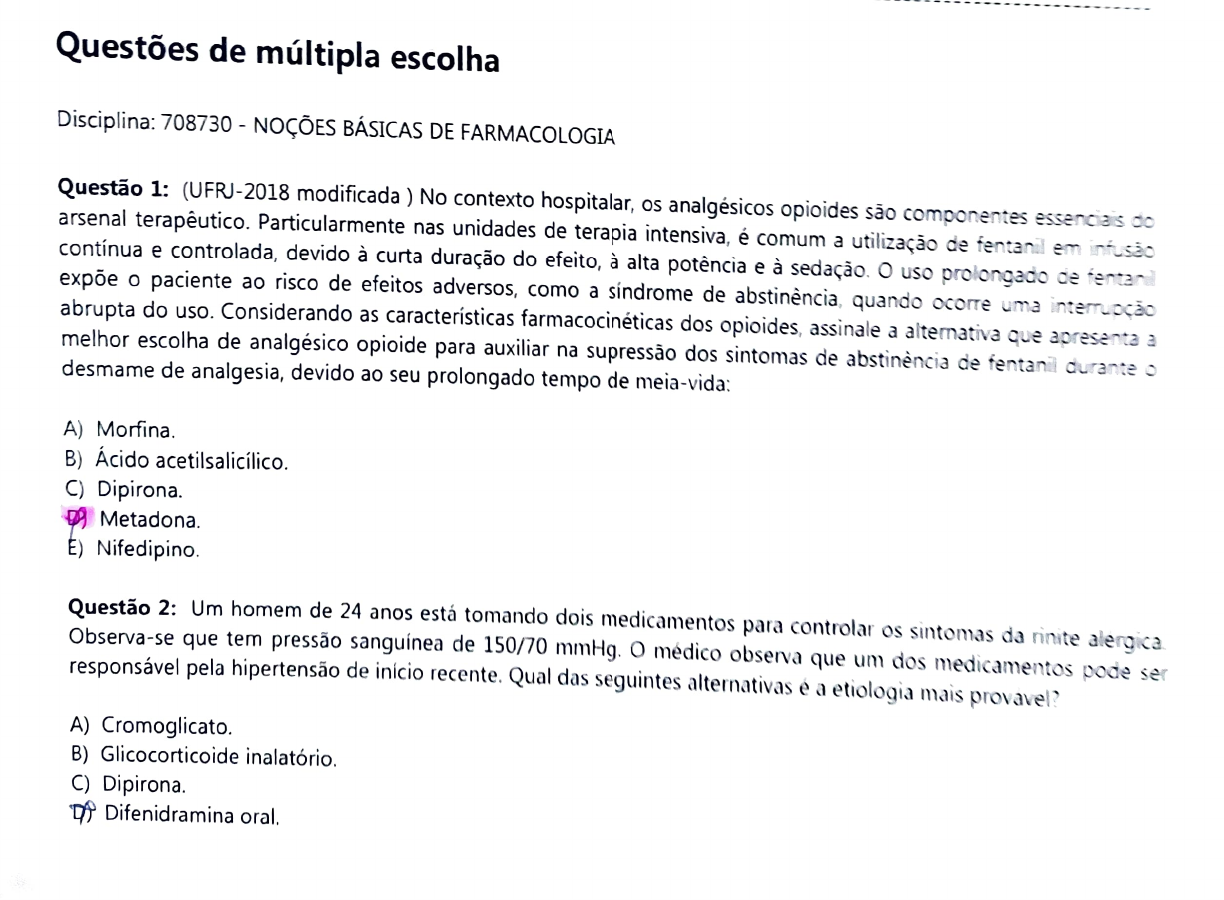 Questões de múltipla escolha Disciplina: 708730 - NOÇÕES BÁSICAS DE FARMACOLOGIA Quest�o 1: (UFRJ-2018 modificada ) No contexto hospitalar, os analgésicos opioides são componentes essenciais o arsenal terapêutico. Particularmente nas unidades de terapia intensiva, é comum a utilização de fentanl em infusao contínua e controlada, devido à curta duração do efeito, à alta potência e à sedação. O uso prolongado ce fentar expõe o paciente ao risco de efeitos adversos, como síndrome de abstinència, quando ocore uma interuocão abrupta do uso. Considerando as caracteristicas farmacocinéticas dos opioides, assinale a alternativa que apresenta a melhor escolha de analgésico opioide para auxiliar na supress�o dos sintomas de abstinència de fentan durante o desmame de analgesia, devido ao seu prolongado tempo de meia-vida: A) Morfina. B) Ácido acetilsalicilico. C) Dipirona. 9 Metadona. E) Nifedipino. Ouest�o 2: Um homem de 24 anos estå tomando dois medicamentos para controlar os sintomas da nnnte alergica Observa-se que tem pressão sanguinea de 150/70 mmHg. O médico observa que um dos medicamentos pode ser responsável pela hipertensão de início recente. Qual das seguintes alternativas é a etiologia mais provavel? A) Cromoglicato. B) Glicocorticoide inalatório. C) Dipirona. D Difenidramina oral. E) Pseudoefedrina oral. Questäo 3: Um casal vai viajar para o Peru e, devido às experiências em viagens no passado, pediu ao medico para prescrever um fármaco contra diarreia. Oual dos sequintes fármacos será eficaz? A) Omeprazol Loperamida C) Famotidina D) Ranitidina E) Lorazepam. 2uestao 4: "As intoxicacões medicamentosas representam um grave problema de saúde pública, que necessita ntevençoes no campo da prevenção e da promoção. Isto demonstra a necessidade de ações educativas, Junto a POpulaçao para reduzir o número de acidentes. A partir de dados secundários do Sistema Nacional de Informações TOxICO-Farmacológicas (Sinitox) foram analisadas as frequências por classe terapêutica, dos casos de intoxicaçao em menores de cinco anos, nos anos de 1997 e 1998 em São Paulo e Rio Grande do Sul. O maior número de casos Correspondeu aos descongestionantes nasais, anticonvulsivantes, anti-histamínicos e expectorantes, que ainda foram responsabilizados pelos óbitos." Em relação aos descongestionantes nasais, é correto afirmar que: I - Descongestionantes nasais tópicos que apresentam riscos de intoxicação aguda são geralmente constituidos por um simpatomimético, tipicamente um agonista de receptor alfal-adrenérgico, em apresentação isolada ou associada com anti-histamínicos. II -Intoxicação por nafazolina, que é a mais frequente, pode causar náuseas, cefaleia, sudorese, irritabilidade, aumento da pressão arterial, distúrbios cardíacos como extra-sístoles e outras arritmias podem aparecer. II - Esses descongestionantes quando utilizados topicamente agem como vasodilatadores para reduzir edema e congestão de mucosas nasal. Pode-se afirmar que está(ão) correta(s): A As afirmativas IeI. B) As afirmativas Ie II. C) As afirmativasI e II. D) Apenas a afirmativa I. E) Todas as afirmativas. Questão 5: O metabolismo de primeira passagem (também conhecido como metabolismo pré-sistêmico ou efeito de primeira passagem) é um fenômeno do metabolismo da droga no qual a concentração da droga é significantemente reduzida pelo figado antes de atingir a circulação sistêmica. Após uma droga ser ingerida, ela é absorvida pelo sistema digestivo e entra no sistema hepático. Antes de atingir o resto do corpo, ela é carregada através da veia porta hepática para o figado. O figado metaboliza muitas drogas, às vezes de tal maneira que somente uma pequena quantidade de droga ativa é lançada a partir do fígado em direção ao resto do sistema circulatório do corpo. Dessa forma, o efeito de primeira passagem irá prejudicar principalmente: A) ligação às proteínas. Adaptado de: MATOS, G. C. et. al., Rev. bras. saúde matern. infant., Recife, 2 (2): 167-176, 2002. B) absorção. P biodisponibilidade. D) distribuição. E) pH do sangue. Questão 6: Um paciente hipertenso de 48 anos vem sendo tratado com sucesso com um diurético tiazídico durante os últimos cinco anos. Nos últimos três meses, sua pressão diastólica aumentou continuamente, e ele iniciou uma medicação adicional contra a hipertens�o. Ele se queixa de várias vezes não ter conseguido obter ereção e faz alqum tempo que não consegue completar três sets de uma partida de tênis. Qual dos seguintes fármacos é mais provavelmente a segunda medicação anti-hipertensiva deste paciente? A) Losartana, B) Captopril. C) Minoxidil. Metoprolol. E) Nifedipino. 2uestao /: "Aprivação de sono afeta a atencão, a cognicão e as defesas imunológicas, facilitando a ocorrencia de cientes e disturbios fisicos ou mentais. Os mecanismos biológicos responsáveis por tais efeitos são pouco compreendidos. Pesquisadores brasileiros publicaram um artigo demonstrando que ratos privados de sono REM (fase 00 sono relacionada aos sonhos em humanos e caracterizada por rápido movimento dos olhos) por 96 horas dpresentaram modificações na expressão de 78 genes do córtex cerebral, responsáveis por funções cognitivas como memoriae atenção, além de processos metabólicos." (Mente & Cérebro, pág. 20, setembro 2009). Barbitúricos e benzodiazepinicos são utilizados como ansiolíticos, anticonvulsivantes e indutores do sono. Dentre os efeitos adversos esperados, toxicidade e outras propriedades dessas classes medicamentosas destacam-se: A Supressão da fase REM do sono quando utilizados como hipnóticos, caracterizada em parte, pela sensaç�o de cansaço prolongado ao acordar. B) Sonol�ncia, ansiedade, hiperexcitação e aprimoramento da destreza manual. C) A síndrome de abstinência pela descontinuação abrupta do tratamento com benzodiazepínicos, que caracteriza-se p