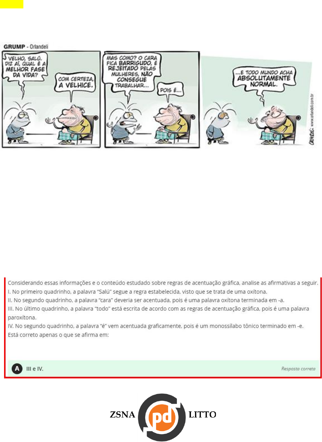 Zolio SN Atividade de Autoaprendizagem 3 de Português Instrumental (Pedagogia) D1.20231.C Observe a tirinha a seguir: Fonte: ORLANDELI, W. Grump: Acordo Ortográfico. 2017. Considerando essas informações e o conteúdo estudado sobre regras de acentuação gráfica, analise as afirmativas a seguir. I. No primeiro quadrinho, a palavra “Salú” segue a regra estabelecida, visto que se trata de uma oxítona. II. No segundo quadrinho, a palavra “cara” deveria ser acentuada, pois é uma palavra oxítona terminada em -a. III. No último quadrinho, a palavra “todo” está escrita de acordo com as regras de acentuação gráfica, pois é uma palavra paroxítona. IV. No segundo quadrinho, a palavra “é” vem acentuada graficamente, pois é um monossílabo tônico terminado em -e. Está correto apenas o que se afirma em: Gostou? Deixa seu like e comenta para que ajude mais pessoas.