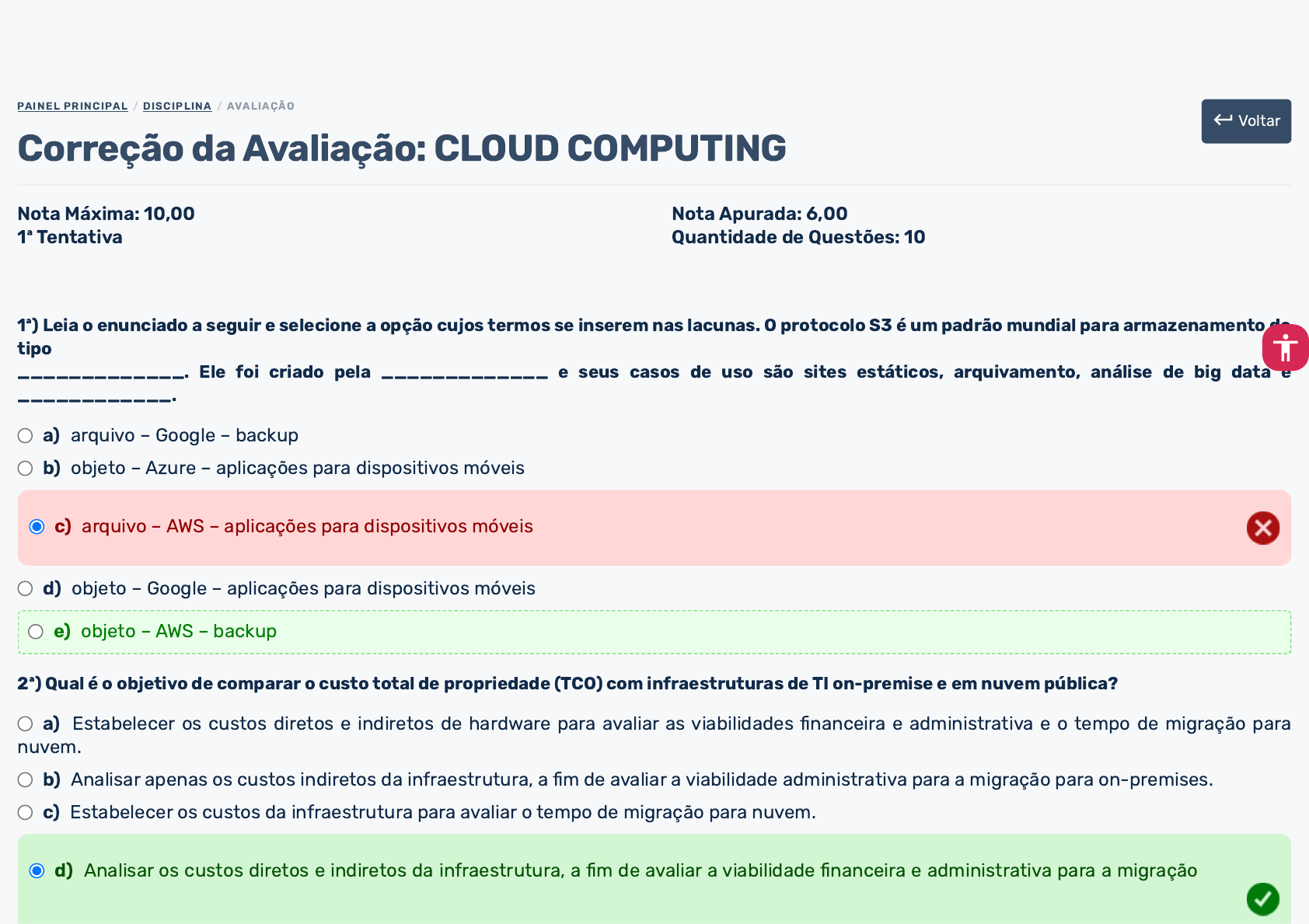 1ª) Leia o enunciado a seguir e selecione a opção cujos termos se inserem nas lacunas. O protocolo S3 é um padrão mundial para armazenamento do tipo _____________. Ele foi criado pela _____________ e seus casos de uso são sites estáticos, arquivamento, análise de big data e ____________. a) arquivo – Google – backup b) objeto – Azure – aplicações para dispositivos móveis c) arquivo – AWS – aplicações para dispositivos móveis d) objeto – Google – aplicações para dispositivos móveis e) objeto – AWS – backup 2ª) Qual é o objetivo de comparar o custo total de propriedade (TCO) com infraestruturas de TI on-premise e em nuvem pública? a) Estabelecer os custos diretos e indiretos de hardware para avaliar as viabilidades �nanceira e administrativa e o tempo de migração para nuvem. b) Analisar apenas os custos indiretos da infraestrutura, a �m de avaliar a viabilidade administrativa para a migração para on-premises. c) Estabelecer os custos da infraestrutura para avaliar o tempo de migração para nuvem. d) Analisar os custos diretos e indiretos da infraestrutura, a �m de avaliar a viabilidade �nanceira e administrativa para a migração PAINEL PRINCIPAL / DISCIPLINA / AVALIAÇÃO Correção da Avaliação: CLOUD COMPUTING Voltar Nota Máxima: 10,00 Nota Apurada: 6,00 1ª Tentativa Quantidade de Questões: 10 https://www.portaleducacionalead.com.br/portal-aluno/painel-principal https://www.portaleducacionalead.com.br/portal-aluno/sala-aula-disciplina.php?disciplina=8337&turma=172&curso=1219 https://www.portaleducacionalead.com.br/portal-aluno/sala-aula-disciplina.php?disciplina=8337&turma=172&curso=1219 para nuvem. e) Analisar apenas os custos diretos da infraestrutura, a �m de avaliar a viabilidade �nanceira para a migração para nuvem privada. 3ª) Segundo o Quadrante Mágico do Gartner de Cloud Infrastructure and Platform Services (IaaS e PaaS) de 2021, quais são as nuvens públicas consideradas líderes? a) AWS, IBM e Apple. b) Alibaba Cloud, AWS e Google. c) Google, Microsoft e Oracle. d) AWS, Microsoft e Google. e) Azure, IBM e Alibaba Cloud. 4ª) Leia o enunciado a seguir e selecione a opção cujos termos se inserem nas lacunas. Os provedores também categorizam alguns _____________ consumidos por empresas em demandas modernas de ____________, em que a nuvem se mostra uma grande aliada nos negócios devido ao modelo de se _____________. a) serviços especí�cos – computação em nuvem – paga valores anuais b) serviços típicos – transformação digital – pagar valores �xos c) serviços especí�cos – transformação digital – pagar o que consome d) serviços especí�cos – adoção de ambiente on-premisses – pagar o que consome e) serviços típicos – transformação digital – pagar o que consome 5ª) Com relação ao modelo de cobrança em nuvem para SaaS, é correto a�rmar que: a) é �xo de acordo com planos anuais e de�nidos previamente sem limites estabelecidos. b) pagamos apenas pelos recursos que são efetivamente usados. c) são aquisições perpétuas de produtos. d) é escalável de acordo com planos �xos e limites de�nidos previamente. e) são aquisições anuais de serviços pelas empresas. 6ª) Com relação aos bancos de dados relacionais e não relacionais, classi�que as assertivas a seguir em F para falsa e V para verdadeira. ( ) Os serviços da nuvem são os mesmos para ambos os tipos de bancos de dados. ( ) O serviço de RDS da AWS é dedicado a bancos não relacionais. ( ) Os serviços de DynamoDB da AWS e Cosmos DB da Azure são dedicados a bancos de dados não relacionais. ( ) Os bancos de dados relacionais são mais tradicionais. ( ) Os bancos de dados relacionais vêm sendo substituídos pelos bancos de dados não relacionais, para aplicações que exigem mais desempenho. a) F, F, V, V, V. b) V, F, F, V, F. c) F, F, V, F, V. d) F, F, V, F, F. e) V, V, V, F, F. 7ª) Para a tarifação de máquinas virtuais na nuvem, quais dos seguintes itens são levados em consideração? 1. vCPUs 2. Sistema operacional 3. Memória RAM 4. Aplicação sem banco de dados que será instalada na máquina virtual 5. Região em que a máquina virtual será alocada É correto o que se a�rma apenas em: a) 1, 3, 2 e 5. b) 1, 2, 4 e 5. c) 2, 3, 4 e 5. d) 1, 2, 3 e 5. e) 1, 2, 3 e 4. 8ª) Leia o enunciado a seguir e selecione a opção cujos termos se inserem nas lacunas. A Google defende um _____________ mais simpli�cado para o planejamento de _____________ e ___________ de nuvem, que utiliza categorias de pessoas, tecnologia e processos para melhorar a organização do ambiente. a) método – con�guração – migração b) framework – administração – migração c) framework – custos – pagamento d) framework – adoção – governança e) método – migração – disponibilidade 9ª) São exemplos de serviços de computação, armazenamento e banco de dados ofertados pela AWS, Azure e Google: a) blobs, da AWS; armazenamento de blobs, do Azure; e EC2, da Google. b) cloud bigtable, da AWS; armazenamento de blobs, do Azure; e EC2, da Google. c) cloud bigtable, da AWS; armazenamento S3, do Azure; e EC2, da Google. d) EC2, da AWS; armazenamento de blobs, do Azure; e cloud bigtable, da Google. e) EC2, da AWS; EBS, da Azure; e cloud bigtable, da Google. 10ª) Qual é a de�nição de despesas de capital (Capex) e despesas operacionais (Opex)? a) Capex são as aquisições de serviços pelas empresas e Opex são os pagamentos mensais de produtos. b) Capex são as aquisições de produtos pelas empresas e Opex são os pagamentos anuais de produtos. c) Capex são as aquisições de produtos pelas empresas e Opex são as aquisições perpétuas de produtos. d) Capex são as aquisições de produtos pelas empresas e Opex são os pagamentos mensais de serviço. e) Capex são as aquisições anuais de serviços pelas empresas e Opex são os pagamentos diários de serviços.