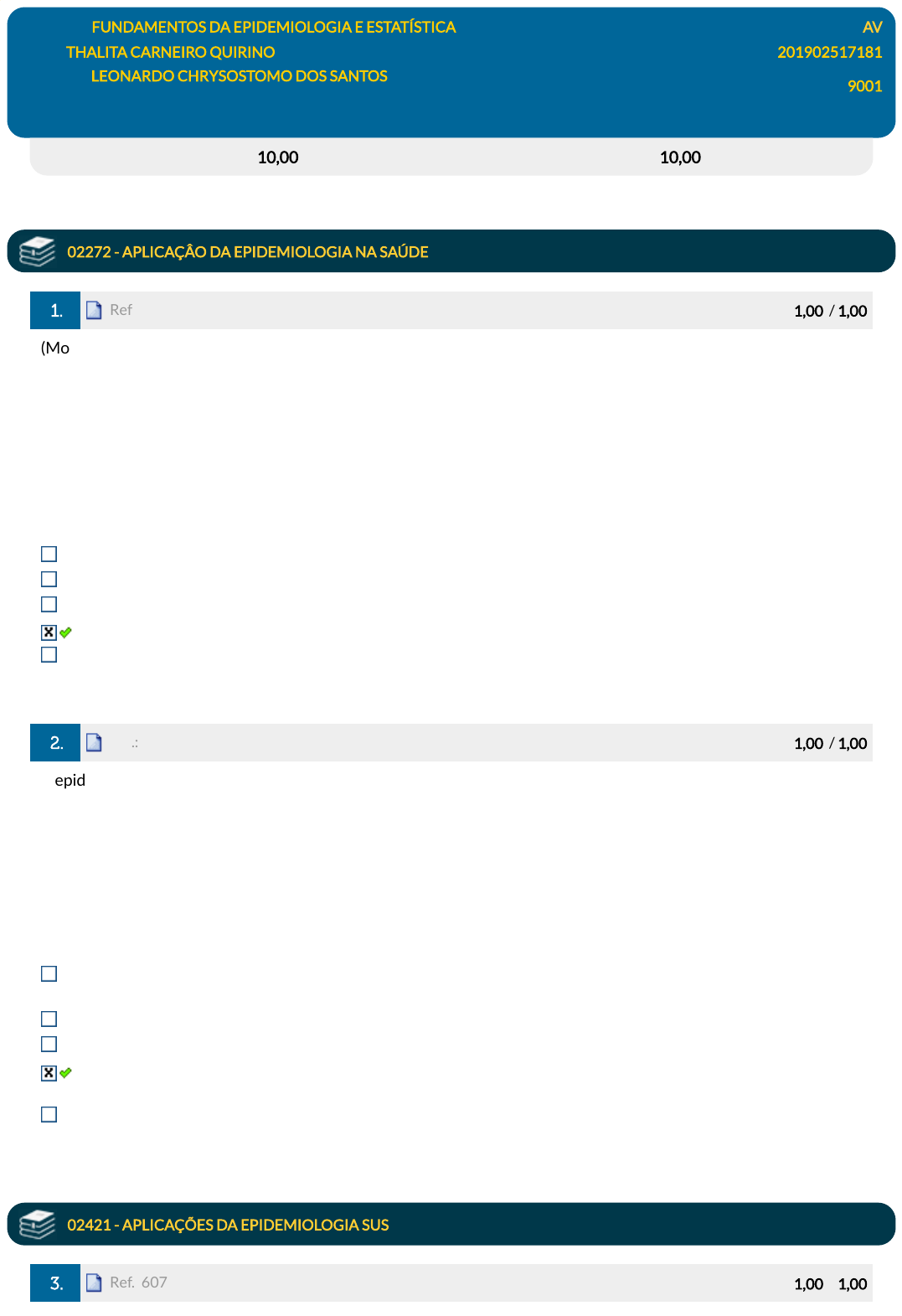 09/06/23, 15:04 EPS https://simulado.estacio.br/alunos/ 1/5 Disciplina: FUNDAMENTOS DA EPIDEMIOLOGIA E ESTATÍSTICA AV Aluno: THALITA CARNEIRO QUIRINO 201902517181 Professor: LEONARDO CHRYSOSTOMO DOS SANTOS Turma: 9001 ARA0005_AV_201902517181 (AG) 18/03/2023 07:47:07 (F) Avaliação: 10,00 pts Nota SIA: 10,00 pts 02272 - APLICAÇÂO DA EPIDEMIOLOGIA NA SAÚDE 1. Ref.: 6069966 Pontos: 1,00 / 1,00 (Modi�cada de IBGP - 2018 - Prefeitura de Itabira - MG - Médico - Saúde da Família) A Epidemiologia molecular mede a exposição a substâncias especí�cas e a resposta biológica precoce através: I- Da avaliação da resposta do hospedeiro mediante exposição aos agentes externos e agressores. II- Do uso de marcadores bioquímicos de efeito especí�co para separar categorias de doenças. III- Da magnitude do efeito genético em relação a outras fontes de variação no risco de doença. Estão CORRETAS as a�rmativas: Somente a III. II e III apenas. I e III apenas. I e II apenas. I, II e III. 2. Ref.: 6070166 Pontos: 1,00 / 1,00 A epidemiologia social tem como foco principal o estudo do modo pelo qual a sociedade e os diferentes modos de organização social in�uenciam a saúde e o bem-estar dos indivíduos e dos grupos sociais, possibilitando a incorporação de suas experiências societárias, para a melhor compreensão de como, onde e porque se dão as desigualdades na saúde. Fonte: https://bvsms.saude.gov.br/epidemiologia-social/. Acesso 08/10/2021. A seguir são listadas uma série de a�rmações obre a epidemiologia social. Assinale a alternativa que traz uma a�rmação INCORRETA sobre esse ramo da epidemiologia. Dá ênfase ao estudo da estrutura socioeconômica a �m de explicar o processo saúde-doença de maneira histórica. Tem a epidemiologia como um dos instrumentos de transformação social. Usa conceitos básicos extraídos da sociologia, economia, ciência política e antropologia médica. Acredita que não tem in�uência qual foi curso de vida que o indivíduo teve, somente considera o momento atual no qual está sendo avaliado. Considera as questões de desigualdades sociais e os aspectos de discriminação ou desigualdade �nanceira. 02421 - APLICAÇÕES DA EPIDEMIOLOGIA SUS 3. Ref.: 6075034 Pontos: 1,00 / 1,00 javascript:alert('C%C3%B3digo da quest%C3%A3o: 6069966.'); javascript:alert('C%C3%B3digo da quest%C3%A3o: 6070166.'); javascript:alert('C%C3%B3digo da quest%C3%A3o: 6075034.'); 09/06/23, 15:04 EPS https://simulado.estacio.br/alunos/ 2/5 Conhecendo a história natural da doença e a sua dinâmica conseguimos classi�cá-las, mensurar sua importância e traçar estratégias de prevenção e controle. A capacidade de resposta do sistema de serviços de saúde irá de�nir se o agravo está na sua esfera de controle e se esta ação de controle impactará positivamente sobre a saúde da população. Sobre os níveis de prevenção, avalie as assertivas abaixo: I) O Objetivo da prevenção primária é limitar a incidência da doença pelo controle das causas especí�cas e dos fatores de risco. II) O objetivo da prevenção secundária é reduzir as consequências mais graves da doença por meio do diagnóstico precoce de tratamento. III) O objetivo da prevenção terciária é reduzir a progressão e as complicações de doença já sintomática. IV) O objetivo da prevenção quaternária é prevenir o surgimento e consolidação de padrões de vida, sejam sociais, culturais ou econômicos, que possam aumentar o risco de adoecimento. Quais estão corretas? Apenas I e III. Apenas I. I, II e III. Apenas III e IV. Apenas II. 4. Ref.: 6075032 Pontos: 1,00 / 1,00 Um trabalhador de uma Unidade Básica de Saúde se feriu com material perfurocortante ao manusear a caixa de descarte de resíduos contaminados e foi conduzido ao ambulatório para primeiros socorros. Lá foi atendido, feito o curativo e encaminhado ao Hospital de referência para que fosse realizada a quimiopro�laxia pós-exposição. Sabendo que se trata de um caso de acidente de trabalho com material biológico e que este é um agravo de noti�cação, em qual dos sistemas abaixo esta informação será inserida? SIAB. SINAN. SISVAN. SINASC. SIM. 02422 - INTRODUÇÃO À EPIDEMIOLOGIA 5. Ref.: 7660107 Pontos: 1,00 / 1,00 Uma série estatística corresponde a uma tabela que apresenta a distribuição de um conjunto de dados em função diferentes fatores, tornando possível construir coe�cientes e índices que darão subsídios para interpretar o evento que se deseja investigar. Assim, observe a série estatística mostrada a seguir. ANO ÓBITOS 2015 62.556 2016 66.928 2017 64.364 2018 62.011 2019 64.295 Total de óbitos ocorridos anualmente em Pernambuco, no período de 2015 a 2019. Fonte: MS/SVS/CGIAE - Sistema de Informações sobre Mortalidade - SIM. DATASUS, 2021. Com base nos tipos de séries estatísticas existentes, a apresentada anteriormente pode ser classi�cada como uma: javascript:alert('C%C3%B3digo da quest%C3%A3o: 6075032.'); javascript:alert('C%C3%B3digo da quest%C3%A3o: 7660107.'); 09/06/23, 15:04 EPS https://simulado.estacio.br/alunos/ 3/5 série estatística atemporal. série estatística conjugada. série estatística temporal. série estatística geográ�ca. série estatística especí�ca. 6. Ref.: 6076844 Pontos: 1,00 / 1,00 "É o intervalo de tempo durante o qual o paciente apresenta manifestações inespecí�cas". Essa de�nição se aplica ao período: Patogênico. Pré-patogênico. Prodrômico. De incubação. De transmissibilidade. 02513 - METODOLOGIA EPIDEMIOLÓGICA 7. Ref.: 6075768 Pontos: 1,00 / 1,00 Os estudos epidemiológicos observacionais têm especial relevância no contexto do Sistema Único de Saúde (SUS), fornecendo informações a respeito dos indicadores locais e dos potenciais determinantes do processo saúde- doença para auxiliar no planejamento e avaliação das ações de saúde, bem como na alocação de recursos. São exemplos de e
