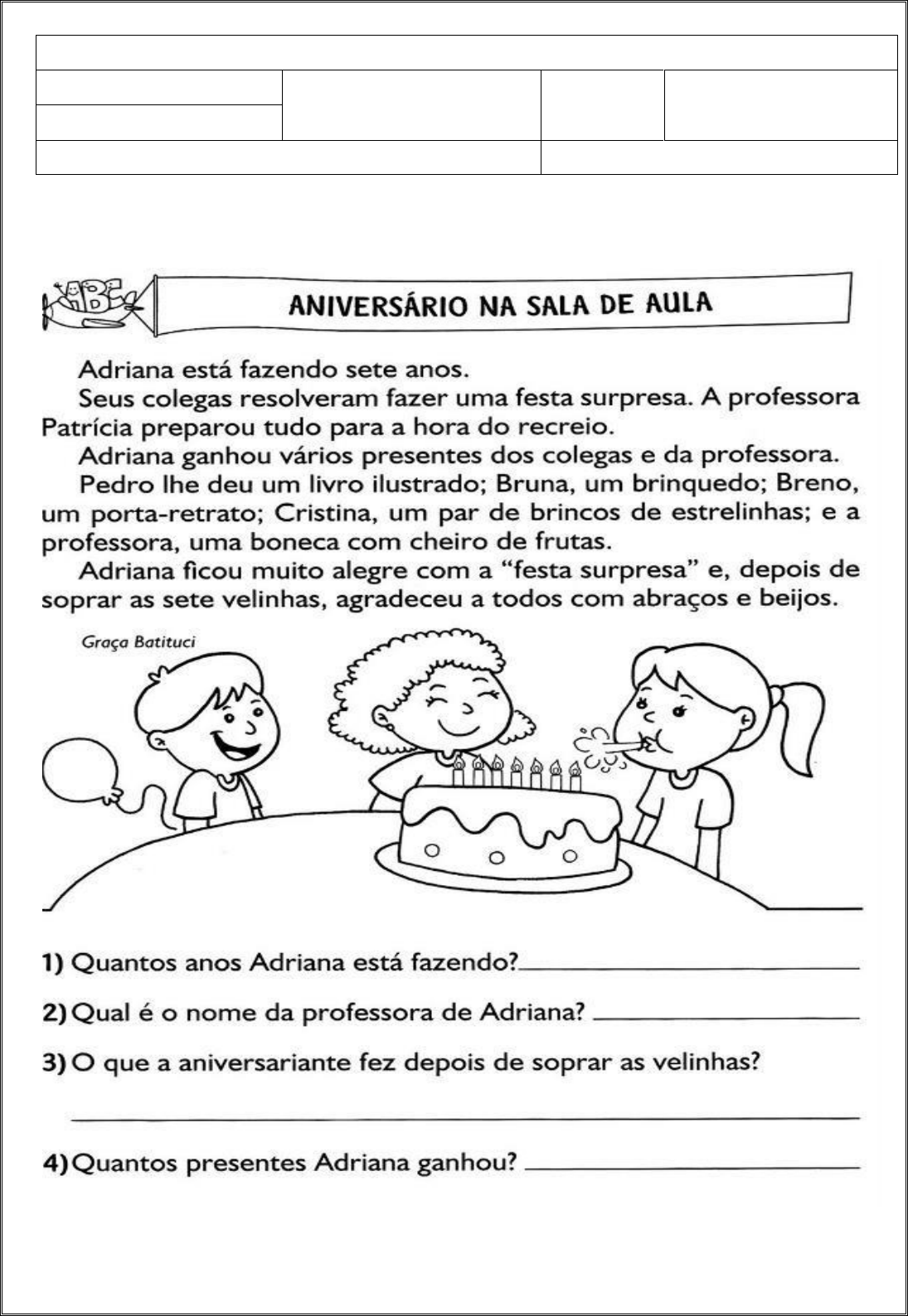 1- Leia o texto várias vezes com bastante atenção, depois copie o texto no seu caderno com letra cursiva bem bonita. 2-Faça um cabeçalho com: nome da escola, professora, data e nome completo. 5)Quantos parágrafos têm o texto?_________________________________________ ESCOLA MUNICIPAL DO BAIRRO PETROVALE SEGMENTO: Atividade remota nº 10 22 À 26 DE JUNHO 3º Ano Data: ____/____/2020 Ensino Fundamental I Professoras: ANA TERESA/PATRÍCIA Disciplina: PORTUGUÊS 6)Qual o título do texto?_________________________________________________ 7)Qual a autora do texto?________________________________________________ 8)Releia: Para que foram utilizadas as vírgulas no trecho em destaque? _____________________________________________________________________ 9)SINAIS DE PONTUAÇÃO Ajudam a organizar as ideias da frase e do texto: ( . )ponto final ( _ )travessão ( ! )ponto de exclamação Ajudam como a frase deve ser falada ou lida e atribuem sentido a ela: ( , )vírgula ( : )dois pontos ( ? )ponto de interrogação Leia os itens que indicam a finalidade dos sinais de pontuação: a)iniciar fala de personagem d)indicar que um personagem vai falar b)expressar surpresa, alegria, etc. e)indicar uma pergunta ou dúvida c)encerrar uma afirmação ou negação Agora complete o quadro com as frases correspondentes: Sinal de pontuação Nome do sinal de pontuação Finalidade do sinal ? Ponto de interrogação e)indica uma pergunta ou dúvida . Ponto final c) : Dois pontos d) ! Ponto de exclamação b) __ Travessão a) 10) A piada a seguir está sem pontuação nas frases. Pontue e reescreva a piada em seu caderno colocando a pontuação, pois senão ela poderá perder a graça! Adriana ficou muito alegre com a “festa surpresa” e, depois de soprar as sete velinhas, agradeceu a todos com abraços e beijos. A vírgula pode ser empregada para separar elementos de uma enumeração. O rapaz liga para a companhia aérea A senhora pode me informar quanto tempo leva a viagem de Salvador ao Rio de Janeiro Só um minutinho Obrigado e desliga Responda as questões: 1- Qual a diferença entre o cubo e a pirâmide? (CONTE OS LADOS E RESPONDA) __________________________________________________________________ 2- Encontre em sua casa um objeto que tenha a forma de um cilindro. Faça um desenho em seu caderno. __________________________________________________________________ 3- Qual a diferença entre um cubo e um quadrado? __________________________________________________________________ 4- Você se lembra de um objeto com formato de um cubo? Desenhe em seu caderno. 5- Faça um desenho e escreva o nome do sólido geométrico que lembram: nome desenho Sólido geométrico laranja Sorvete Lanterna 6- Desenhe sua casa observando que ela possa ter alguns desses sólidos geométricos. 7- Acesse o link https://youtu.be/TeCKbjD9044 (Figuras planas, linhas e sólidos geométricos), assista o vídeo e descubra mais sobre os sólidos geométricos. ESCOLA MUNICIPAL DO BAIRRO PETROVALE SEGMENTO: Atividade remota nº 10 22/06 À 26/06 3º Ano Data: ____/____/2020 Ensino Fundamental I Professoras: ANA TERESA/PATRÍCIA Disciplina: MATEMÁTICA/ARTE CONTINUE BRILHANDO VOCÊ É 10! ARME E EFETUE EM SEU CADERNO: 234 + 345 = 345 + 542 = 123 + 123 = 940 + 324 = 234 + 234 = 324 + 432 = 333 + 213 = 433 + 901 = ESCREVA POR EXTENSO O RESULTADO DAS OPERAÇÕES EM SEU CADERNO. ARTE CONSTRUA OS SÓLIDOS GEOMÉTRICOS ESTUDADOS DE SUA PREFERÊNCIA. ESCOLA MUNICIPAL DO BAIRRO PETROVALE SEGMENTO: Atividade remota nº 10 22/06 à 26/06/2020 3º Ano Data: ____/____/2020 Ensino Fundamental I Professoras: ANA TERESA/ PATRÍCIA Disciplina: ENSINO RELIGIOSO TODAS AS DÚVIDAS SOBRE AS ATIVIDADES PODEM SER ENVIADAS PELO WHATSAPP :991269804. ESCOLA MUNICIPAL DO BAIRRO PETROVALE SEGMENTO: ENSINO FUNDAMENTAL I ATIVIDADE REMOTA Nº 10 3° ANO DATA: ___/___/2020 PROFESSORA: ANA TEREZINHA DISCIPLINA: HISTÓRIA / GEOGRAFIA ATIVIDADES DO DIA 22 À 26 DE JUNHO DE 2020 No seu caderno faça o cabeçalho; Nome da cidade, dia da semana, data do mês. Nome da escola. Seu nome completo Nome da professora. Disciplina: HISTÓRIA LEIA O TEXTO COM BASTANTE ATENÇÃO. FESTA JUNINA A FESTA JUNINA É UMA TRADICIONAL FESTIVIDADE POPULAR NO BRASIL QUE ACONTECE TODO MÊS DE JUNHO E FOI TRAZIDA PARA NOSSO PAÍS PELOS PORTUGUESES DURANTE A COLONIZAÇÃO. A FESTA JUNINA É UMA TRADICIONAL FESTIVIDADE POPULAR QUE ACONTECE DURANTE O MÊS DE JUNHO. ESSA COMEMORAÇÃO É COMUM EM TODAS AS REGIÕES DO BRASIL, ESPECIALMENTE NO NORDESTE, E FOI TRAZIDA PARA O BRASIL POR INFLUÊNCIA DOS PORTUGUESES NO SÉCULO XVI. INICIALMENTE, A FESTA POSSUÍA UMA CONOTAÇÃO ESTRITAMENTE RELIGIOSA E ERA REALIZADA EM HOMENAGEM A SANTOS COMO SÃO JOÃO E SANTO ANTÔNIO. ORIGEM DAS FESTAS JUNINAS OS HISTORIADORES APONTAM QUE AS ORIGENS DA FESTA JUNINA ESTÃO DIRETAMENTE RELACIONADAS A FESTIVIDADES PAGÃS REALIZADAS NA EUROPA NA PASSAGEM DA PRIMAVERA PARA O VERÃO, MOMENTO CHAMADO DE SOLSTÍCIO DE VERÃO. ESSAS FESTAS ERAM REALIZADAS COMO FORMA DE AFASTAR OS MAUS ESPÍRITOS E QUALQUER PRAGA QUE PUDESSE ATINGIR A COLHEITA. PARA MELHOR ENTENDERMOS ISSO, É PRECISO CONSIDERAR QUE O SOLSTÍCIO DE VERÃO NO HEMISFÉRIO NORTE ACONTECE EXATAMENTE NO MÊS DE JUNHO. AS COMEMORAÇÕES REALIZADAS POR DIFERENTES POVOS PAGÃOS EUROPEUS COMEÇARAM A SER CRISTIANIZADAS A PARTIR DO MOMENTO EM QUE O CRISTIANISMO SE CONSOLIDOU COMO A PRINCIPAL REGIÃO DO CONTINENTE EUROPEU. ASSIM, A FESTA ORIGINALMENTE PAGÃ FOI INCORPORADA AO CALENDÁRIO FESTIVO DO CATOLICISMO. ESSA FOI UMA PRÁTICA COMUM DA IGREJA CATÓLICA. PARA FACILITAR A CONVERSÃO DOS DIFERENTES POVOS PAGÃOS, FAZIA-SE UMA ACULTURAÇÃO DAS FESTIVIDADES, ADICIONANDO-AS AO CALENDÁRIO TODAS AS DÚVIDAS SOBRE AS ATIVIDADES PODEM SER ENVIADAS PELO WHATSAPP :991269804. CATÓLICO E ACRESCENTANDO NELAS ELEMENTOS CRISTÃOS. OUTRA FESTA NA QUAL ESSA PRÁTICA SE REPETIU, POR EXEMPLO, FOI A COMEMORAÇÃO DO NATAL, QUE ACONTECE TODO MÊS DE DEZEMBRO. A CRISTIANIZAÇÃO DA FEST