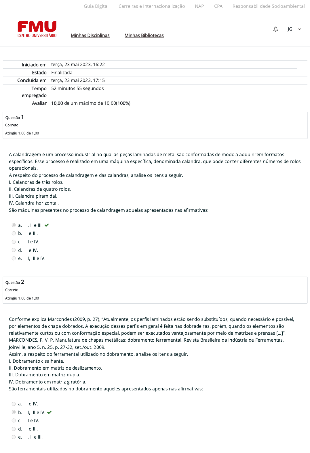 10/06/2023, 13:36 Atividade 4 (A4): Revisão da tentativa https://ambienteacademico.com.br/mod/quiz/review.php?attempt=2286228&cmid=792381 1/5 Iniciado em terça, 23 mai 2023, 16:22 Estado Finalizada Concluída em terça, 23 mai 2023, 17:15 Tempo empregado 52 minutos 55 segundos Avaliar 10,00 de um máximo de 10,00(100%) Questão 1 Correto Atingiu 1,00 de 1,00 Questão 2 Correto Atingiu 1,00 de 1,00 A calandragem é um processo industrial no qual as peças laminadas de metal são conformadas de modo a adquirirem formatos especí�cos. Esse processo é realizado em uma máquina especí�ca, denominada calandra, que pode conter diferentes números de rolos operacionais. A respeito do processo de calandragem e das calandras, analise os itens a seguir. I. Calandras de três rolos. II. Calandras de quatro rolos. III. Calandra piramidal. IV. Calandra horizontal. São máquinas presentes no processo de calandragem aquelas apresentadas nas a�rmativas: a. I, II e III. b. I e III. c. II e IV. d. I e IV. e. II, III e IV. Conforme explica Marcondes (2009, p. 27), “Atualmente, os per�s laminados estão sendo substituídos, quando necessário e possível, por elementos de chapa dobrados. A execução desses per�s em geral é feita nas dobradeiras, porém, quando os elementos são relativamente curtos ou com conformação especial, podem ser executados vantajosamente por meio de matrizes e prensas [...]”. MARCONDES, P. V. P. Manufatura de chapas metálicas: dobramento ferramental. Revista Brasileira da Indústria de Ferramentas, Joinville, ano 5, n. 25, p. 27-32, set./out. 2009. Assim, a respeito do ferramental utilizado no dobramento, analise os itens a seguir. I. Dobramento cisalhante. II. Dobramento em matriz de deslizamento. III. Dobramento em matriz dupla. IV. Dobramento em matriz giratória. São ferramentais utilizados no dobramento aqueles apresentados apenas nas a�rmativas: a. I e IV. b. II, III e IV. c. II e IV. d. I e III. e. I, II e III. Guia Digital Carreiras e Internacionalização NAP CPA Responsabilidade Socioambiental Minhas Disciplinas Minhas Bibliotecas JG https://codely-fmu-content.s3.amazonaws.com/Moodle/GuiaDigital/Guia+digital/index.html https://carreiras.fmu.br/ https://codely-fmu-content.s3.amazonaws.com/Moodle/NAP/inicial/nap/fmu/index.html https://codely-fmu-content.s3.amazonaws.com/Moodle/CPA/landing_CPA/index.html https://portal.fmu.br/sustentabilidade https://ambienteacademico.com.br/ https://ambienteacademico.com.br/ https://ambienteacademico.com.br/course/view.php?id=236 10/06/2023, 13:36 Atividade 4 (A4): Revisão da tentativa https://ambienteacademico.com.br/mod/quiz/review.php?attempt=2286228&cmid=792381 2/5 Questão 3 Correto Atingiu 1,00 de 1,00 Questão 4 Correto Atingiu 1,00 de 1,00 Segundo González (2000), o dobramento a frio possibilita um melhor acabamento super�cial para os produtos, bem como um aumento da produtividade de peças, uma menor variação dimensional e a condição de encruamento do material, tudo isso sem a necessidade de equipamentos de aquecimento. GONZÁLEZ, P. C. S. Técnicas não convencionais para dobramento de tubos de parede �na usando elastômero. 2000. Tese (Doutorado em Engenharia Mecânica) – Instituto Tecnológico de Aeronáutica, São José dos Campos, 2000. A partir do apresentado, analise as asserções a seguir e a relação proposta entre elas. I. No processo a frio, o material é conformado a temperaturas abaixo da faixa responsável pela sua recristalização. PORQUE II. O dobramento a frio necessita de mais energia e, consequentemente, requer equipamentos com maior potência. Agora, assinale a alternativa que apresenta a resposta correta. a. As asserções I e II são proposições falsas. b. As asserções I e II são proposições verdadeiras, e a II é uma justi�cativa correta da I. c. A asserção I é uma proposição verdadeira, e a asserção II é uma proposição falsa. d. A asserção I é uma proposição falsa, e a II é uma proposição verdadeira. e. As asserções I e II são proposições verdadeiras, mas a II não é uma justi�cativa correta da I. Conforme explica Rocha (2012), a operação de corte por estampagem é efetivada no momento em que a ferramenta cortante atinge a matriz, ocasionando, com isso, uma conversão de esforços de compressão, realizados por uma prensa, para esforços de cisalhamento, o que gera o corte. ROCHA, O. F. L. Conformação mecânica. Belém: IFPA; Santa Maria: UFSM, 2012. Diante desse contexto, a respeito do processo de corte por estampagem e de seus diferentes tipos, analise as a�rmativas a seguir e assinale V para a(s) verdadeira(s) e F para a(s) falsa(s). I. ( ) O corte simples é estabelecido no momento em que uma porção de um metal, com um formato prede�nido, é separada da chapa principal. II. ( ) O processo de puncionamento é efetivado quando são realizados furos de pequenas dimensões nas chapas metálicas. III. ( ) O processo de corte parcial possibilita um corte na chapa metálica sem que haja sua separação completa da chapa principal. IV. ( ) O processo de recorte está atrelado ao estabelecimento de uma geometria inicial nos mesmos moldes do corte simples. Agora, assinale a alternativa que apresenta a sequência correta. a. F, V, V, V. b. V, V, F, F. c. F, F, V, V. d. V, V, V, F. e. V, F, F, V. Guia Digital Carreiras e Internacionalização NAP CPA Responsabilidade Socioambiental Minhas Disciplinas Minhas Bibliotecas JG https://codely-fmu-content.s3.amazonaws.com/Moodle/GuiaDigital/Guia+digital/index.html https://carreiras.fmu.br/ https://codely-fmu-content.s3.amazonaws.com/Moodle/NAP/inicial/nap/fmu/index.html https://codely-fmu-content.s3.amazonaws.com/Moodle/CPA/landing_CPA/index.html https://portal.fmu.br/sustentabilidade https://ambienteacademico.com.br/ https://ambienteacademico.com.br/ https://ambienteacademico.com.br/course/view.php?id=236 10/06/2023, 13:36 Atividade 4 (A4): Revisão da tentativa https://ambienteacademico.