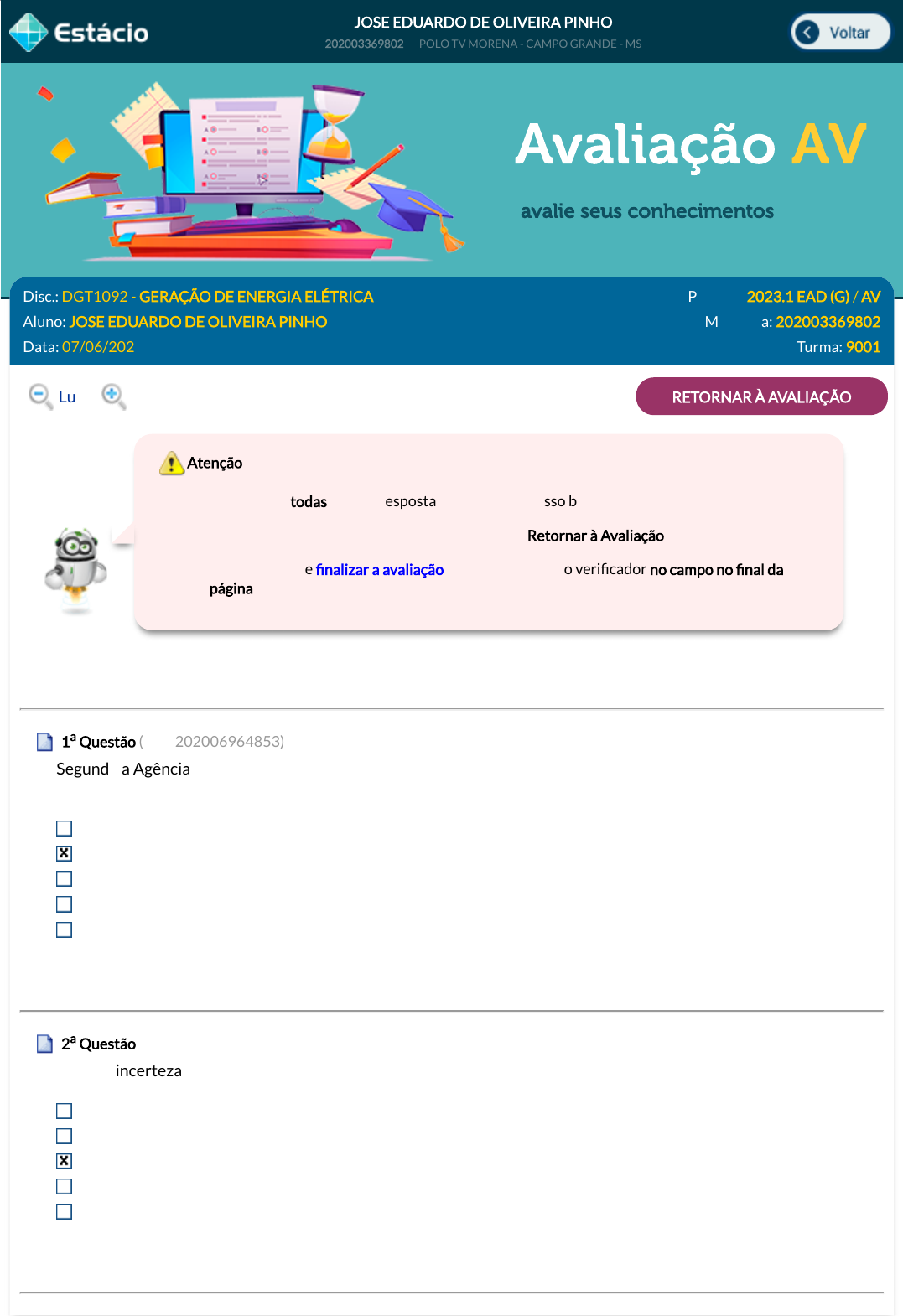 07/06/2023, 02:07 EPS https://simulado.estacio.br/alunos/ 1/4 JOSE EDUARDO DE OLIVEIRA PINHO Avaliação AV 202003369802 POLO TV MORENA - CAMPO GRANDE - MS avalie seus conhecimentos Disc.: DGT1092 - GERAÇÃO DE ENERGIA ELÉTRICA Período: 2023.1 EAD (G) / AV Aluno: JOSE EDUARDO DE OLIVEIRA PINHO Matrícula: 202003369802 Data: 07/06/2023 02:07:25 Turma: 9001 Lupa RETORNAR À AVALIAÇÃO 1a Questão (Ref.: 202006964853) Segundo a Agência Internacional de Energia (International Energy Agency - IEA), a maior fonte de energia utilizada no mundo é: Nuclear. Fóssil / termal. Renovável não hídrica. Hídrica. Solar. 2a Questão (Ref.: 202006687500) A maior incerteza com relação às hidrelétricas é (são): Os impactos ambientais A potência que pode ser instalada A vazão futura Quebras de peças dos geradores e turbinas Paradas de emergência da usina Atenção 1. Veja abaixo, todas as suas respostas gravadas no nosso banco de dados. 2. Caso você queira voltar à prova clique no botão "Retornar à Avaliação". 3. Não esqueça de �nalizar a avaliação colocando o código veri�cador no campo no �nal da página. javascript:voltar_avaliacoes() javascript:diminui(); javascript:aumenta(); javascript:alert('C%C3%B3digo da quest%C3%A3o: 3558071\n\nStatus da quest%C3%A3o: Liberada para Uso.'); javascript:alert('C%C3%B3digo da quest%C3%A3o: 3280718\n\nStatus da quest%C3%A3o: Liberada para Uso.'); javascript:ir_finalizar(); 07/06/2023, 02:07 EPS https://simulado.estacio.br/alunos/ 2/4 3a Questão (Ref.: 202006687522) As caldeiras que possuem limitada capacidade de produção de vapor e que produzem somente vapor saturado é: Flamotubular Aquatubular Verticais Mistas Horizontais 4a Questão (Ref.: 202006687536) Assinale a alternativa correta. O uso dos combustíveis fósseis na matriz elétrica brasileira tem aumentado, com o objetivo de: Inserir mais variedade na matriz elétrica seguindo tendências internacionais Adicionar uma modalidade de geração com custo de megawatt gerado mais barato Aumentar a oferta de emprego nesta área Trazer para o país novos investidores com experiência em geração térmica Aumentar a segurança e con�abilidade do sistema elétrico 5a Questão (Ref.: 202006687552) Assinale a alternativa que apresenta uma vantagem do uso da biomassa na geração de energia Possui muitas reservas mundiais Seu uso não requer preparos complexos Possui custo de produção muito inferior a outras formas de geração O Brasil possui reservas expressivas de biomassa Possui e�ciência e poder calorífero maior que outras fontes de energia 6a Questão (Ref.: 202006687571) As reservas de carvão mineral brasileira se encontram, na maioria em qual estado? Paraná Mato Grosso do Sul São Paulo Santa Catarina Rio Grande do Sul 7a Questão (Ref.: 202006687605) Quanto aos impactos ambientais, os rejeitos de urânio das usinas brasileiras atualmente destinados para : Fornos para que sejam queimados Piscinas, para seu resfriamento Reconversão em outros sub produtos que não são radioativos javascript:alert('C%C3%B3digo da quest%C3%A3o: 3280740\n\nStatus da quest%C3%A3o: Liberada para Uso.'); javascript:alert('C%C3%B3digo da quest%C3%A3o: 3280754\n\nStatus da quest%C3%A3o: Liberada para Uso.'); javascript:alert('C%C3%B3digo da quest%C3%A3o: 3280770\n\nStatus da quest%C3%A3o: Liberada para Uso.'); javascript:alert('C%C3%B3digo da quest%C3%A3o: 3280789\n\nStatus da quest%C3%A3o: Liberada para Uso.'); javascript:alert('C%C3%B3digo da quest%C3%A3o: 3280823\n\nStatus da quest%C3%A3o: Liberada para Uso.'); 07/06/2023, 02:07 EPS https://simulado.estacio.br/alunos/ 3/4 Bombonas metálicas para seu desgaste natural Aterros especí�cos para que se desgastem naturalmente 8a Questão (Ref.: 202006687607) Quantos anos são necessários estudar o comportamento do tempo para entender o clima de um local? 15 anos 25 anos 30 anos 10 anos 20 anos 9a Questão (Ref.: 202006687748) Qual das opções abaixo não é uma vantagem do controle de passo do aerogerador? Massa das pás do rotor maiores, proporcionando mais estabilidade ao aerogerador Partida simples do rotor pela mudança do passo Dispensa o uso de grandes freios para paradas de emergência, feitas pela mudança do passo (freio aerodinâmico) Podem alcançar a potência nominal mesmo sob condições de baixa massa especí�ca do ar, como em grandes altitudes e altas temperaturas Permitem controle da potência ativa sob todas as condições de vento 10a Questão (Ref.: 202006687752) Complete as lacunas: ¿Na geração distribuída os limites de�nidos para a potência gerada é de até _______ para a micro geração distribuída e de __________ para a mini geração distribuída¿ A opção que completa corretamente as lacunas é 75kW e 75 à 5MW 65kW e 65 à 3MW 60kW e 60 à 6MW 50kW e 50kW à 2MW 45kW e 45 à 4MW Autenticação para a Prova Online Caso queira FINALIZAR a avaliação, digite o código de 4 carateres impresso abaixo. ATENÇÃO: Caso �nalize esta avaliação você não poderá mais modi�car as suas respostas. QJ22 Cód.: FINALIZAR Obs.: Os caracteres da imagem ajudam a Instituição a evitar fraudes, que di�cultam a gravação das javascript:alert('C%C3%B3digo da quest%C3%A3o: 3280825\n\nStatus da quest%C3%A3o: Liberada para Uso.'); javascript:alert('C%C3%B3digo da quest%C3%A3o: 3280966\n\nStatus da quest%C3%A3o: Liberada para Uso.'); javascript:alert('C%C3%B3digo da quest%C3%A3o: 3280970\n\nStatus da quest%C3%A3o: Liberada para Uso.'); 07/06/2023, 02:07 EPS https://simulado.estacio.br/alunos/ 4/4 respostas. Período de não visualização da avaliação: desde 14/03/2023 até 09/06/2023.