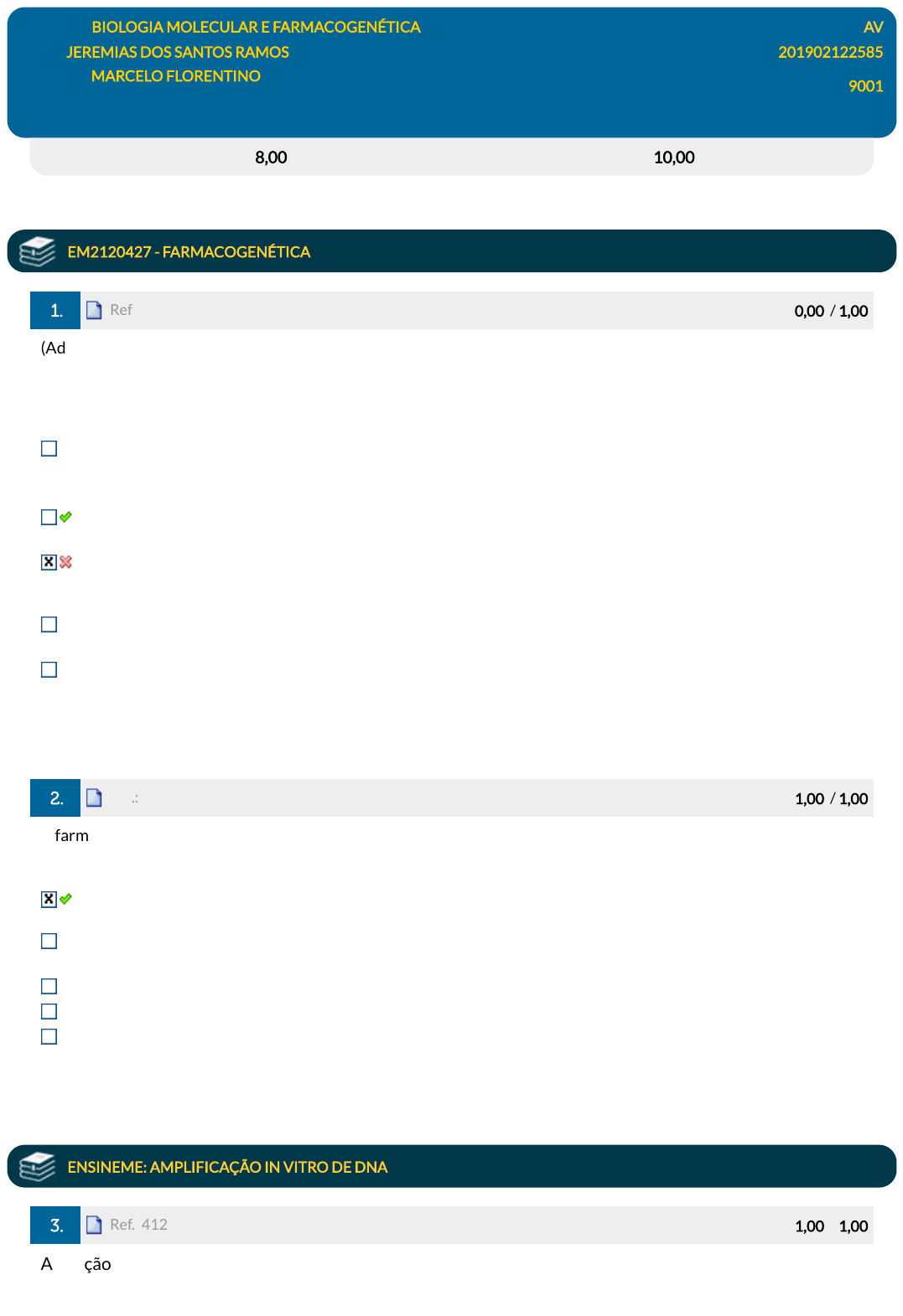 10/06/2023, 18:03 EPS https://simulado.estacio.br/alunos/ 1/4 Disciplina: BIOLOGIA MOLECULAR E FARMACOGENÉTICA AV Aluno: JEREMIAS DOS SANTOS RAMOS 201902122585 Professor: MARCELO FLORENTINO Turma: 9001 SDE4451_AV_201902122585 (AG) 13/04/2023 17:42:37 (F) Avaliação: 8,00 pts Nota SIA: 10,00 pts EM2120427 - FARMACOGENÉTICA 1. Ref.: 5417488 Pontos: 0,00 / 1,00 (Adaptada de Prefeitura Municipal de Salgadinho -PE, 2009 - Farmacêutico) Os processos metabólicos, visam transformar um fármaco em um intermediário com menor atividade biológica. Dentre os diversos sistemas enzimáticos responsáveis pelo processo de metabolismo, destaca-se o citocromo P450. Sobre este citocromo e metabolização dos fármacos, assinale a alternativa correta: As enzimas do citocromo P450 são pertencentes a uma seleta família de cromoproteínas amplamente distribuídas em todos os seres vivos e estão envolvidas no metabolismo de uma variedade de compostos quimicamente diferentes. A alteração das respostas farmacológicas, condicionadas por formas enzimáticas polimór�cas, produzirá fenótipos farmacogenéticos variantes, relativos aos efeitos de sub-dose ou toxicidade ao uso de fármacos. A farmacogenômica é de�nida como a variabilidade de resposta às drogas devido a características individuais herdadas, ou seja, estuda as variabilidades nas respostas das drogas, atribuídas a fatores hereditários nas diferentes populações. A farmacogenética é de�nida, através da análise do genoma (DNA) e seus produtos (RNA e proteínas), como a possível relação com a resposta aos medicamentos. A farmacogenética, juntamente com a genômica, promete uma farmacoterapia individualizada, pelo estudo genotípico de cada indivíduo, adaptando o genoma à resposta segura ao medicamento diminuindo a probabilidade de eventos adversos. 2. Ref.: 5417440 Pontos: 1,00 / 1,00 A farmacogenética se aplica a estudar a relação entre genes e fármacos, sendo possível apenas com os avanços tecno-cientí�cos do século passado. Sobre a farmacogenética, é correto a�rmar que: A humanidade possui pouca variação genética; apesar disso, a farmacogenética estuda como essas variações in�uenciam as respostas farmacológicas. A humanidade possui muito pouca variação genética e, por isso, a farmacogenética se propõe a estudar como podemos melhorar o nosso genoma. Efeitos adversos não estão relacionados à variação genética silenciosa das populações humanas. Efeitos adversos podem surgir relacionados à farmacogenética da síntese in vitro dos medicamentos. As poucas variações genéticas vistas em humanos causam doenças graves e, por isso, a farmacogenética se propõe a estudar como podemos melhorar o nosso genoma. ENSINEME: AMPLIFICAÇÃO IN VITRO DE DNA 3. Ref.: 4125263 Pontos: 1,00 / 1,00 A reação em cadeia da polimerase (PCR) tem sido usada frequentemente para a ampli�cação de ácidos nucleicos desde a década de 1980. Desde então, diversas variações da PCR foram feitas para melhorar sua javascript:alert('C%C3%B3digo da quest%C3%A3o: 5417488.'); javascript:alert('C%C3%B3digo da quest%C3%A3o: 5417440.'); javascript:alert('C%C3%B3digo da quest%C3%A3o: 4125263.'); 10/06/2023, 18:03 EPS https://simulado.estacio.br/alunos/ 2/4 capacidade de detecção e quanti�cação de DNA. Com relação à técnica de PCR em tempo real, assinale a alternativa correta: Depende do uso de �uorescência, que é medida ao �nal da reação, tal como o produto de PCR comum é corrido em gel de agarose, geralmente visualizado em luz UV. Tem como parâmetro importante o Ct (cycle threshold), que indica o ciclo da reação no qual a ampli�cação começa a ser detectada a níveis superiores ao ruído (background) e passa a acontecer de forma exponencial. Requer a otimização de um importante parâmetro que é a temperatura de desnaturação. Não permite, por meio do uso do Sybergreen®, veri�car a curva de dissociação, mesmo em termocicladores modernos. Não pode ser aplicada na detecção de mutações, apesar de sua alta sensibilidade. 4. Ref.: 4119323 Pontos: 1,00 / 1,00 Sobre o tema Biologia Molecular, analise as a�rmativas a seguir: 1. A síntese do DNA é semiconservativa, ou seja, ela conserva metade da �ta mãe incorporada na �ta �lha de DNA, a replicação precisa que desoxirribonucleotídeos livres sejam posicionados sobre uma cadeia polinucleotídica molde, e estejam unidos entre si, formando uma nova cadeia complementar à cadeia mãe que serve como molde. A enzima que atua nesse processo é a polimerase. 2. As polimerases do DNA atuam adicionando um nucleotídeo por vez na extremidade 3¿OH livre de uma cadeia polinucleotídica em formação, que se encontre emparelhada com a cadeia molde. Por isso dizemos que a síntese de DNA ocorre no sentido 5 3. 3. No processo de transcrição, toda a informação genética contida no DNA é transcrita para uma molécula de RNA mensageiro, que, no citoplasma, norteará o processo de tradução. 4. A técnica de PCR consiste em ampli�car todo o DNA de um ser vivo, usando uma DNA polimerase que atua em altas temperaturas e é chamada de Taq polimerase, encontrada em procariotos do tipo arquea. Assinale a alternativa que indica todas as a�rmativas corretas. É correta apenas a a�rmativa 3. São corretas apenas as a�rmativas 1, 2 e 3. São corretas as a�rmativas 1, 2, 3 e 4. É correta apenas a a�rmativa 1. São corretas apenas as a�rmativas 1, 3 e 4. ENSINEME: INTRODUÇÃO À BIOLOGIA MOLECULAR 5. Ref.: 7694677 Pontos: 0,00 / 1,00 "Uma dica para quem quer entender com mais facilidade o vocabulário da ciência moderna: aprenda as preposições do grego antigo. É sério. Essas palavrinhas da língua de Homero ajudam demais da conta na hora de acompanhar o que os cientistas estão querendo dizer. Considere a preposição helênica epi, por exemplo. Ela corresponde mais ou menos ao nosso "sobre" (no sentido de "em cima", "por ci