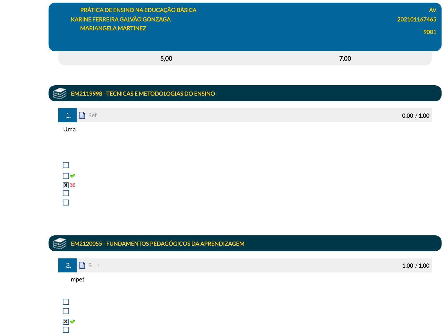 10/06/2023, 20:06 EPS https://simulado.estacio.br/alunos/ 1/5 Disciplina: PRÁTICA DE ENSINO NA EDUCAÇÃO BÁSICA AV Aluno: KARINE FERREIRA GALVÃO GONZAGA 202101167465 Professor: MARIANGELA MARTINEZ Turma: 9001 DGT0745_AV_202101167465 (AG) 20/03/2023 19:56:50 (F) Avaliação: 5,00 pts Nota SIA: 7,00 pts EM2119998 - TÉCNICAS E METODOLOGIAS DO ENSINO 1. Ref.: 5428209 Pontos: 0,00 / 1,00 Uma mesma compreensão da prática educativa e uma mesma metodologia de trabalho não operam necessariamente de forma idêntica em contextos diferentes. Dessa maneira, as experiências: Determinam os assuntos que devem ser ensinados pelo educador. Não devem ser improvisadas, mas planejadas e readaptadas. Indicam o processo de construção do conhecimento a ser seguido. Não podem ser transplantadas, mas reinventadas. Precisam considerar a capacidade de atuação de cada usuário. EM2120055 - FUNDAMENTOS PEDAGÓGICOS DA APRENDIZAGEM 2. Ref.: 5419866 Pontos: 1,00 / 1,00 Competências fazem parte de um conjunto denominado CHA, composto por conhecimentos, habilidades e atitudes. Assinale a alternativa em que está expresso um exemplo de atitude. Agilidade no uso de dispositivos eletrônicos. Capacidade de dirigir veículos. Ética na vida pessoal e pro�ssional. Domínio das operações matemáticas. javascript:alert('C%C3%B3digo da quest%C3%A3o: 5428209.'); javascript:alert('C%C3%B3digo da quest%C3%A3o: 5419866.'); 10/06/2023, 20:06 EPS https://simulado.estacio.br/alunos/ 2/5 Fluência em vários idiomas. 3. Ref.: 5419863 Pontos: 1,00 / 1,00 Leia com atenção o conceito de aprendizagem formulado por Hilgard. "Aprendizagem é o processo pelo qual uma atividade tem origem ou é modi�cada pela reação a uma situação encontrada, desde que as características da mudança de atividade não possam ser explicadas por tendências inatas de respostas, maturação ou estados temporários do organismo (por exemplo, fadiga, drogas etc.)". (HILGARD, 1966, p. 3). De acordo com o conceito que você leu, assinale, dentre as alternativas apresentadas a seguir, a que representa uma aprendizagem. A sequência motora que leva o bebê a sentar. A sonolência, após uma noite passada em claro. O estado de euforia ao utilizar uma droga. Espirrar, quando um mosquito entra no nariz. A aquisição de uma língua estrangeira. EM2120098 - ESTÁGIO SUPERVISIONADO EM EDUCAÇÃO 4. Ref.: 5425114 Pontos: 1,00 / 1,00 Cuidar e educar são dimensões indissociáveis na Educação Infantil. Assim, no estágio supervisionado em creches e pré-escolas, compete ao estagiário _____. A alternativa correta que completa o enunciado acima é: Apenas trabalhar nos processos de higienização e alimentação das crianças, pois as outras esferas pertencem ao professor titular. Manter as crianças sempre limpas, não permitindo contato com areia e/ou água sem uma capa apropriada; assim elas se educam. Ler ou recitar poesia enquanto troca as fraldas, pois, assim, as crianças desenvolvem a mente. Apenas trabalhar na esfera da cognição, considerando que os processos de higiene e alimentação são funções dos auxiliares. Envolver-se em todos os processos que envolvam as crianças, pois todos eles têm caráter pedagógico. javascript:alert('C%C3%B3digo da quest%C3%A3o: 5419863.'); javascript:alert('C%C3%B3digo da quest%C3%A3o: 5425114.'); 10/06/2023, 20:06 EPS https://simulado.estacio.br/alunos/ 3/5 5. Ref.: 5425113 Pontos: 1,00 / 1,00 É correto a�rmar que o trabalho do estagiário ao lidar com crianças e jovens deve ter como princípio: A elaboração dos conceitos cientí�cos. O desenvolvimento exclusivo da cognição. A sistematização da leitura e da escrita. As abordagens pedagógicas e�cientes, percebendo se papel. Os códigos de conduta moral. 02964 - ANÁLISE DE MATERIAL DIDÁTICO E FATORES AUXILIARES 6. Ref.: 6046599 Pontos: 0,00 / 1,00 (Colégio Pedro II - 2019 - adaptada) Marque a alternativa que não apresenta uma justi�cativa para a incorporação do jogo como estratégia de aprendizagem: A estética, a narrativa e o ambiente virtual em que os jogos se desenvolvem são elementos fundamentais na seleção de um jogo no contexto de aprendizagem e, assim, oferecem condições para desenvolver a autonomia e a consciência acerca da realidade. Os jogos promovem a leitura; exigem raciocínio e pensamento lógico na resolução de problemas; permitem o desenvolvimento de habilidades espaciais na exploração dos ambientes, o planejamento estratégico para vencer os obstáculos e vários conhecimentos de áreas especí�cas. Por meio da prática do jogo, os estudantes podem testar hipóteses, re�etir sobre novas maneiras de obter resultados, errar, tentar novamente, reformular e pensar criticamente sobre os resultados obtidos na ação. Logo, a aprendizagem se daria pelo ciclo que envolve re�exão e ação. Ao jogar, a criança está ampliando seu repertório de habilidades e de conhecimento. Por ser um processo dinâmico, conforme aumenta sua complexidade, novas competências e habilidades são exigidas. Os jogos possibilitam a criação de narrativas capazes de provocar no estudante o posicionamento diante de situações sociais complexas, inclusive questionando, por exemplo, a representatividade de �guras femininas nesse universo. 03084 - A OBSERVAÇÃO DO COTIDIANO ESCOLAR javascript:alert('C%C3%B3digo da quest%C3%A3o: 5425113.'); javascript:alert('C%C3%B3digo da quest%C3%A3o: 6046599.'); 10/06/2023, 20:06 EPS https://simulado.estacio.br/alunos/ 4/5 7. Ref.: 6057523 Pontos: 0,00 / 1,00 No relatório de estágio, a parte referente à estrutura e ao funcionamento da escola deve, necessariamente, apresentar as seguintes informações: Aspecto físico, humano e material da escola; projeto político pedagógico; a escola como unidade administrativa; atividades docentes Estilo arquitetônico do prédio da escola; situação administrativa da escola; a escola como grupo social; atividades docentes e discentes Aspecto físi
