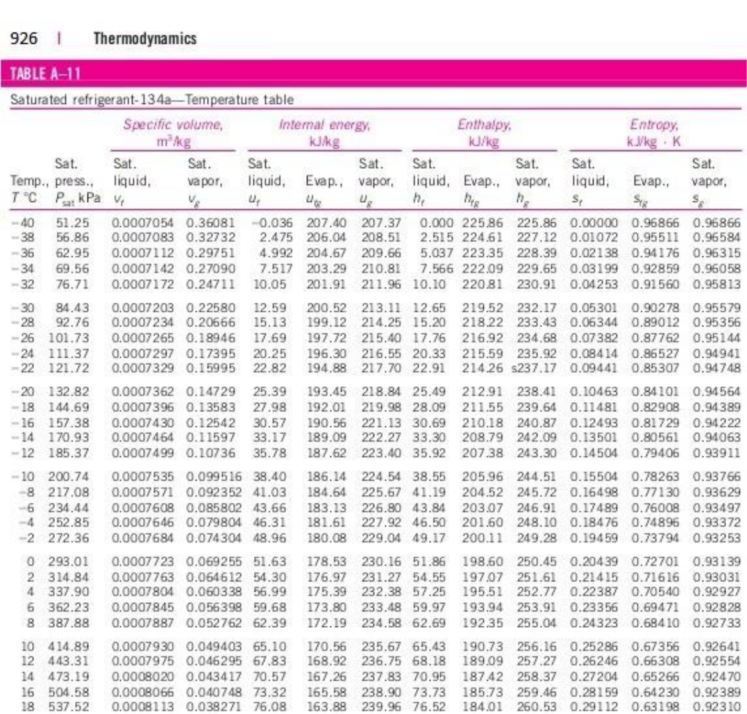 Refrigerante 134a- Líquido-vapor saturados-Tabela com entrada de temperatura Refrigerante 134a- Líquido-vapor saturados-Tabela com entrada de temperatura(conclusão) Refrigerante 134a- Líquido-vapor saturados-Tabela com entrada de pressão Refrigerante 134a - Vapor superaquecido Refrigerante 134a - Vapor superaquecido