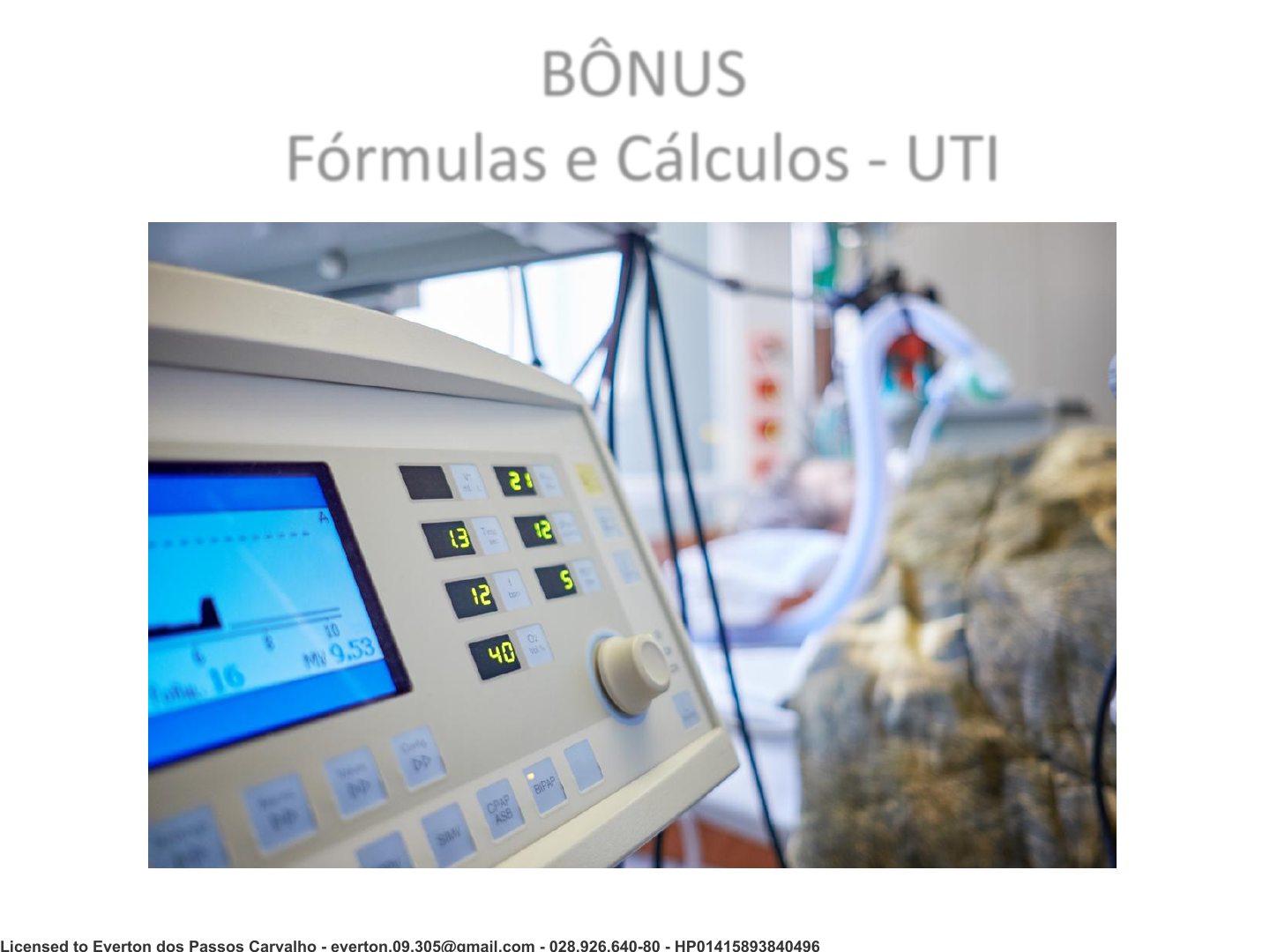 BÔNUS Fórmulas e Cálculos - UTI Licensed to Everton dos Passos Carvalho - everton.09.305@gmail.com - 028.926.640-80 - HP01415893840496 Fórmulas e Cálculos - UTI Gasometria A gasometria arterial fornece informações essenciais sobre a oxigenação do sangue, a ventilação (eliminação do dióxido de carbono) e o equilíbrio ácido base, através dos valores de pH - PCO² - PAO² - HCO³ - BE- SATO² PH = O pH é um índice que representa a concentração de íons hidrogênio (H+) existente em uma solução. PCO² = A PCO² (componente respiratório) representa a pressão parcial de dióxido de carbono dissolvido no plasma sanguíneo. PAO² = A PAO² é a medida da pressão parcial do oxigênio no sangue arterial, refere-se ao oxigênio dissolvido no plasma, não reflete a disponibilidade total de oxigênio para os tecidos. HCO³ = O HCO³ (bicarbonato, componente metabólico) existe em equilíbrio com o ácido carbônico para regular o pH dos liquidos orgânicos. BE (DB) = Avalia excessos ou déficits de bases no sangue acompanham os distúrbios metabólicos. SATO² = A SATO² mede a saturação de oxigênio, ou seja a proporção em que esta ligado a hemoglobina. Indica a disponibilidade total de oxigênio para as células do organismo. Tabela de parâmetros dentro da normalidade PH: 7,35 à 7,45 PCO²: 35 à 45 mmHg HCO³: 22 à 26 mEq/l PO²: 80 à 100 mmHG BE: -2,5 à +2,5 mEq/l SATO²: 90 à 100% Licensed to Everton dos Passos Carvalho - everton.09.305@gmail.com - 028.926.640-80 - HP01415893840496 Constante de Tempo O cálculo da constante de tempo tem por objetivo programar o tempo inspiratório adequado para um paciente com pulmão de SARA. Uma constante de tempo em ventilação mecânica corresponde ao tempo necessário para que a pressão intra- alveolar atinja 63% da pressão medida na porção proximal do tubo endotraqueal. O produto da resistência pela complacência compõe a constante de tempo do sistema respiratório. Assim, em um paciente com Raw de 10cm H²O / L.s e uma Cst de 0,04L/cm H²O, a constante de tempo inspiratório é de 0,4s (10 x 0,04) ou seja, ao aplicarmos uma pressão de 20cm H²O na via área proximal ao tubo, levará 0,4s até que a pressão alveolar atinja 63% desse valor, ou cerca 12cm H²O. Para que a pressão distal atinja 86% da pressão proximal (17cm H²O) serão necessárias duas constantes de tempo ou 0,8s, e para 95% (19cm H²o) serão requeridas três constantes de tempo inspitarórias ou 1,2s. Atingindo - se 5 constantes de tempo (2s) as pressões se tornam virtualmente iguais. Assim variações do ajuste do tempo inspiratório (TI) implicam em variações na pressão alveolar na mesma direção até o limite de 3 a 5 constantes de tempo. A equalização entre as pressões proximal e distal resulta em desaceleração do fluxo até zero. Os valores em ml e litros/min. Fórmulas: Complacência Estática = Volume / ( Pressão Plato - Peep ) Resistência = ( Pressão Pico - Pressão Plato ) / Fluxo Constante de Tempo = Complacência Estática x Resistência Fórmulas e Cálculos - UTI Licensed to Everton dos Passos Carvalho - everton.09.305@gmail.com - 028.926.640-80 - HP01415893840496 Índice de Tobin O Índice de Tobin é um índice de avaliação de respiração rápida e superficial, ou seja, avalia a dependência do paciente ao ventilador mecânico. Auxilia no desmame ventilatório. Os valores em ml são convertidos automaticamente pelo Aplicativo para litros. Valores próximos de 105 indica insucesso no processo de desmame da ventilação mecânica. E valores menores que 70 otimiza o desmame. Fórmula: Índice de Tobin = Freqüência Respiratória / Volume Corrente Fórmulas e Cálculos - UTI Licensed to Everton dos Passos Carvalho - everton.09.305@gmail.com - 028.926.640-80 - HP01415893840496 Volume Minuto Ideal O volume respiratório por minuto é a quantidade total de ar novo que é movido para as vias respiratórias a cada minuto. Se multiplicarmos o volume de inspirado e expirado durante 1 minuto (ex. 500 ml convertido em litros 0.5L), pela freqüência respiratória (ex.12 rpm), obteremos o resultado final que é o volume minuto (6 L/m). Valores normais aproximadamente em torno de 6L/min. Fórmula: Volume Minuto Ideal = Volume Corrente (ml) x Freq. Respiratória (min) Fórmulas e Cálculos - UTI Licensed to Everton dos Passos Carvalho - everton.09.305@gmail.com - 028.926.640-80 - HP01415893840496 Ventilação alveolar Ventilação alveolar é a taxa em que o ar novo atinge as áreas de troca gasosa nos pulmões. Durante a inspiração, parte do ar jamais chega às áreas de troca gasosa , mas sim enche as vias respiratórias, esse ar é denominado ar do espaço morto. Como a ventilação alveolar é o volume total de ar novo que entra nos alvéolos, ela é igual á freqüência respiratória multiplicada pela quantidade de ar novo que entra nos alvéolos a cada respiração. O espaço morto anatômico em adulto está na faixa de 150 ml. Fórmula: Ventilação Alveolar = Freq. Respiratória (min) x ( Volume Corrente - Volume Espaço Morto Anatômico) Fórmulas e Cálculos - UTI Licensed to Everton dos Passos Carvalho - everton.09.305@gmail.com - 028.926.640-80 - HP01415893840496 RAW - Resistência do Sistema Respiratório A resistência do Sistema Respiratório(RAW) é calculada com base nos mesmos princípios físicos relacionados a passagem de um fluido qualquer através de um tubo. A resistência(R) do tubo corresponde à razão entre a diferença de pressão(delta de pressão) entre as duas extremidades do mesmo e a taxa de fluxo(delta de pressão/fluxo). No doente sobre ventilação mecânica, a Raw inclui tanto a prótese traqueal quanto as vias aéreas do paciente, sendo as vezes chamada RAW total do Sistema Respiratório. A unidade de RAW é dada em cm H²O/l/s e os valores normais se situam em torno de 4 a 8cm H²O. No cálculo o valor de fluxo é convertido automaticamente de Litros/min para Litros/s, exemplo: Fluxo: 