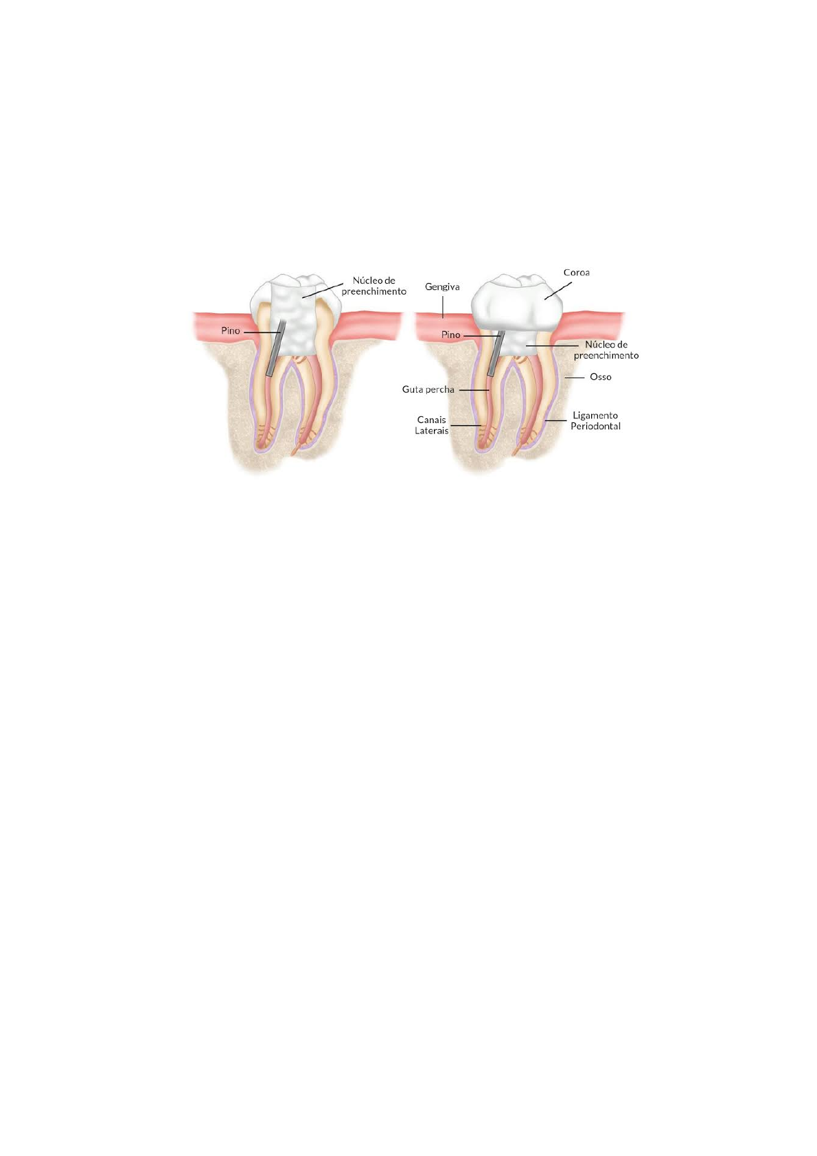 Estági� d� Clínic� integrad� : Retentore� intr� radiculare� SEMPRE QUE POSSÍVEL EVITAR TRATAMENTO ENDODÔNTICO Porque o melhor mecanismo de resistência do dente é a estrutura dental. Além de ficar mais friável após o tratamento endodôntico o preparo de pino deixa menos estrutura no dente QUAL PRINCIPAL DIFERENÇA ENTRE PINO DE FIBRA DE VIDRO CÔNICO E CILÍNDRICO ● Cônico sempre deve ser cimentado com cimento resinoso ● Cilíndrico pode ser cimentado com ionômero de vidro ○ Mais barato ○ Não tem conicidade mas tem retenção para cimentar ele com ionômero de vidro QUANTO DESOBSTRUIR DE UM CANAL ● ⅔ em relação a estrutura óssea ● Deixar no mínimo 5 mm de guta percha mas às vezes se faz necessário deixar no mínimo 3 mm CADA PINO TEM SUA INDICAÇÃO E SEU JEITO DE TRABALHAR ● Pino de carbono ○ Bom ○ Mais resistente ○ Porém é escuro prejudicando áreas estéticas ● Pino de fibra ○ Cônico ● Pinos metálicos ○ Sus e plano de saúde SILANO = AGENTE DE UNIÃO E SÓ SE LIGA A VIDROS E A FIBRAS COMO EVITAR TRATAMENTO ENDODÔNTICO ? ● CONHECER DESGASTE CORRETO ○ Desgaste mínimo varia de acordo com material ○ Coroa metálica - 0.5 ○ Porcelana - 1.0 ○ Metalomecânica - 1.5 ○ Esse controle se dá pelo diâmetro das brocas ○ Cúspides VIPS necessitam de maior material na região logo maior desgaste para evitar o sobrecontorno ○ Saber diâmetro de broca e as áreas que necessitam de maior material restaurador ● REFRIGERAÇÃO ADEQUADA ○ Toda vez o preparo deve estar acompanhando de irrigação ● MÉTODOS ADICIONAIS DE RETENÇÃO A DENTINA ○ Aumento do preparo se possível ○ Para aumentar a retenção das coroas pôde-se ■ Confecção de canaletas - metal, metalomecânica e zircônia ● INDICAÇÕES PROTÉTICAS CORRETAS PARA CADA CASO (IMPLANTES) ○ Avaliar quando dente está viável ou não ■ Avaliar periodonto ■ Canal ■ Necessidade de retratamento ● MOVIMENTAÇÕES ORTODÔNTICAS ○ Muitas vezes é melhor instruir um dente do que partir para a prótese em dentes que extruiram ZIRCÔNIA NÃO TEM ADESÃO AO DENTE SENDO NECESSÁRIA RETENÇÃO MECÂNICA DESGASTE ● O dente nunca deve ser tratado com a broca paralela visto que o dente possui inclinações ○ Alguns tem 3 e 2 ○ As inclinações devem ser reproduzidas ○ Quanto mais desgasta mais perto fica TÉCNICA DA SILHUETA ● Preparar apenas metade de um dente para depois comparar a outra parte ● Nas faces proximais tem menor desgaste do que vestibular por não precisar de tanta estrutura já que a face vestibular precisa da estética para encobrir metal e cerâmica por exemplo ● Cada material exige um término cervical diferente ○ Metal - chanferete ○ Metalomecânica - chanfro ○ Porcelanas - ombro, ombro biselado ou chanfro ● Preparo para metalomecânica antes geralmente era necessário fazer término subgengival por conta do coping metálico contudo hoje em dia com as cerâmicas não é tão preciso ● Preparos para ponte ○ Antes : tratamento de canal ○ Atualmente: preparo correto minimiza a necessidade de canal ● Preparo MOD ou coroa total ○ Desgaste maior em extensão : coroa total ○ Desgaste maior em profundidade : preparo MOD por se tratar de um nível ocluso cervical MÉTODOS PARA EVITAR UM CANAL ● Retenção mecânica PINO NÃO TEM FUNÇÃO NENHUMA DE RESISTÊNCIA NO DENTE ● Só auxilia na retenção do futuro trabalho protético ● Pode ser um trabalho (como os de resina) ou um trabalho indireto (laboratório) ● Proporcionar retenção ao material restaurador POR QUE DEVEMOS EVITAR O TRATAMENTO ENDODÔNTICO RADICAL ● Altera as características físico-mecânicas do dente ● Tem perda de estrutura ● Modifica as características estéticas da dentina e do esmalte ○ Dentes escurecem A DESIDRATAÇÃO É RESPONSÁVEL POR UMA DIMINUIÇÃO DE 3% A 14% DA RESISTÊNCIA DO DENTE ● Pino diminui mais ainda a resistência desse dente ● Preparo MOD reduz 63% a resistência do dente à fratura pois há remoção da dentina visto que ela consiste em o maior fator de resistência do dente O REMANESCENTE DENTÁRIO QUE VAI INDICAR O MELHOR TRATAMENTO PINOS PINOS METÁLICOS ● Pode fraturar ○ Mas muitas vezes não se trata da falha do pino e sim da oclusão ■ Logo dentes com pinos exigem oclusão perfeita ○ Dentes foram feitos para aguentar o vetor vertical ou seja força axial ■ Dentes posteriores são os melhores dentes para receber pinos ○ Uma oclusão errada em dentes anteriores por exemplo ■ Pino de fibra de vidro - fratura o pino ● Acaba perdendo o dente porque ao retirar corre o risco de perfurar a raiz ■ Pino metálico - fatura a raiz ○ Muitas vezes as fraturas de pino demoram a dar sinal ■ Tecido vai reagindo perdendo a tábua óssea ■ Essa perda induz a problemas de reabilitação como dificuldade de implantes FALHAS ● Perfurações ○ Difícil de diagnosticar ● Fratura do pino de fibra ○ Na maioria das vezes essas falhas acontecem por oclusão COMO SABER INDICAR O MELHOR PINO Observar aspectos como : ● Férula (colarinho de dentina) ou quantidade de dentina remanescente ○ Se o paciente só tem raiz o pino de fibra de vidro estaria contra indicado melhor seria de metal ● Pacientes nos quais são necessários mudar a angulação da coroa ou seja projetar a coroa são indicados metais - fibra de vidro segue o alinhamento da raiz INDICAÇÃO DE PINO DE FIBRA DE VIDRO - TEM QUE TER FÉRULA E NO METÁLICO SÓ A RAIZ PINO METÁLICO NÃO TEM ADESÃO ZIRCÔNIA E METAL AGEM DA MESMA FORMA MAS A ZIRCÔNIA É BRANCA FÉRULA - COLARINHO DE DENTINA RETENTORES INTRA RADICULARES - SÃO DISPOSITIVOS DE SUPORTE INTRA-RADICULAR UTILIZADOS PARA REPOR ESTRUTURAS CORONÁRIAS PERDIDAS, VISANDO A SUSTENTAÇÃO DE UMA RESTAURAÇÃO OU PRÓTESE. "São reconstruções da porção coronária, ausente devido a inúmeros fatores (cárie, trauma, restaurações, acesso endodôntico), com materiais d
